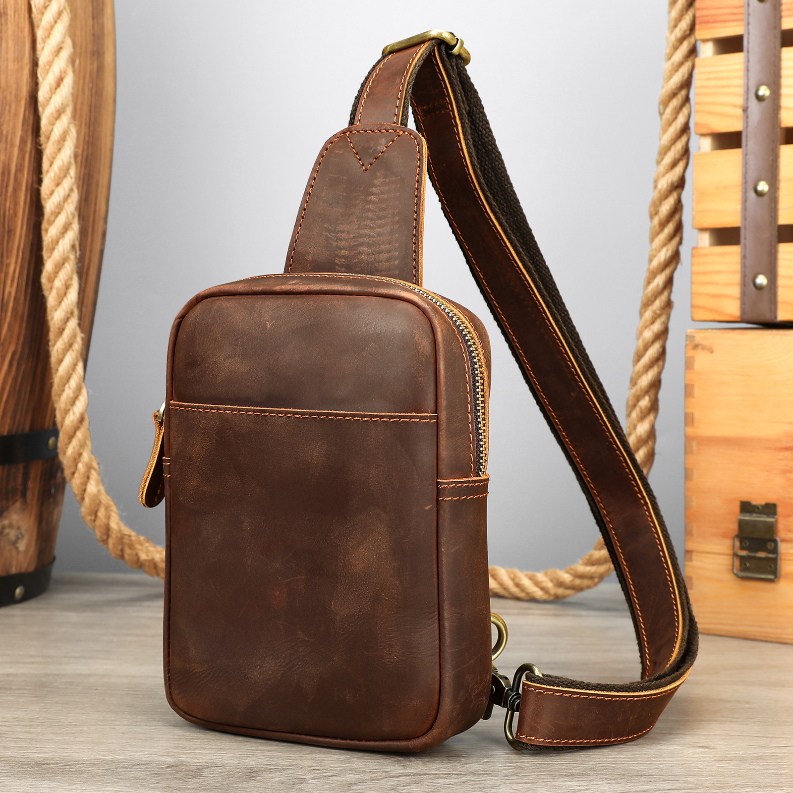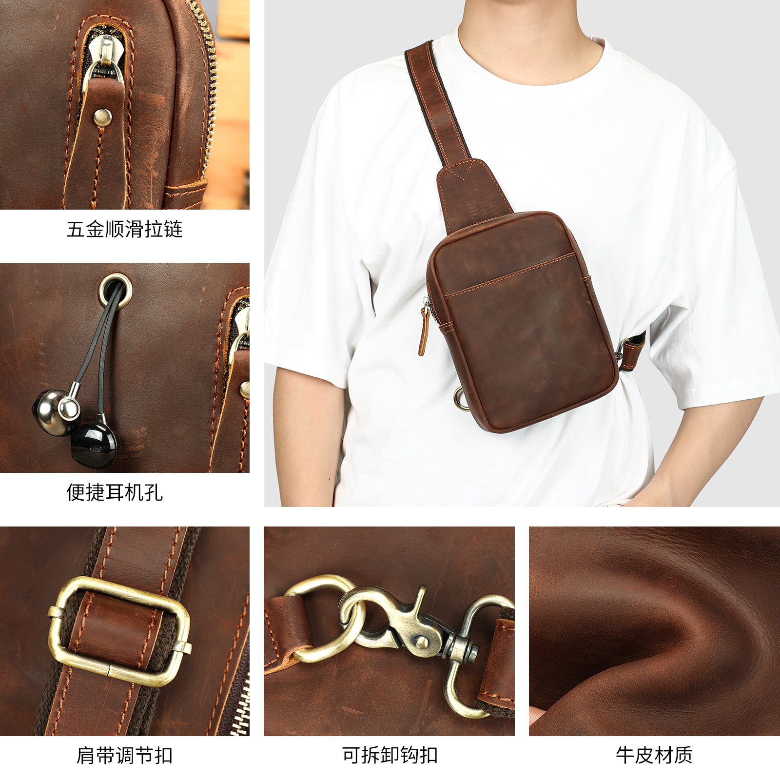 真皮复古运动胸前包日常休闲便携疯马皮斜挎包男士出行小背包胸包