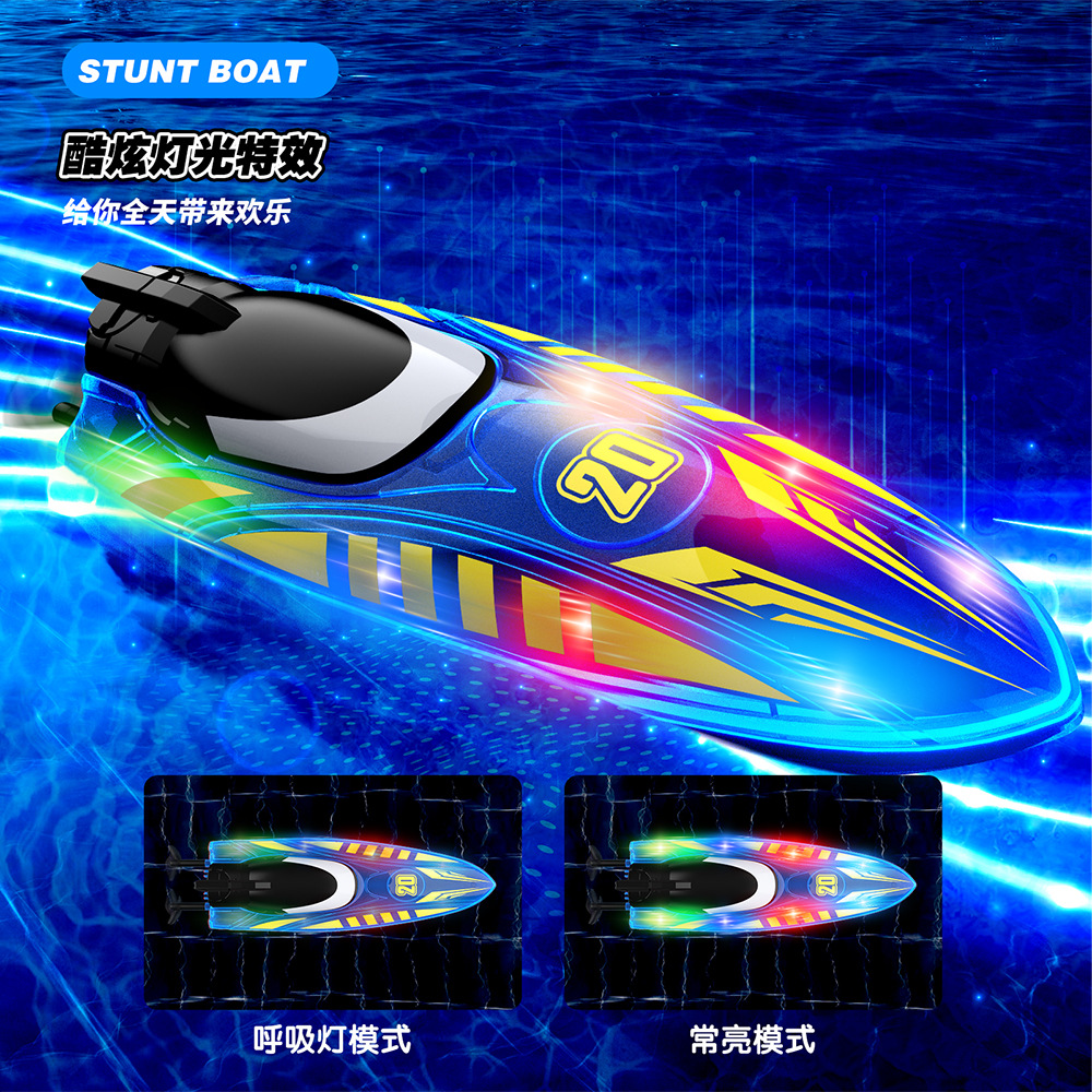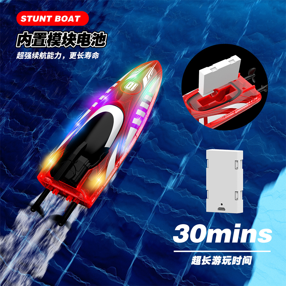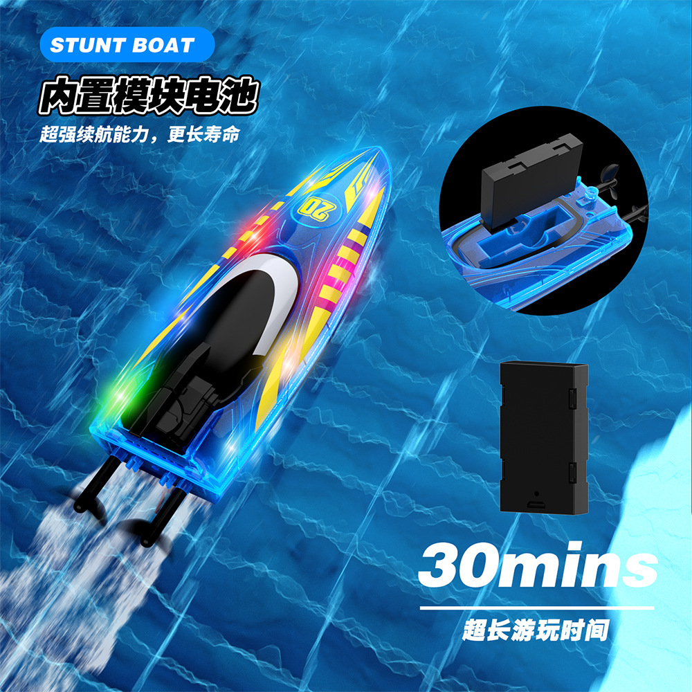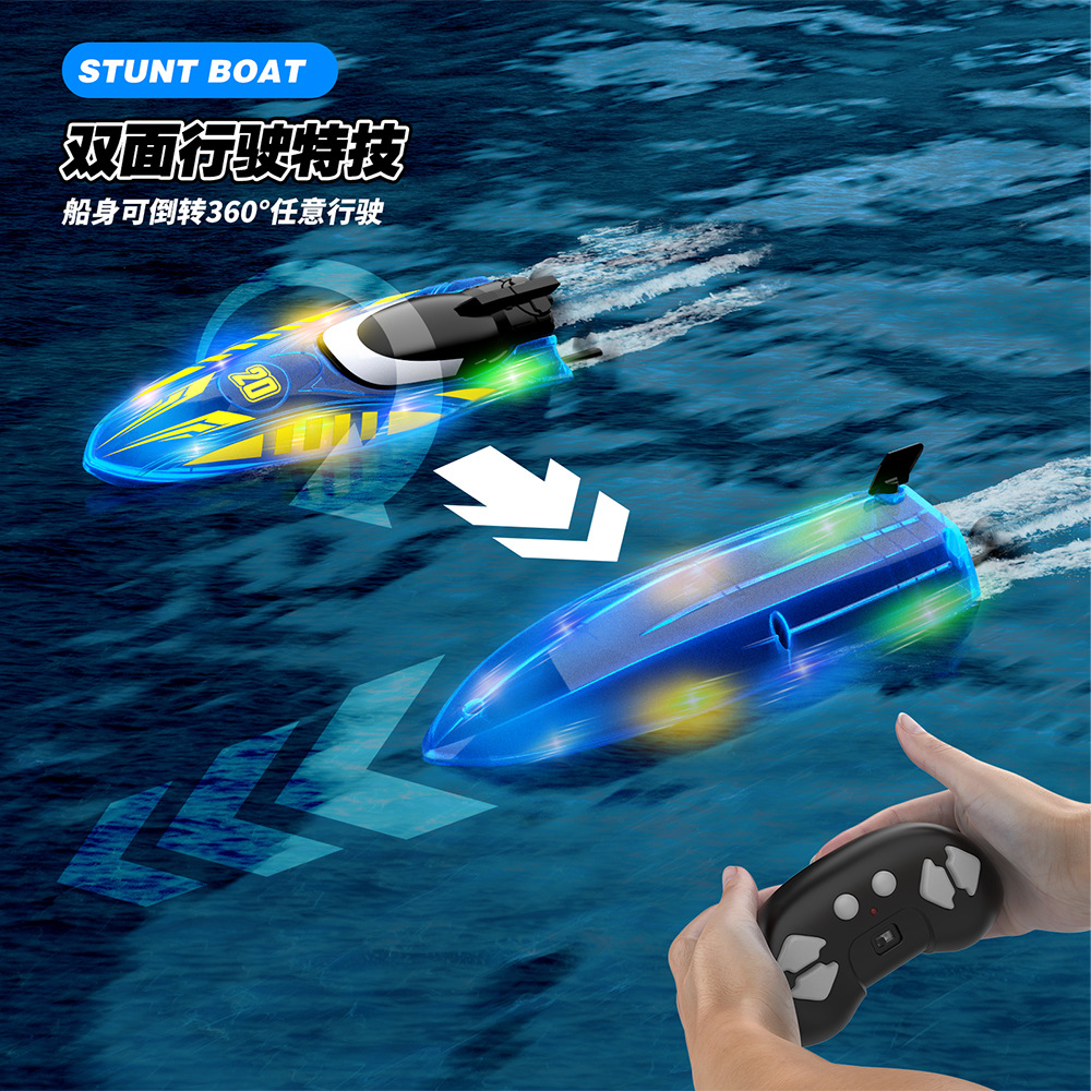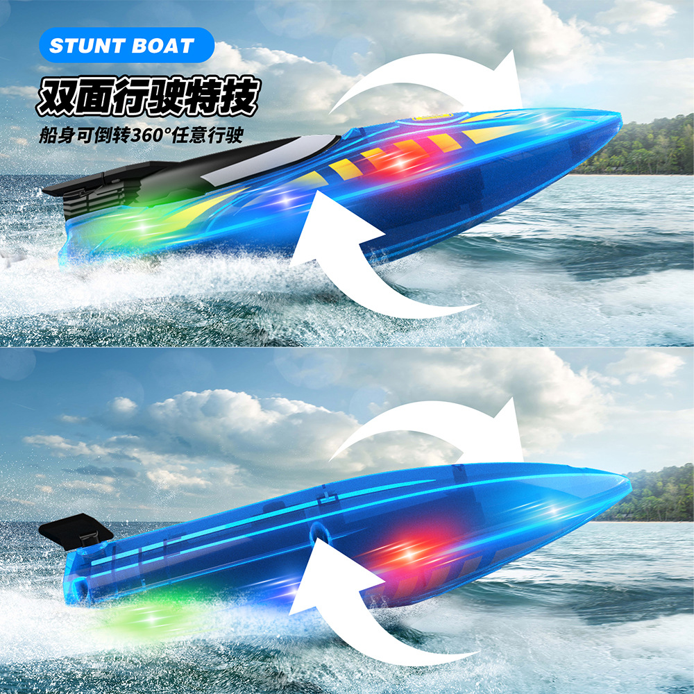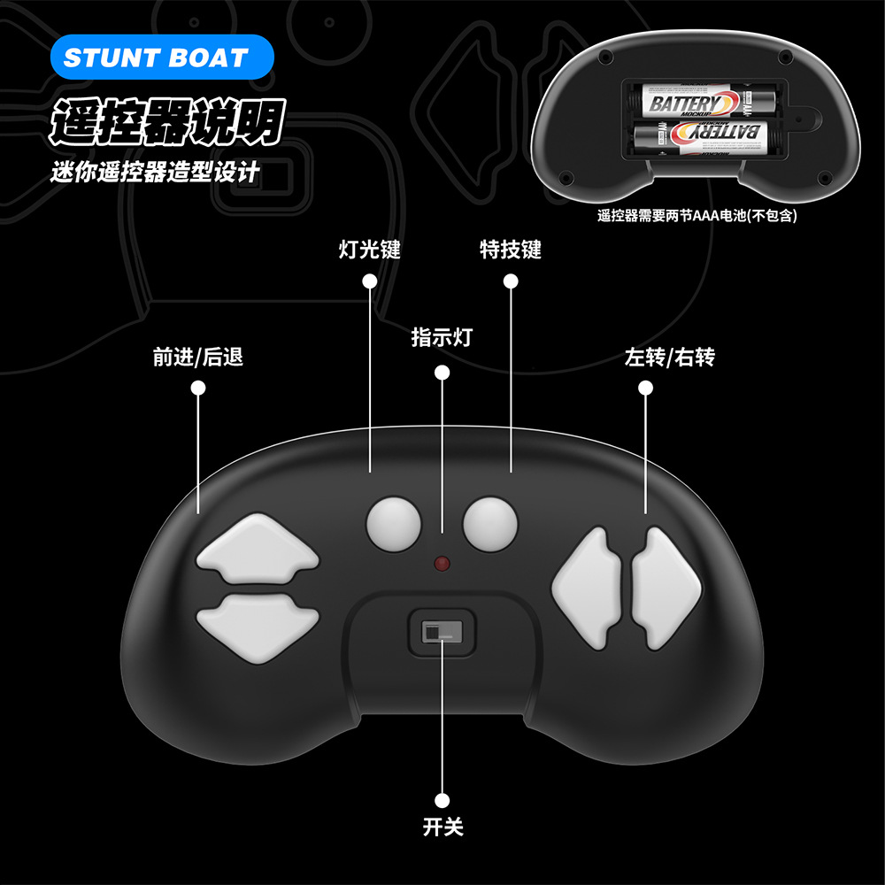 2.4G遥控,前进/后退/左转/右转,双面行驶,特技行驶,离水感应,低电提醒,酷炫灯光,速度切换.