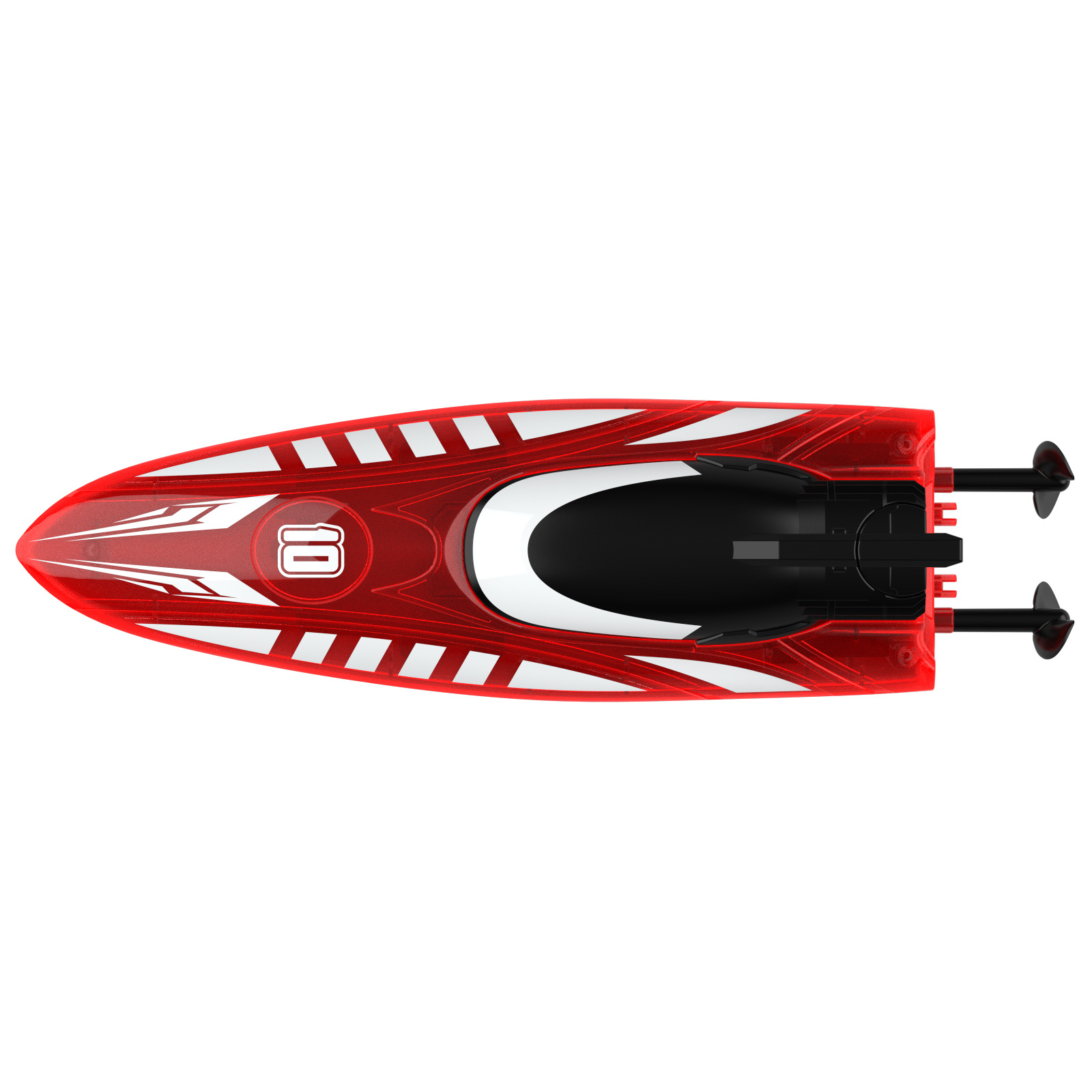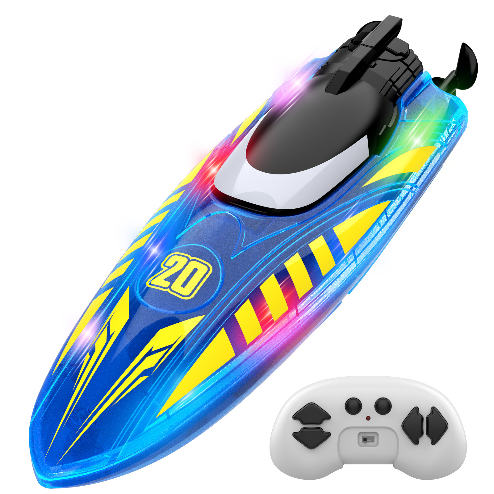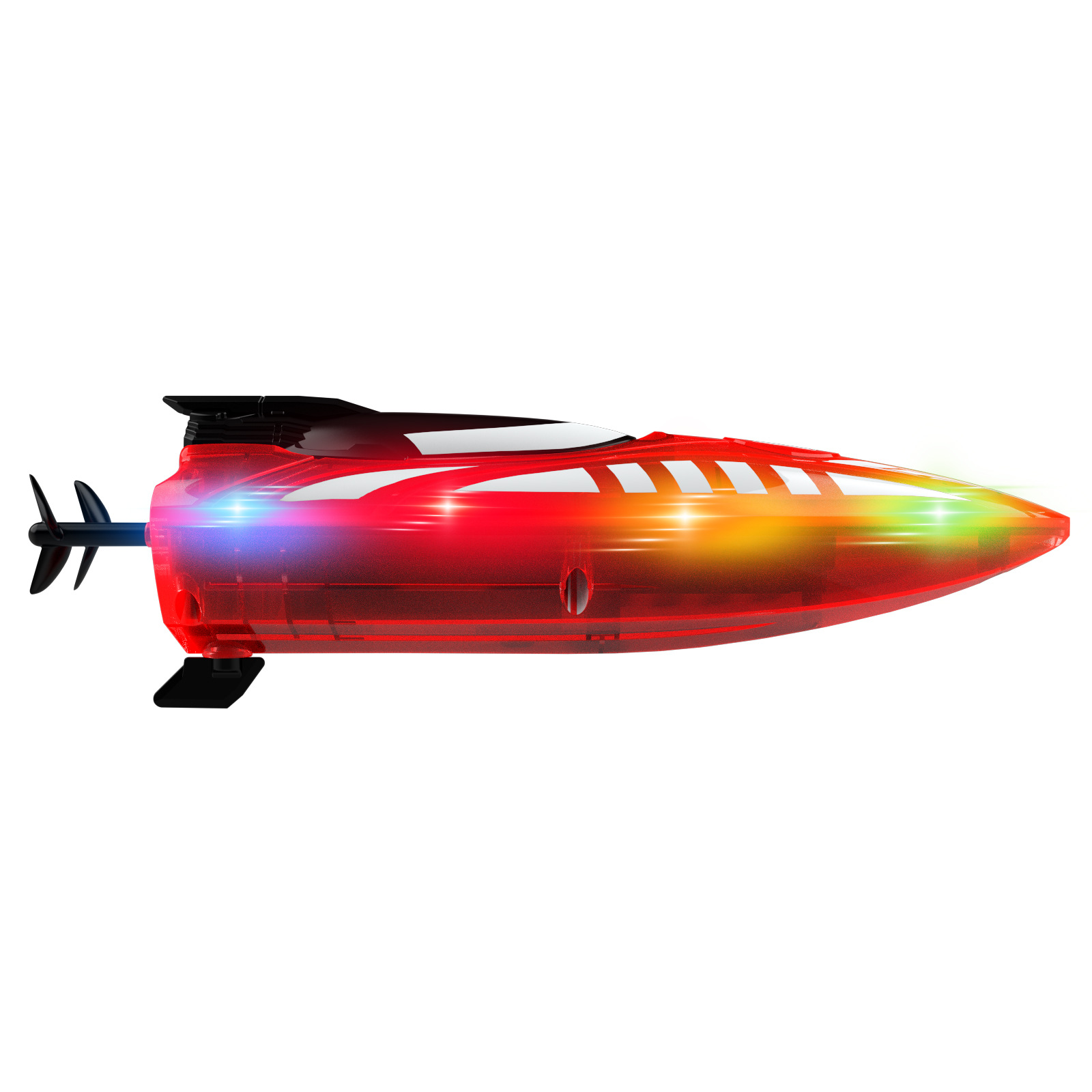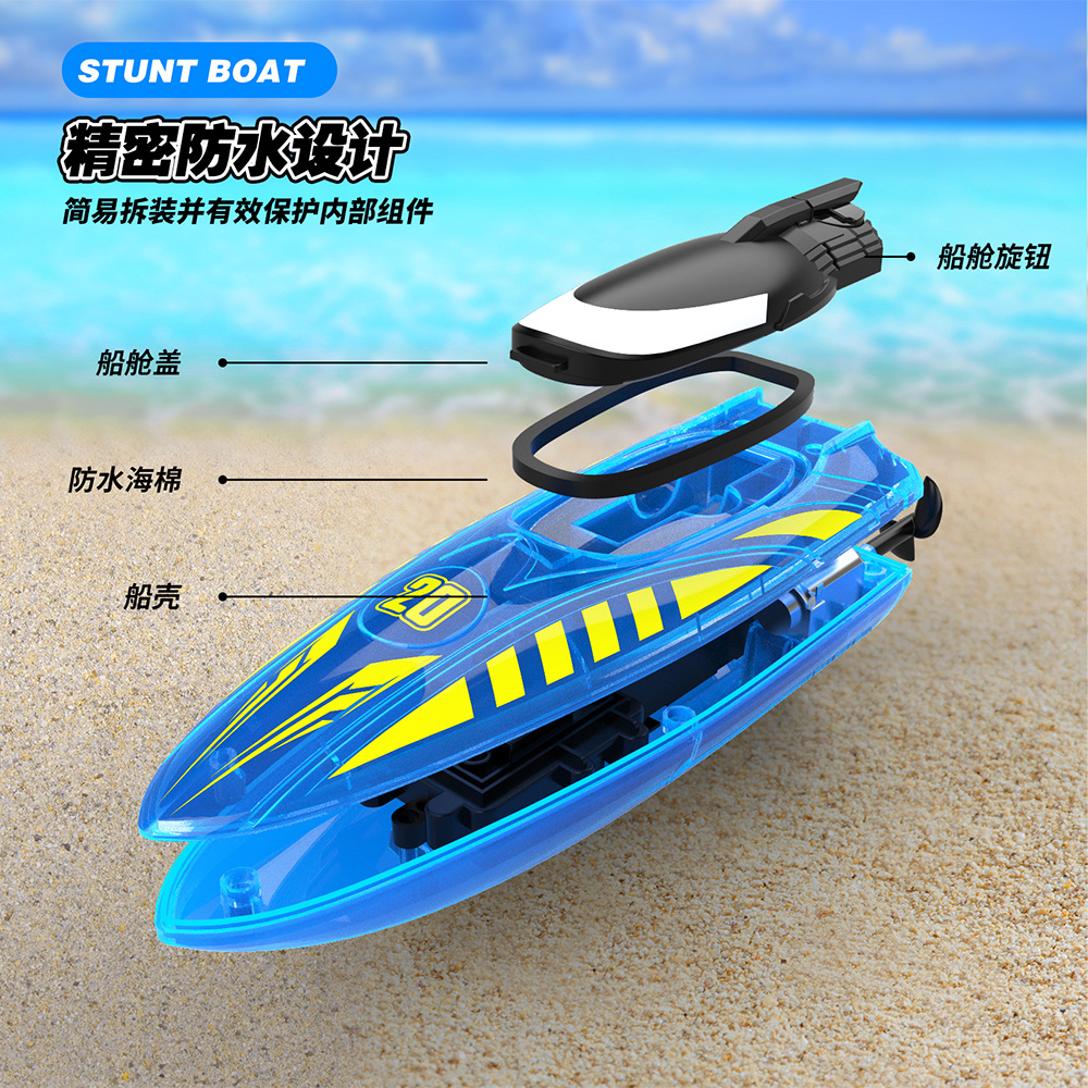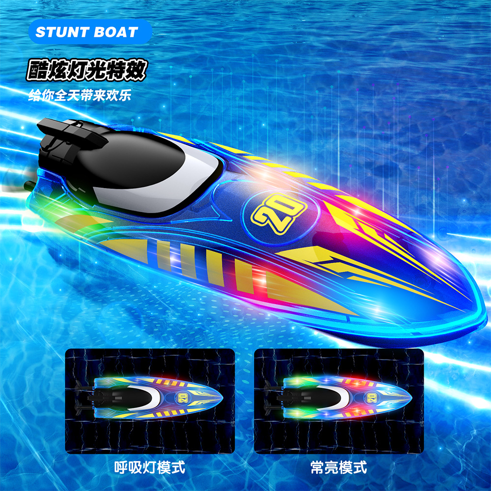 2.4G遥控,前进/后退/左转/右转,双面行驶,特技行驶,离水感应,低电提醒,酷炫灯光,速度切换.