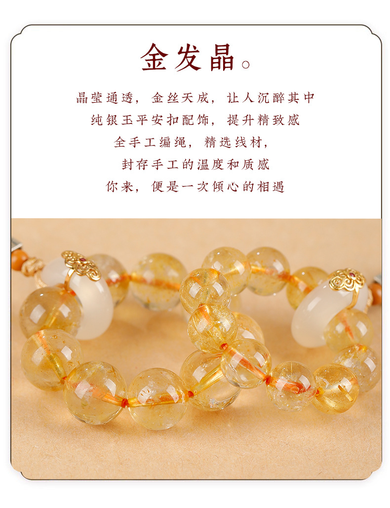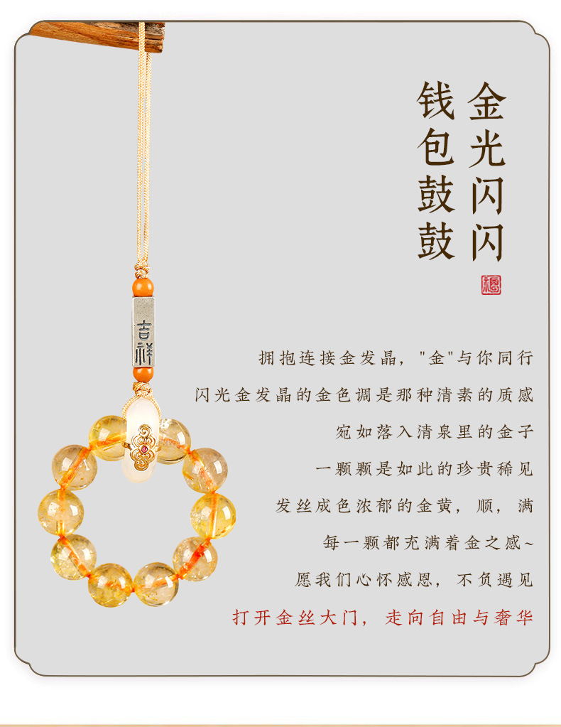 材质: 天然石 处理工艺: 半手工 品牌: 庆雅珠宝 流行元素: 图腾,祥云,福字,水波纹,吉祥图案,平安 款式: 钥匙挂饰 风格: 中国风 上市年份/季节: 2024年春季 产地: 金华 货号: AL-826 颜色: 金发晶手捻手机链 型号: 8mm,10mm 是否跨境出口专供货源: 否 主要下游平台: 京东,ebay,PDD,亚马逊,wish 有可授权的自有品牌: 是 图案: 星座/生肖 风格分类: 文艺复古 流行元素分类: 民族/国风 重量: 0.005 kg/件