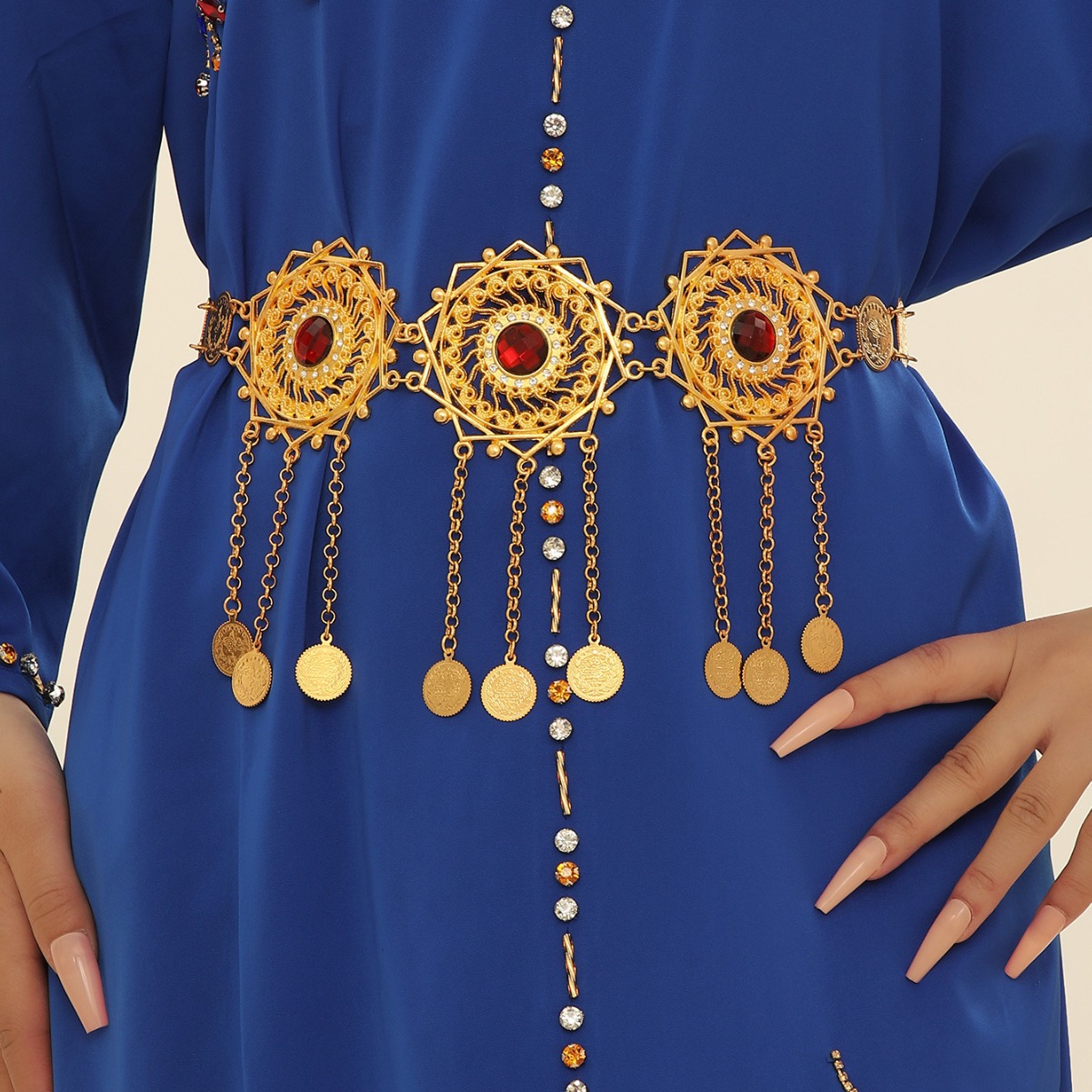 跨境新品女士镶钻金属腰链 复古镂空设计扣腰链腰带大衣礼服腰封 English | 投诉