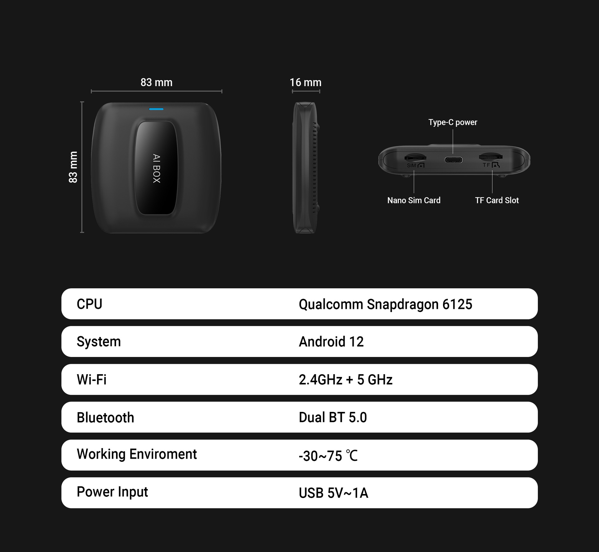 品牌: OTTOCAST 操作系统: Linux 适合车型: 通用 屏幕尺寸: 无屏幕 型号: CA481 材质: PC,ABS 运行内存: 4GB 分辨率: 1920x1080 产地: 中国广东深圳 加工定制: 是 CPU类型: 八核 机身内存: 64GB 重量: 219g 接口: USB Type-C 外观尺寸: 83*83*16mm 显卡: 无 货号: CA481 规格: CA481 4+64 颜色分类: 黑色 装箱数: 120 重量: 1.5 kg/套