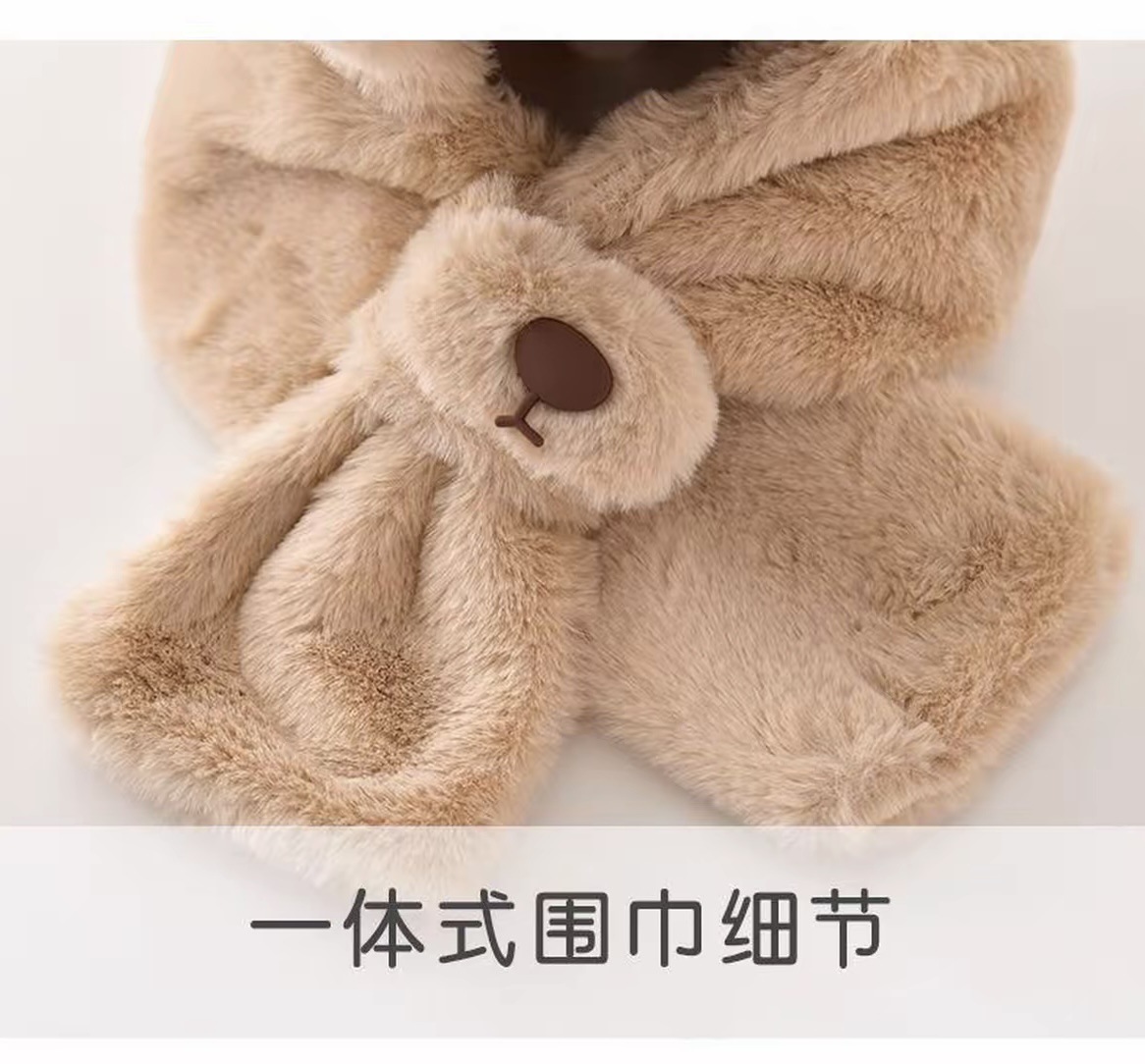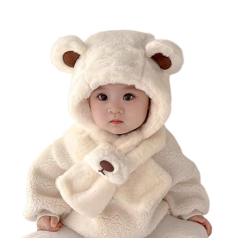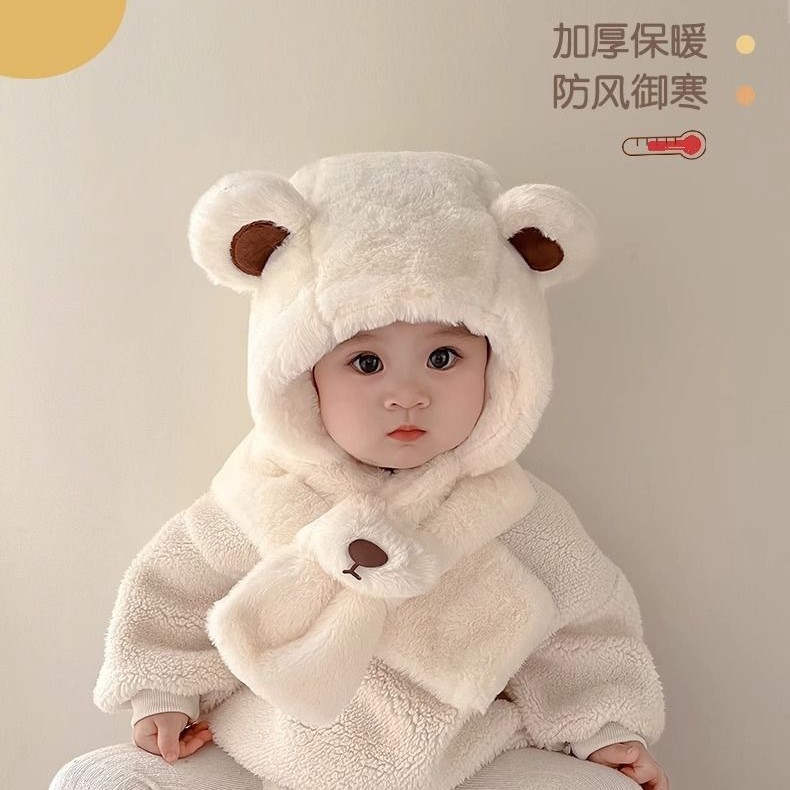 宝宝帽子冬季男孩女童围巾一体小熊毛绒帽卡通儿童加绒加厚防风帽