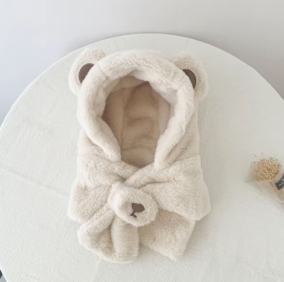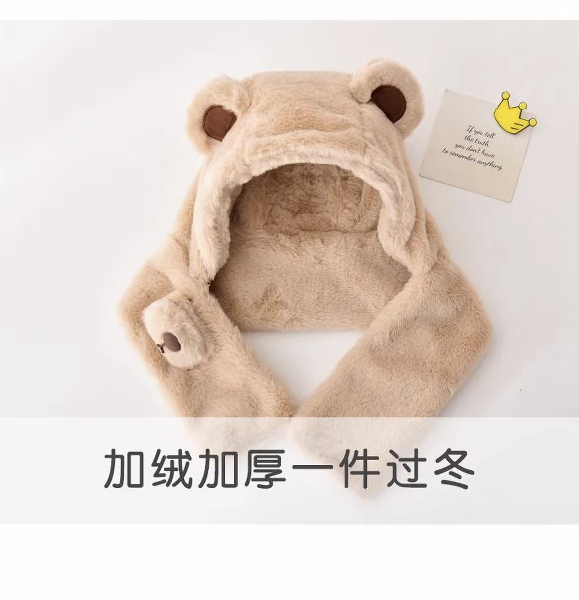 宝宝帽子冬季男孩女童围巾一体小熊毛绒帽卡通儿童加绒加厚防风帽 投诉