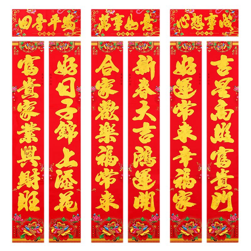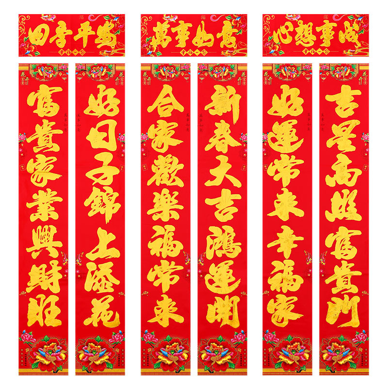 默认金字黑字对联尺寸: 1.1米:实长 90*15cm 1.3米:实长 110*18cm 1.6米:实长 136*19cm 2.2米:实长 160*24cm 3米: 实长 180*26cm 4米:实长 199cm*28cm 5米; 实长 214*30cm 6米:实长 229*31cm 8米:实长 250*34cm