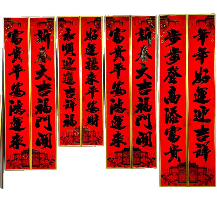 默认金字黑字对联尺寸: 1.1米:实长 90*15cm 1.3米:实长 110*18cm 1.6米:实长 136*19cm 2.2米:实长 160*24cm 3米: 实长 180*26cm 4米:实长 199cm*28cm 5米; 实长 214*30cm 6米:实长 229*31cm 8米:实长 250*34cm