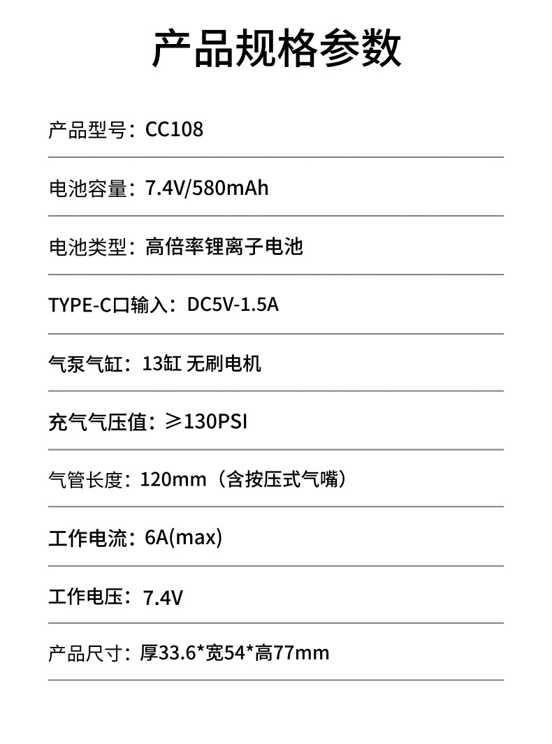 类型: 单缸 功率: 80W以下 附加功能: 胎压表 材质: ABS 电压: 7.4V 电源型式: Type-C充电 显示类型: 数显 尺寸: 77mm*54mm*33.6mm 电流: 8A 电源线长: 50CM 风量: 260 规格: (540mah)标配件版 净重: 135g 适用范围: 轮胎充气 外形尺寸: 77mm*54mm*33.6mm 型号: 充气泵 压力: 4-150psi 重量: 270 主要适用范围: 各类充气产品 装箱数: 60 重量: 0.15 kg/个