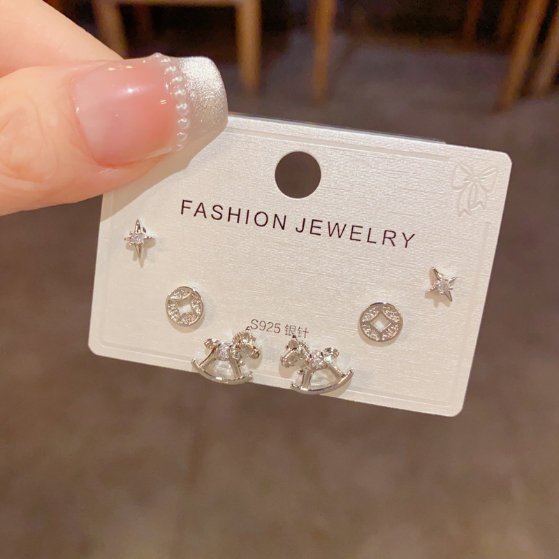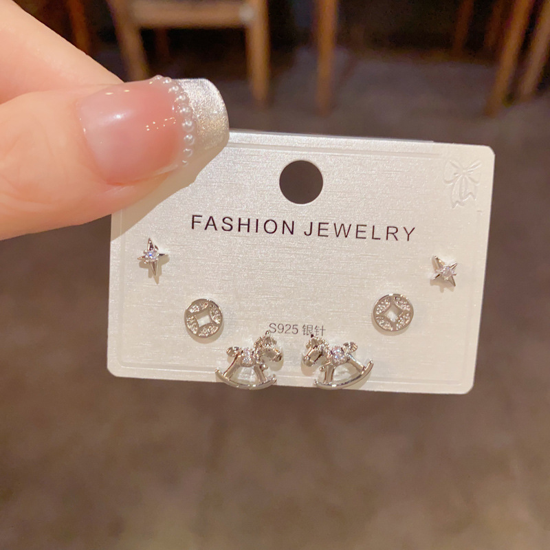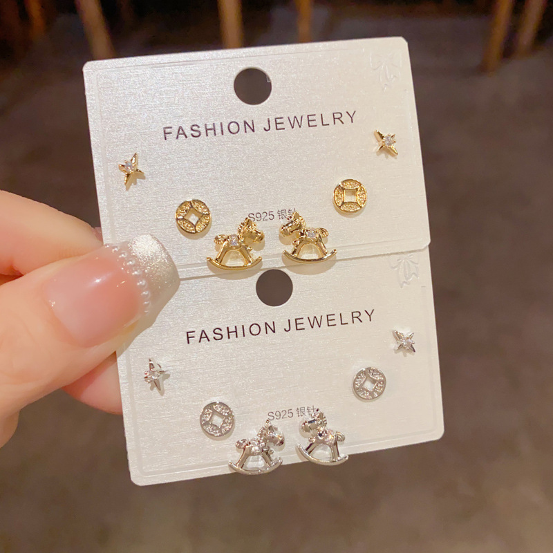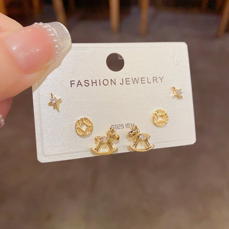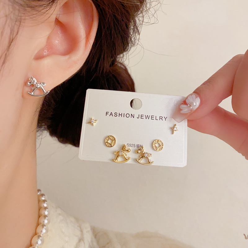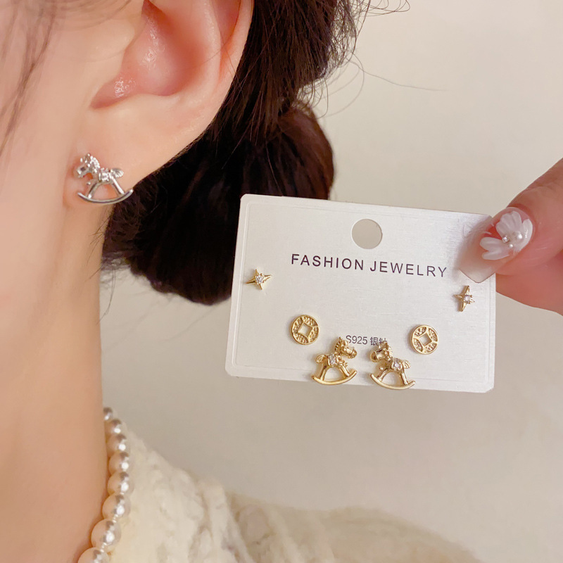 2026年新款时尚简约木马铜钱三件套耳钉精致轻奢百搭小巧耳环批发 English | 投诉