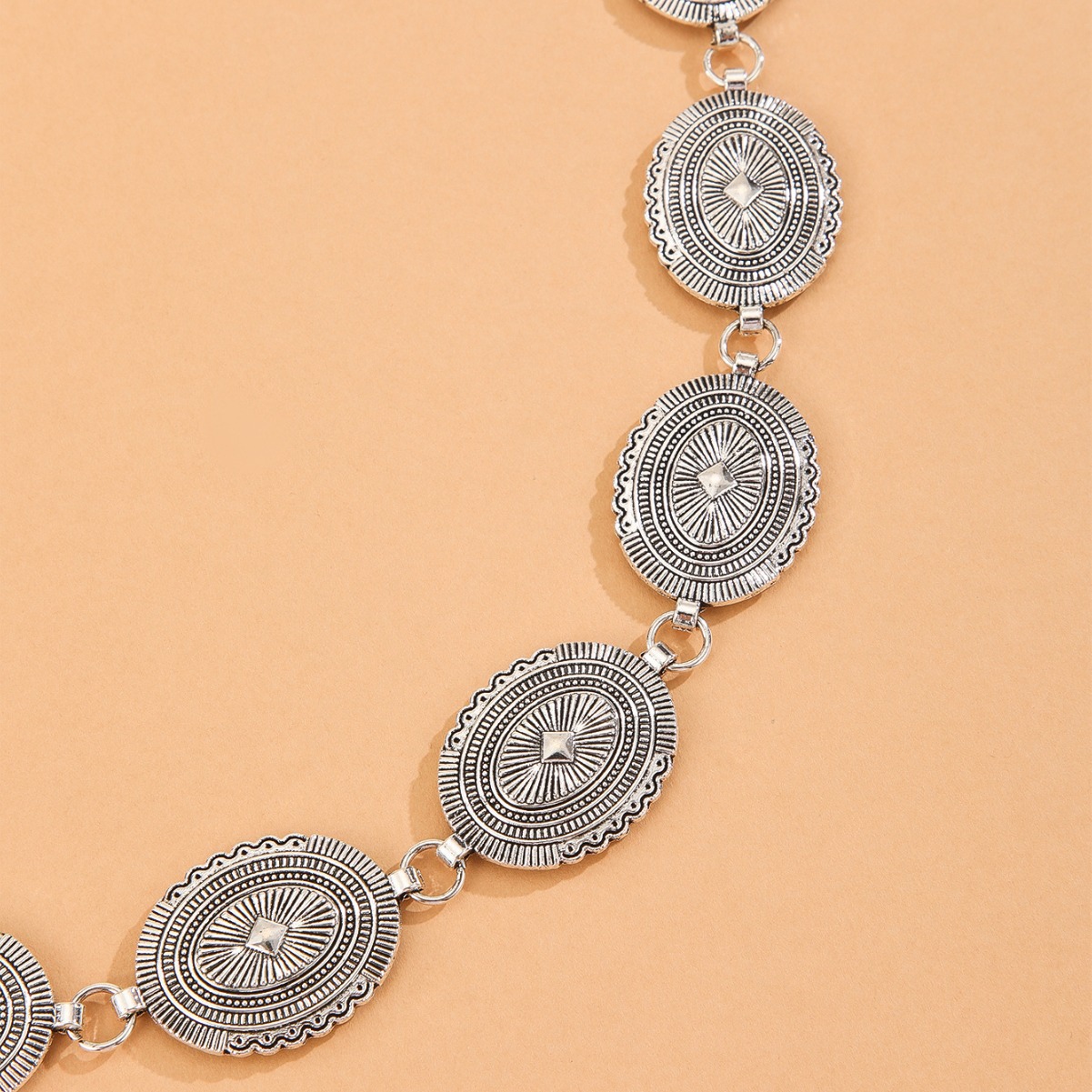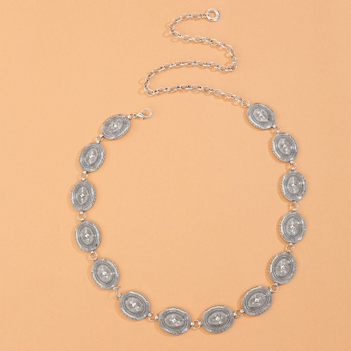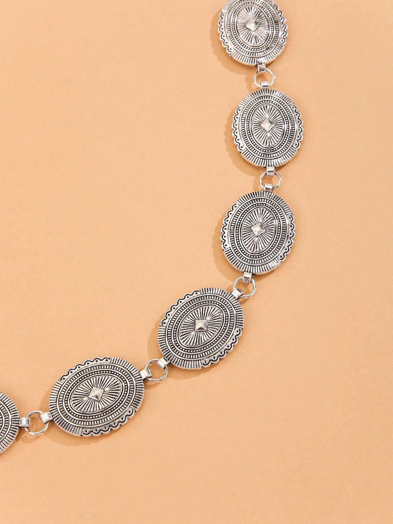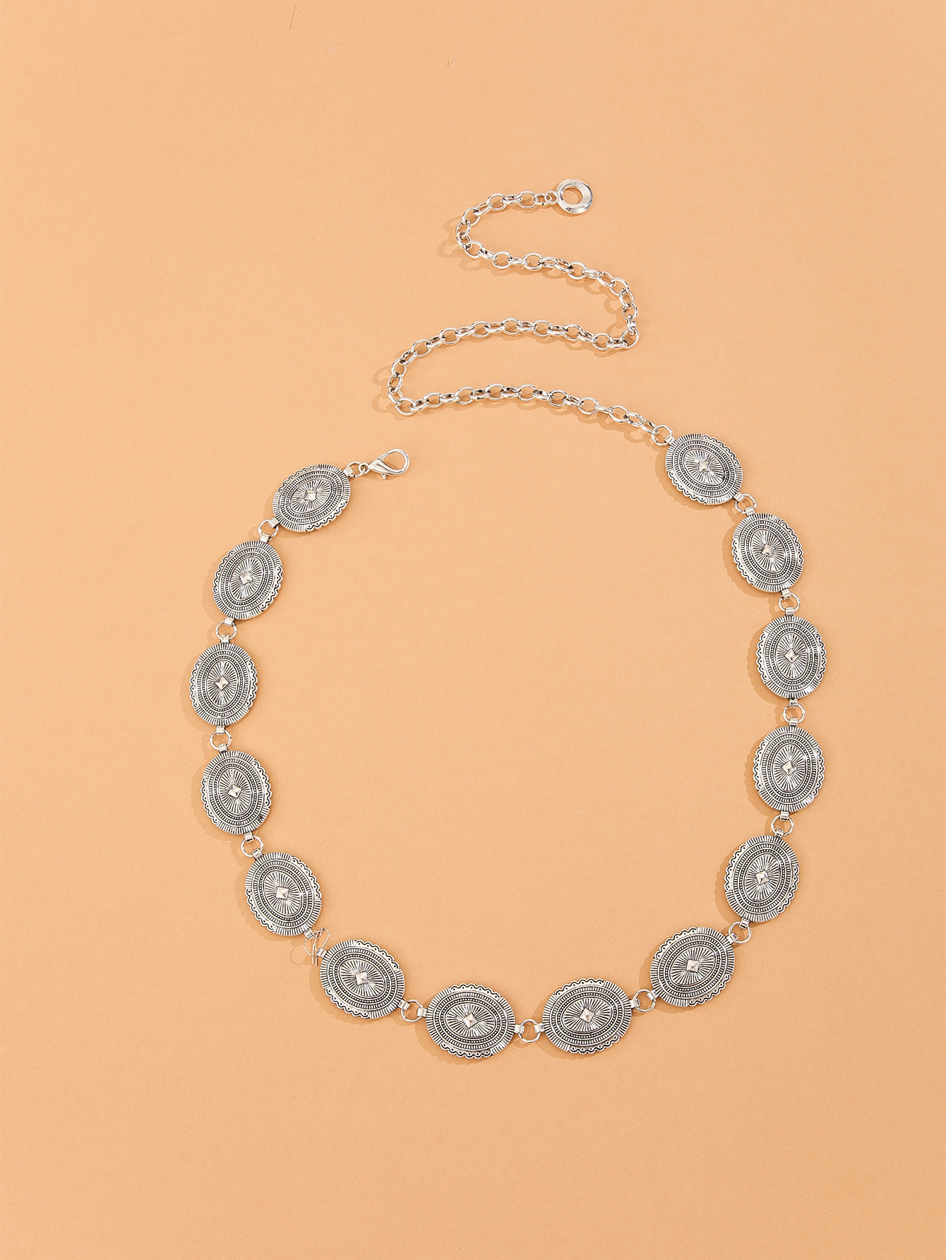 跨境热卖镂空腰链西部风金属链条椭圆花纹身体链多层腰链收腰腰带 English | 投诉