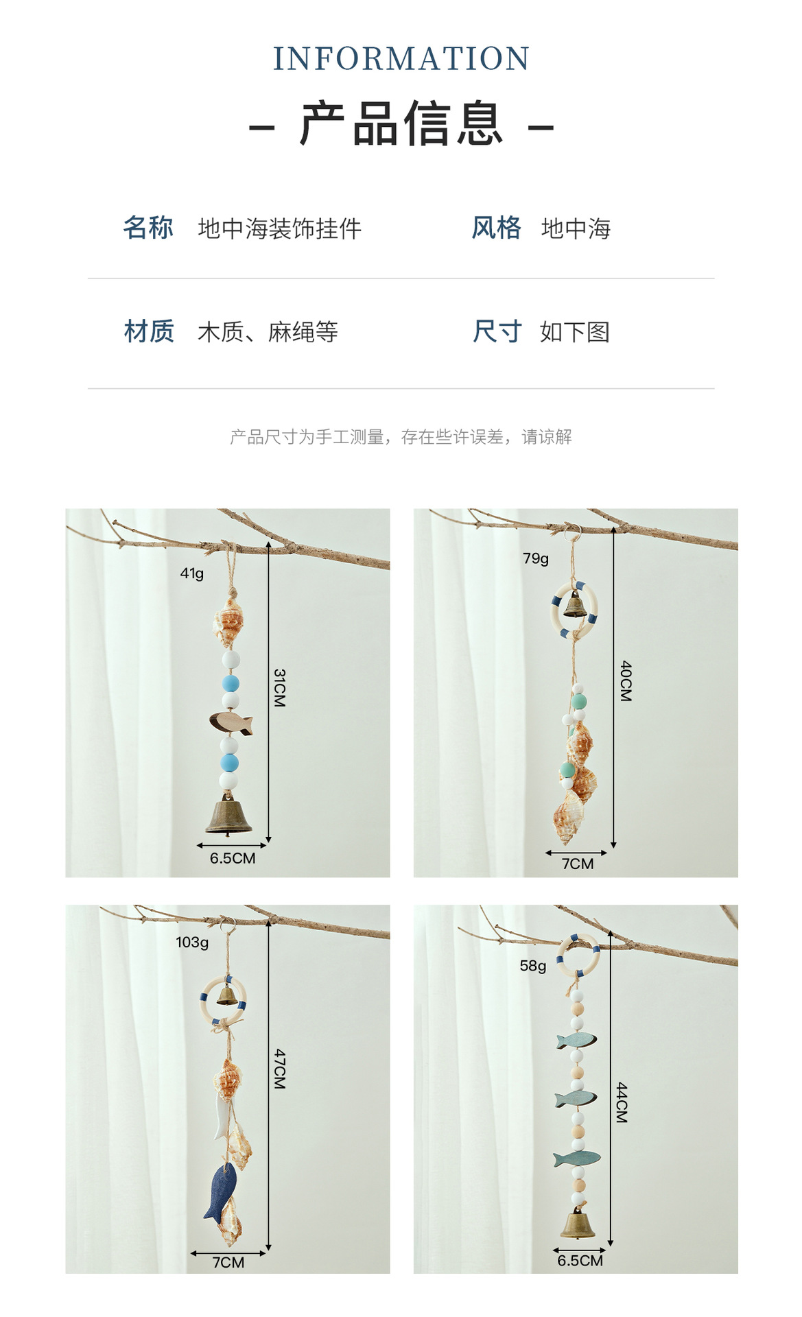 材质: 木 类别: 壁挂 风格: 地中海 产地: 浙江台州 规格: 海螺一个鱼铃铛,救生圈 3鱼铃铛挂件,救 包装: OPP袋封口包装 是否进口: 否 货号: 厂家直供定制定做跨境 主要下游平台: ebay,亚马逊,速卖通,独立站,LAZ 主要销售地区: 欧洲,南美,东南亚,北美,中东,其他 是否跨境出口专供货源: 是 空间: 客厅,餐厅,玄关,阳台,商用场所,其他 重量: 0.1 kg/件