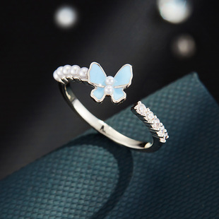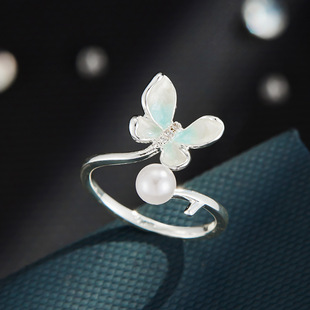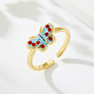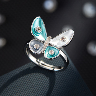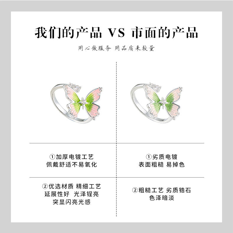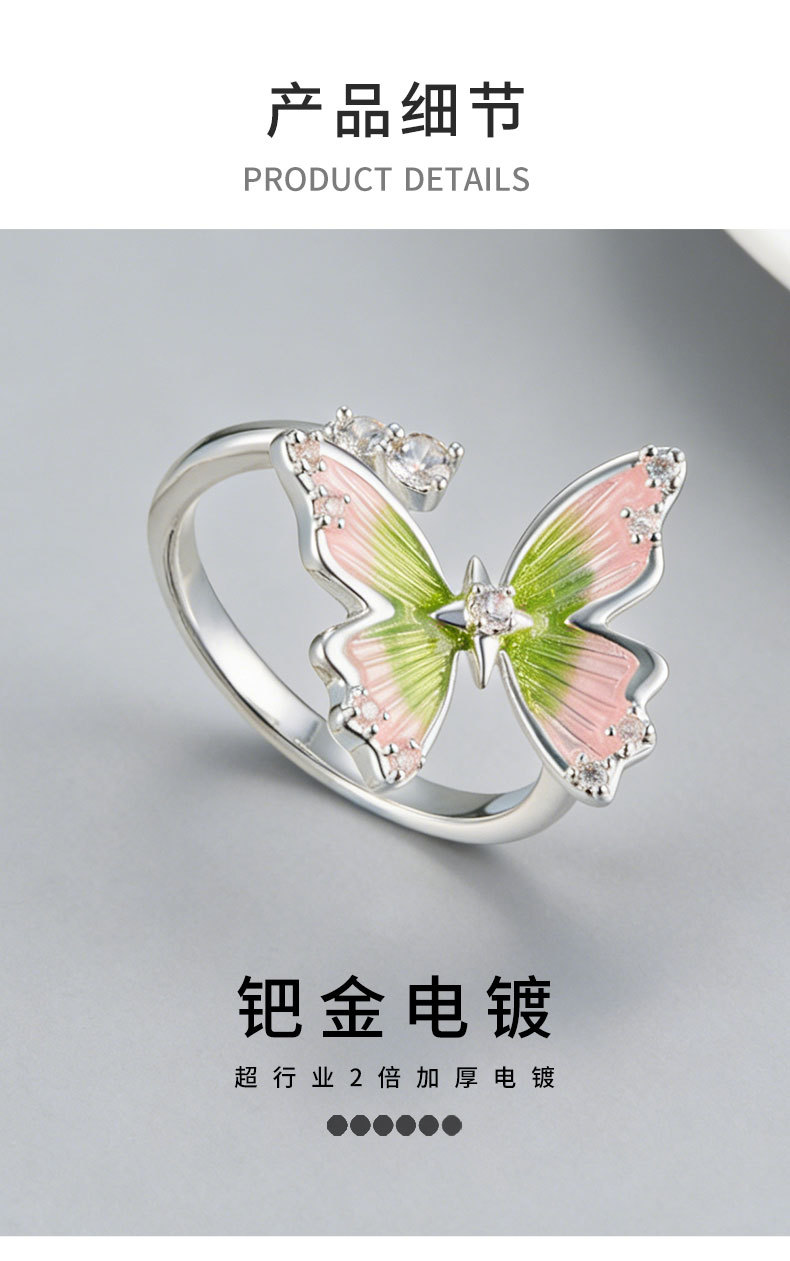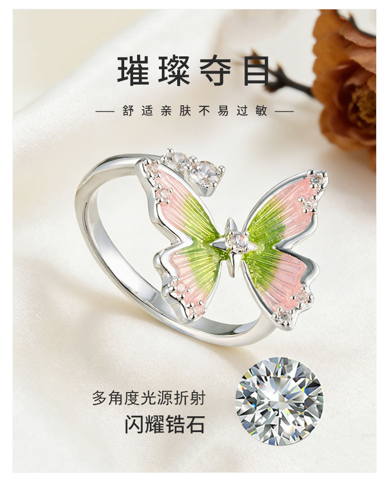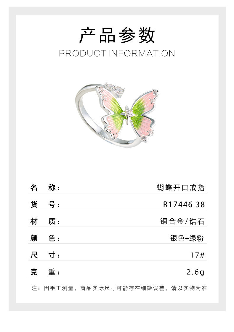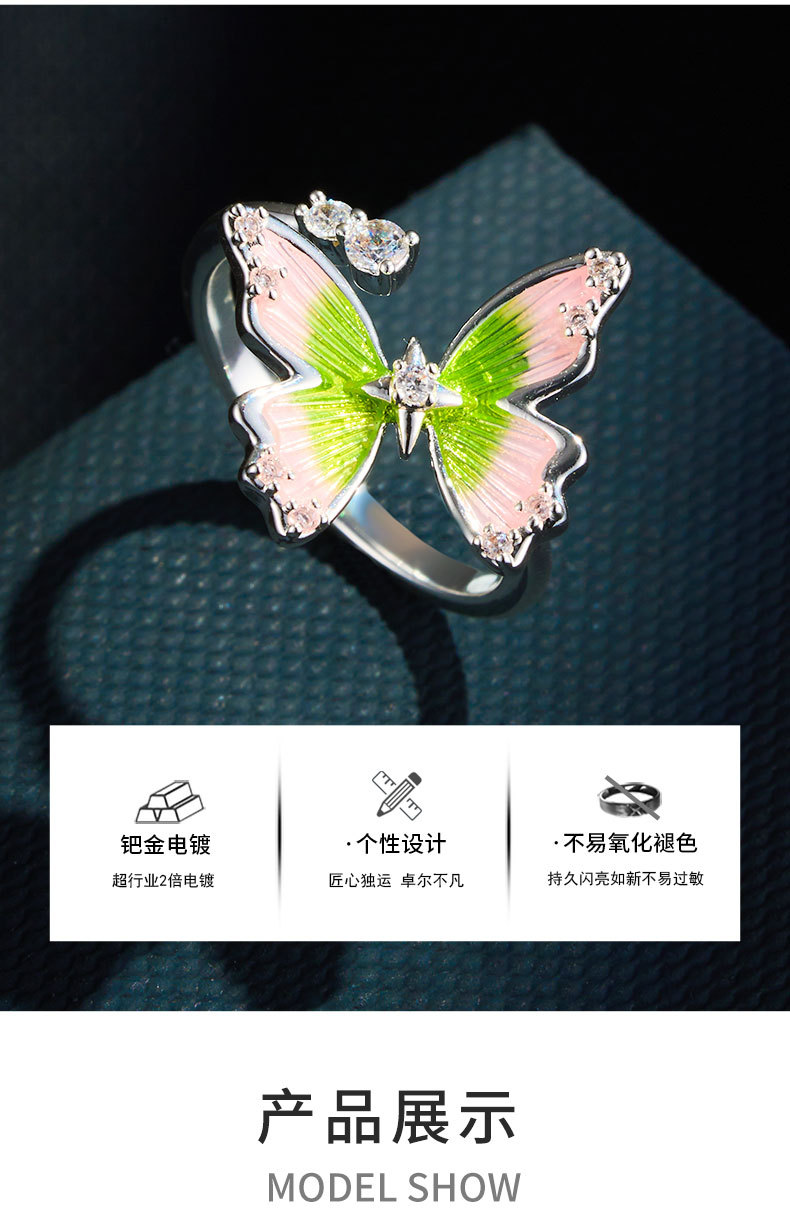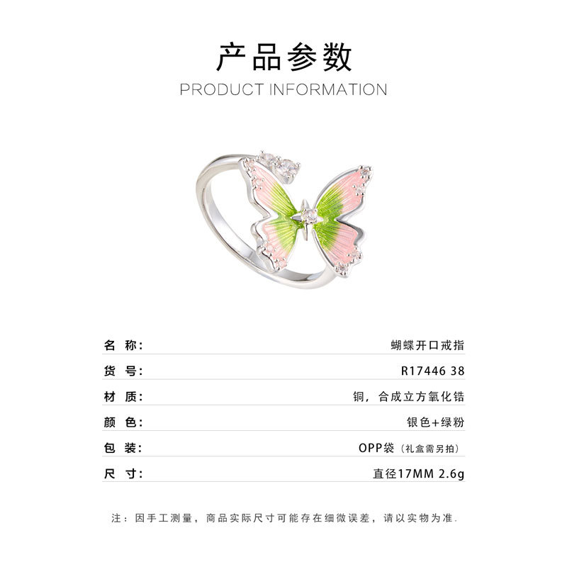 甜美森系珐琅滴油绿粉渐变蝴蝶开口戒指铜合金镶锆是可调节指环圈 投诉