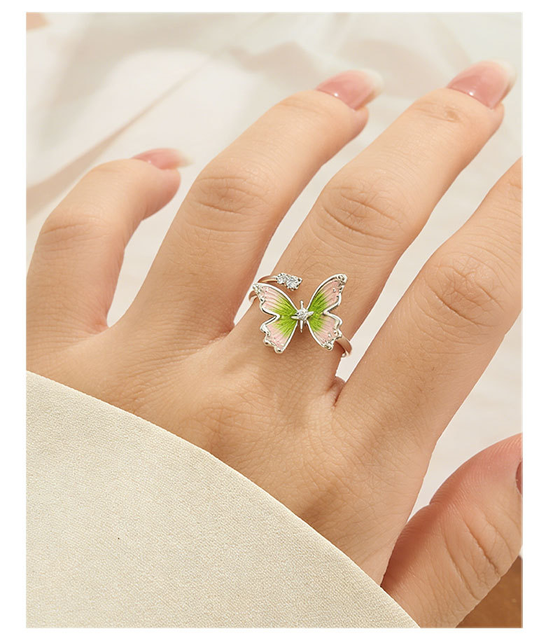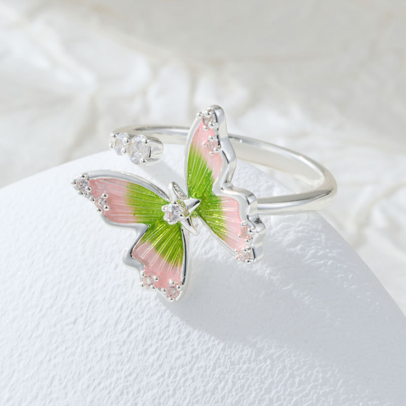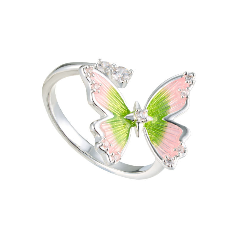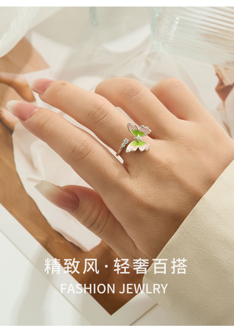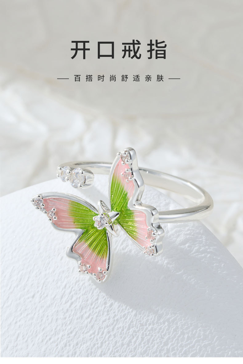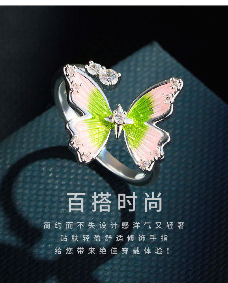 甜美森系珐琅滴油绿粉渐变蝴蝶开口戒指铜合金镶锆是可调节指环圈