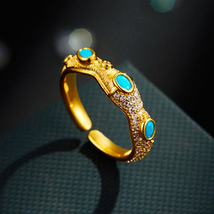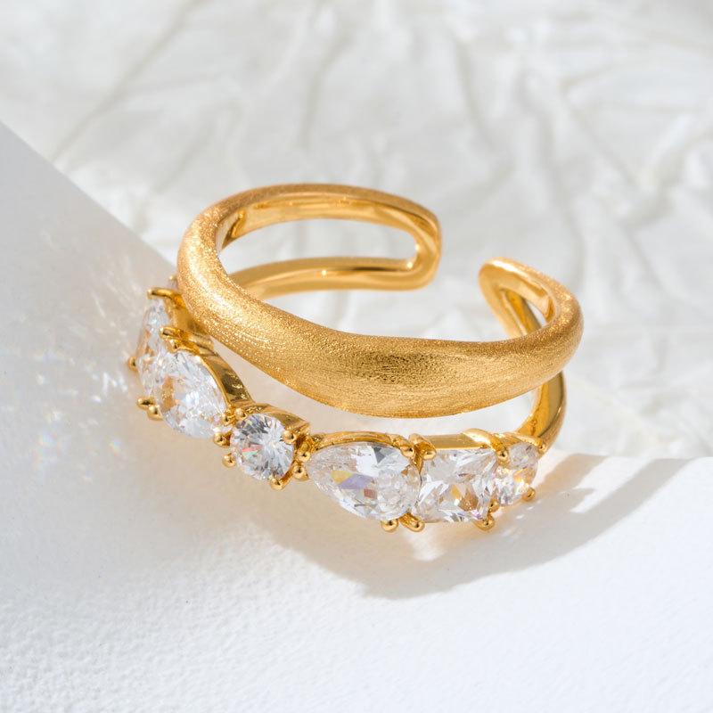 轻奢高级感双排金色拉丝开口戒指铜合金真金电镀镶锆石可调节指环