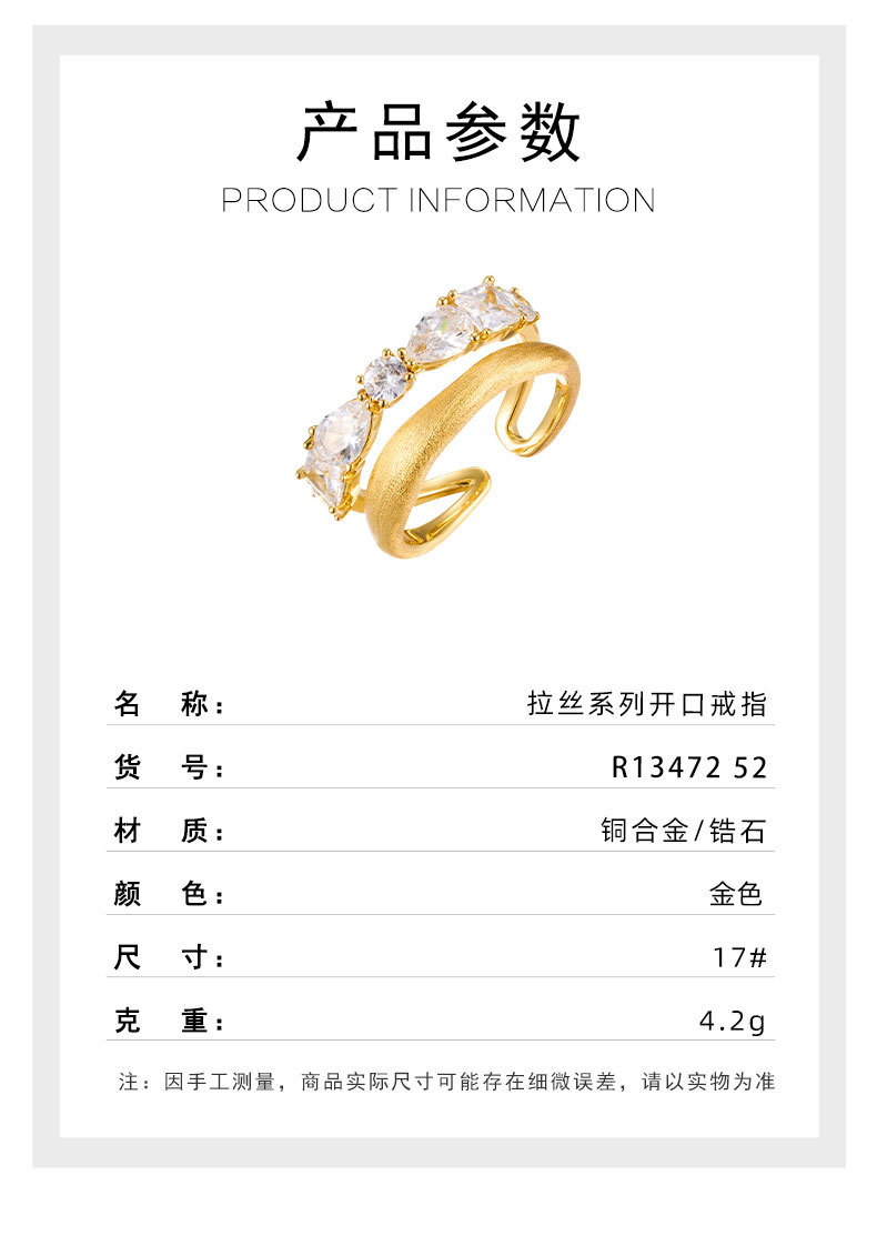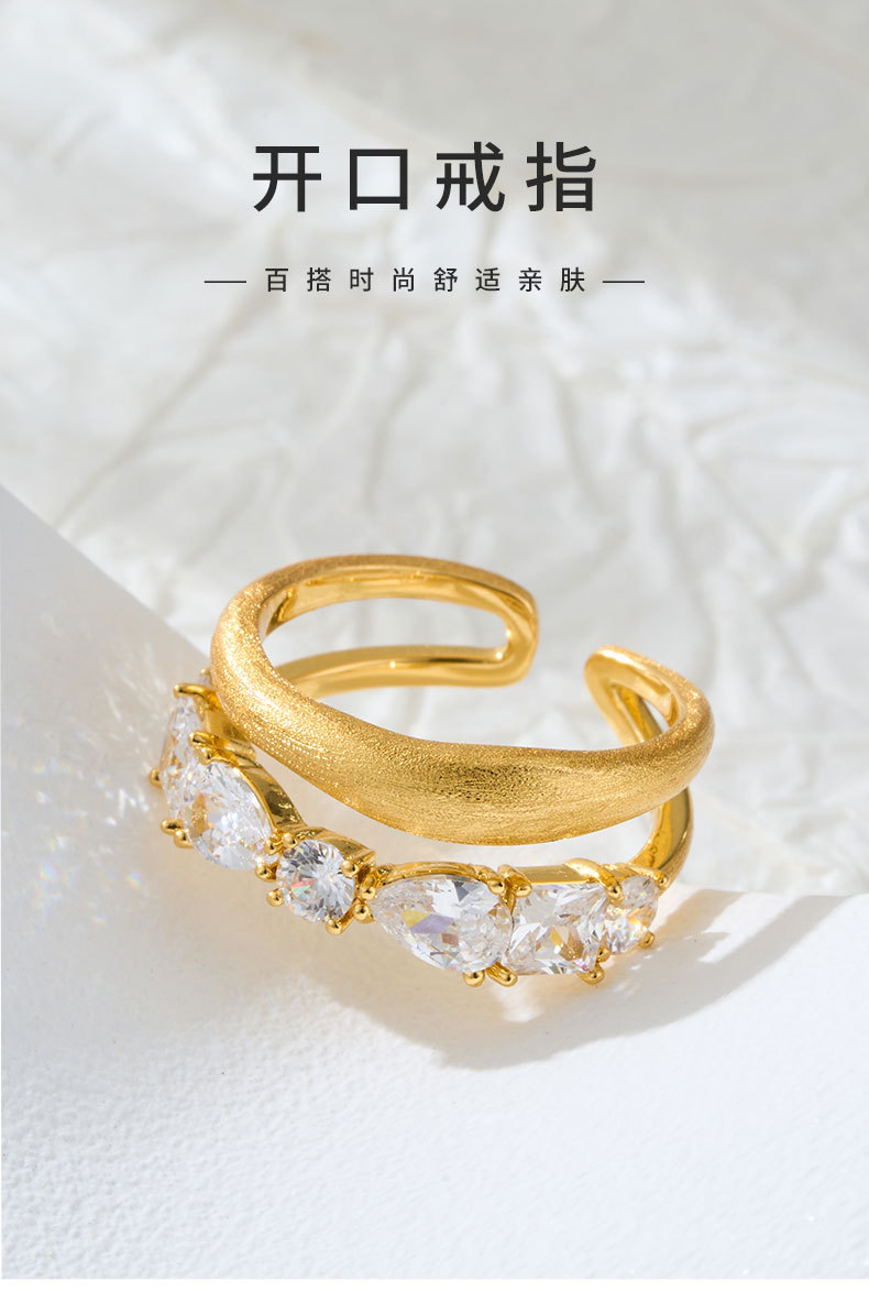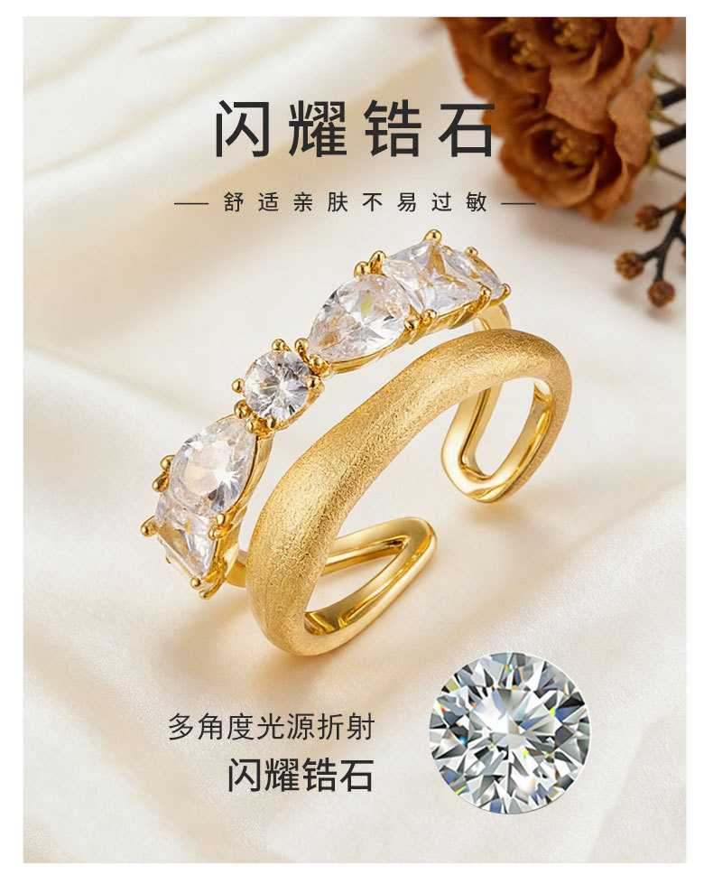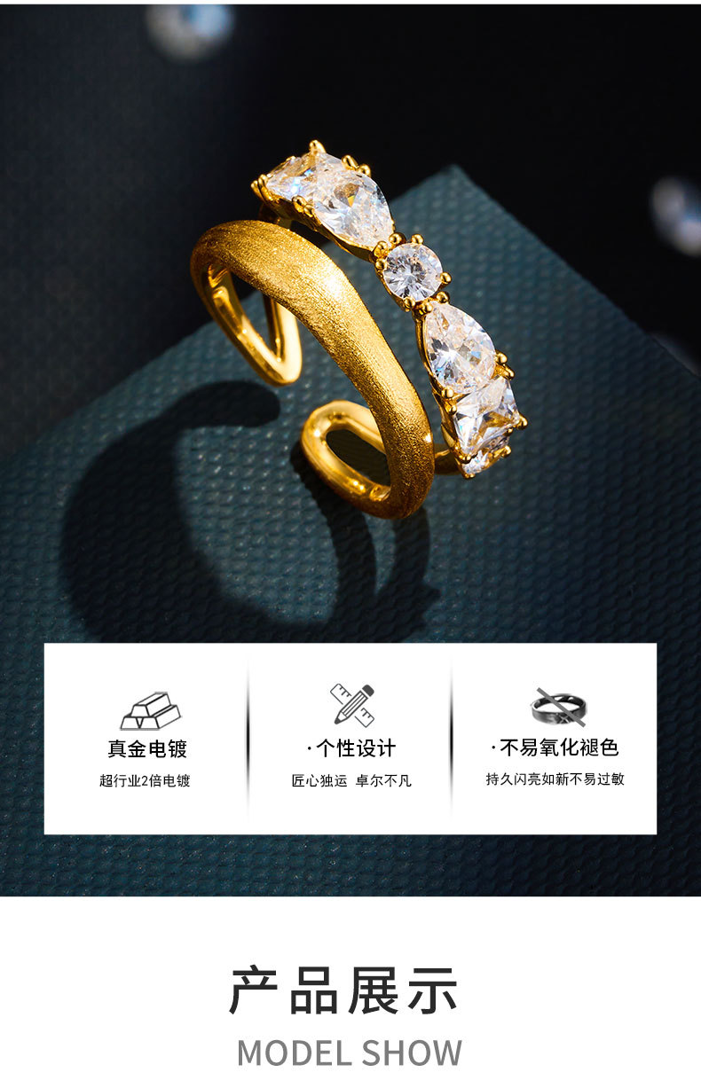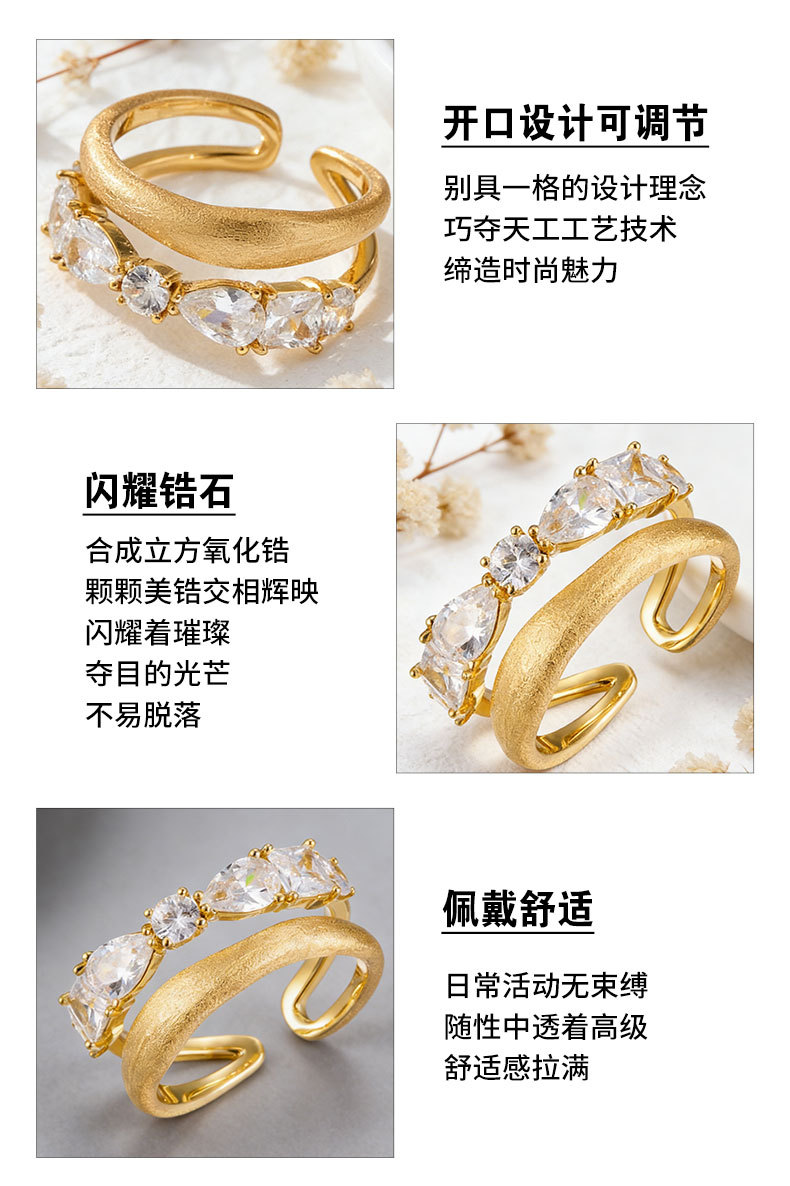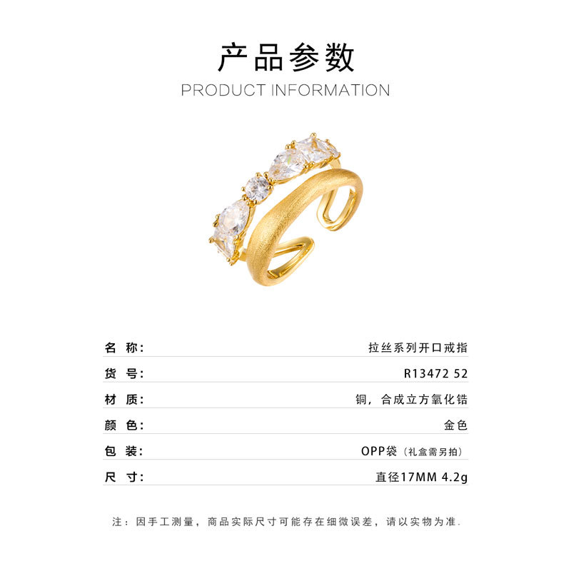 轻奢高级感双排金色拉丝开口戒指铜合金真金电镀镶锆石可调节指环 投诉
