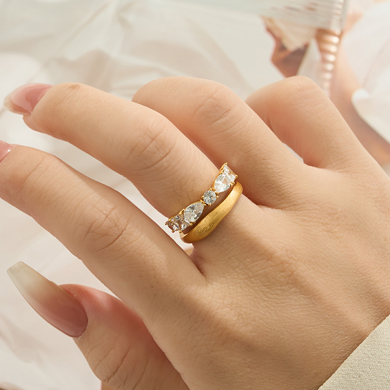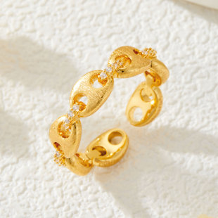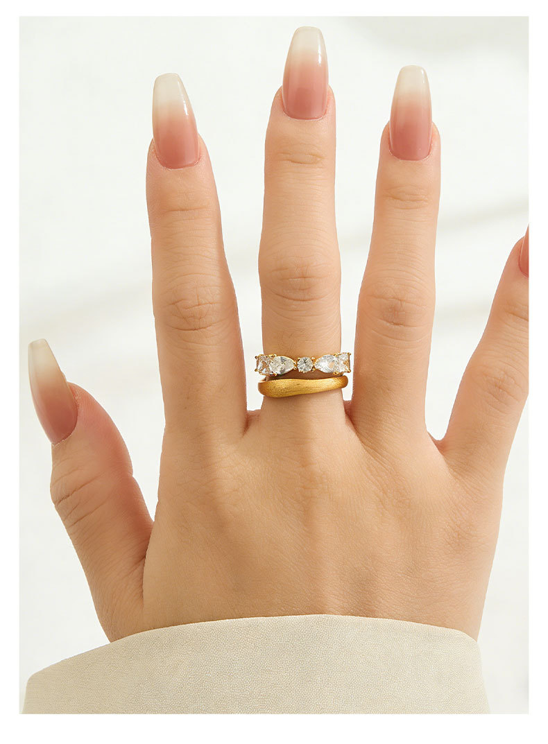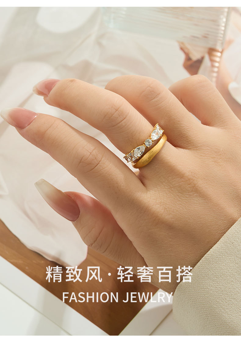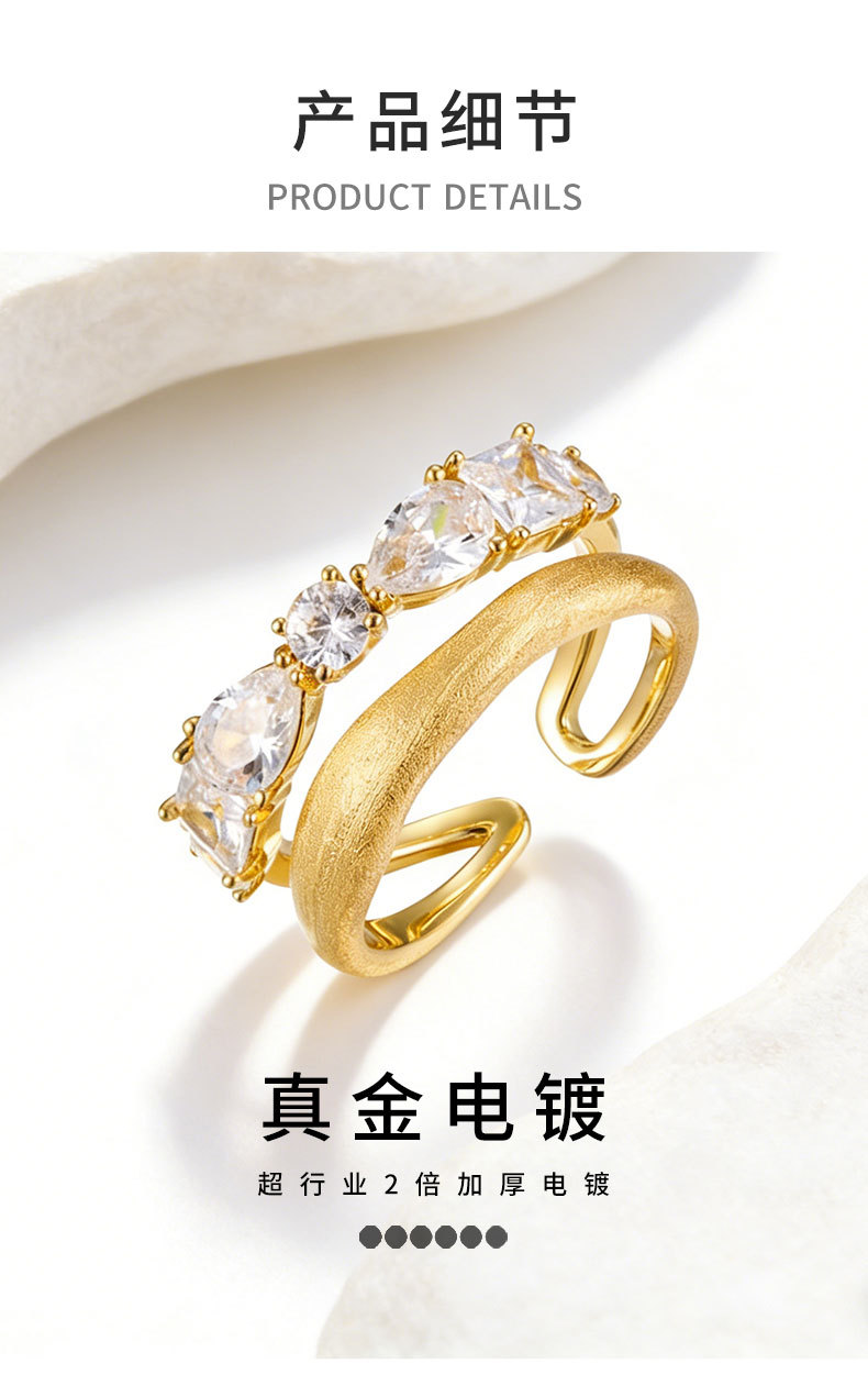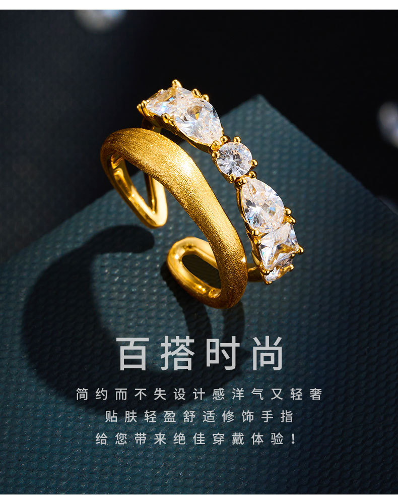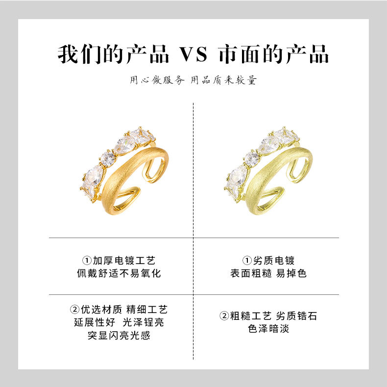 轻奢高级感双排金色拉丝开口戒指铜合金真金电镀镶锆石可调节指环 投诉