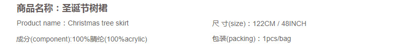 材质: 亚克力 风格: 美式乡村 货号: MC008 是否专利货源: 否 规格: 圣诞树裙直径60CM,圣诞树裙直径90C 是否IP授权: 否 是否支持改版改色改码: 支持 是否支持代工: 支持 是否支持来样来稿定制: 支持 重量: 0.34 kg/条