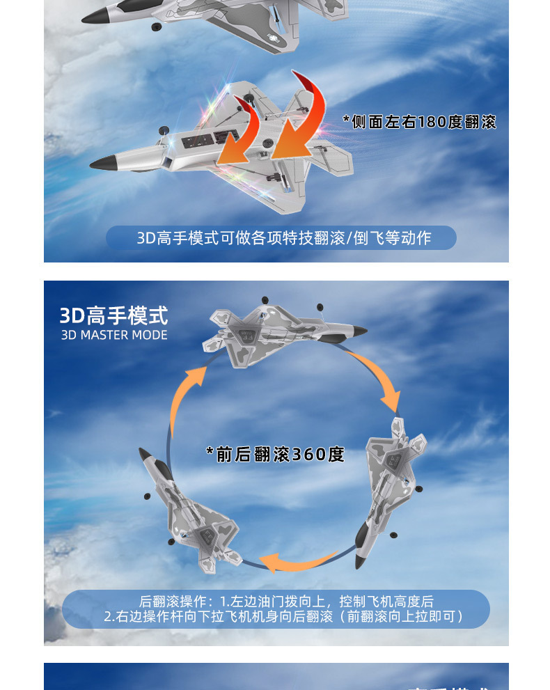 2、室外3D自由切换模式:(上升/下降/左转向/右转向.前翻滚/后翻滚,左侧翻滚/右侧翻滚/倒飞)。
