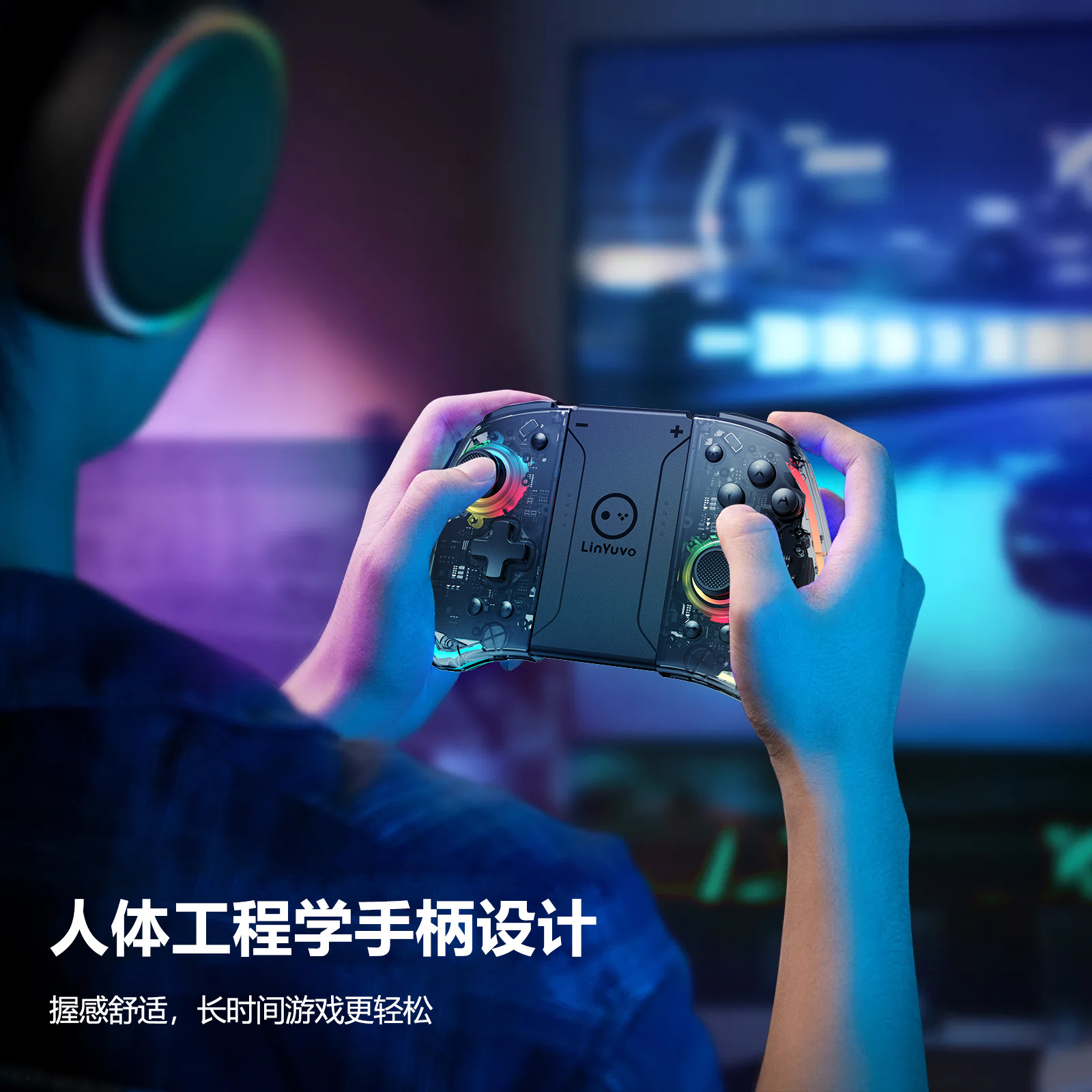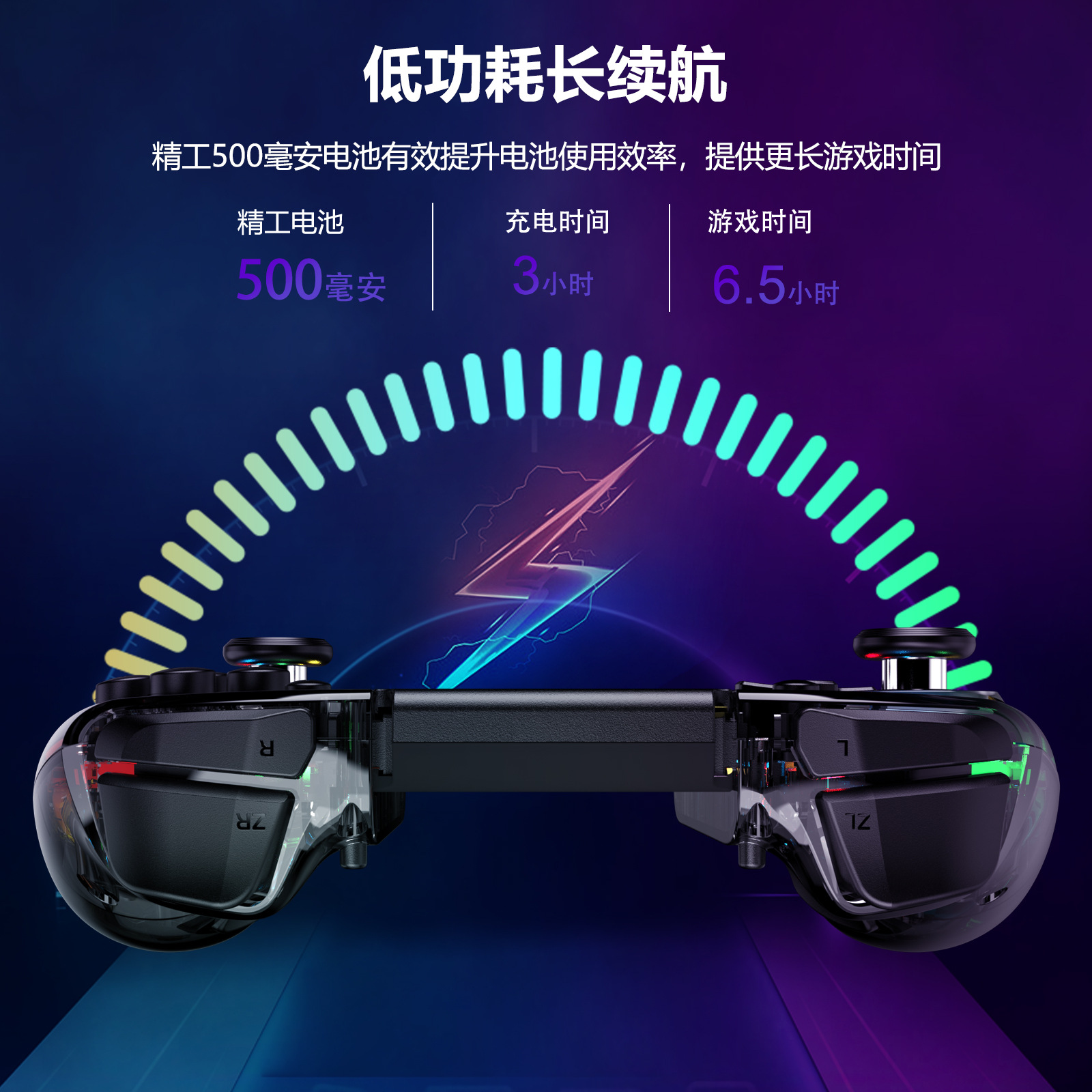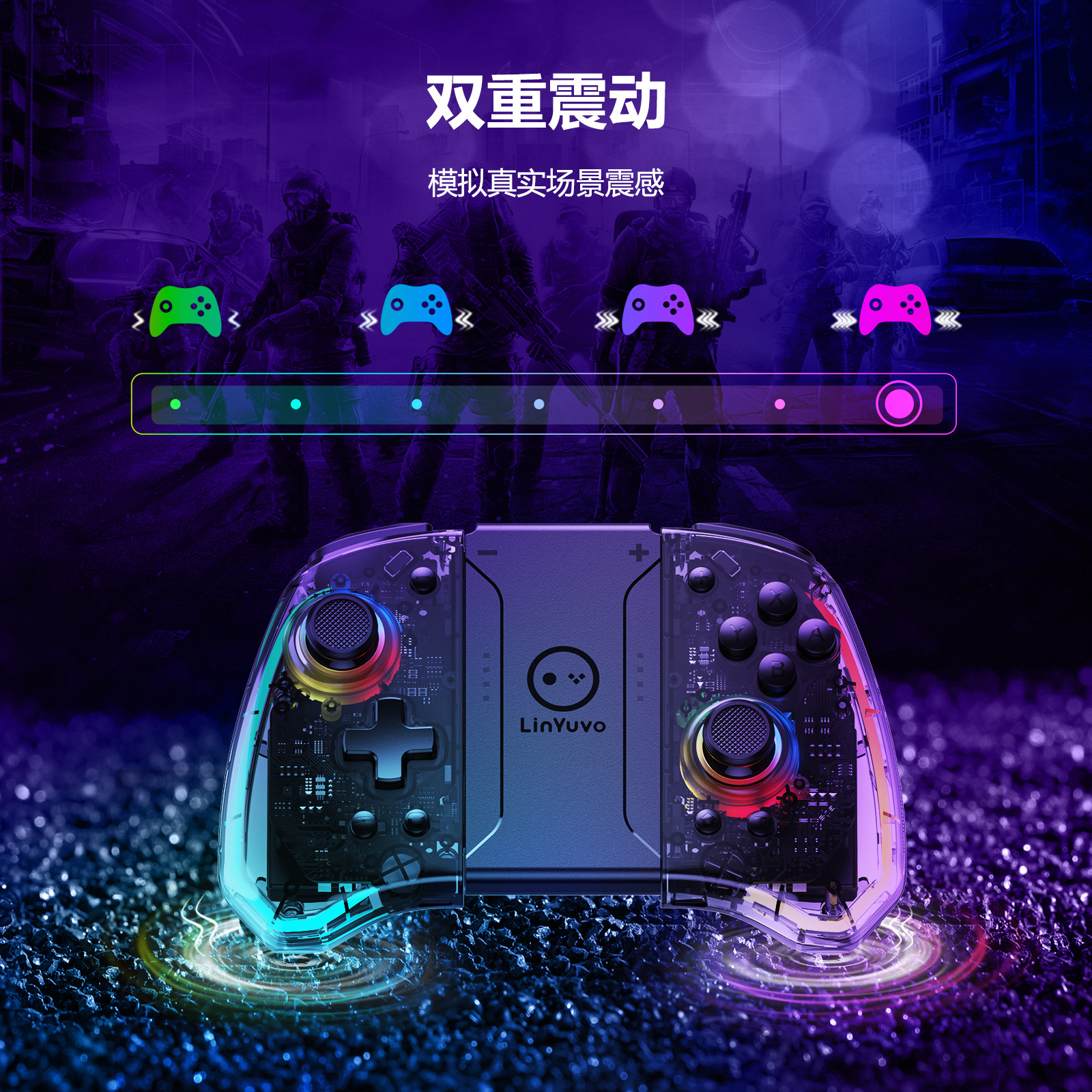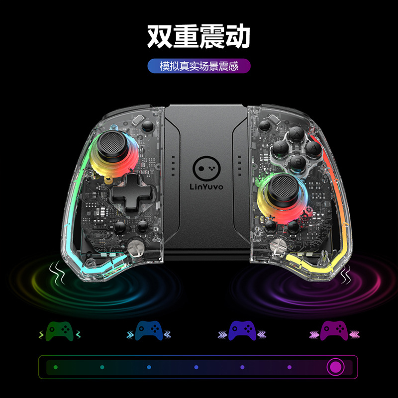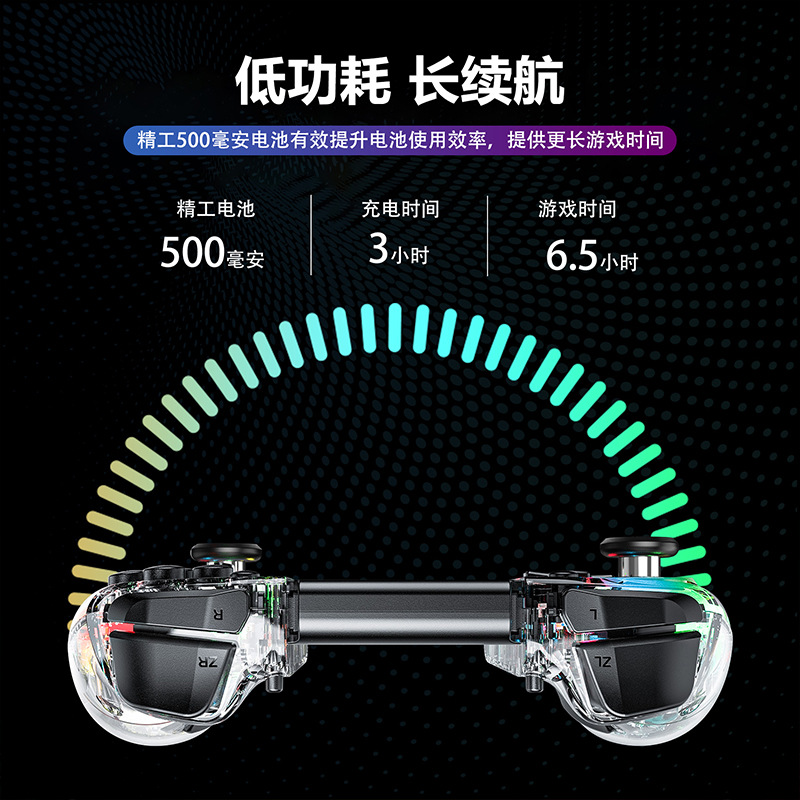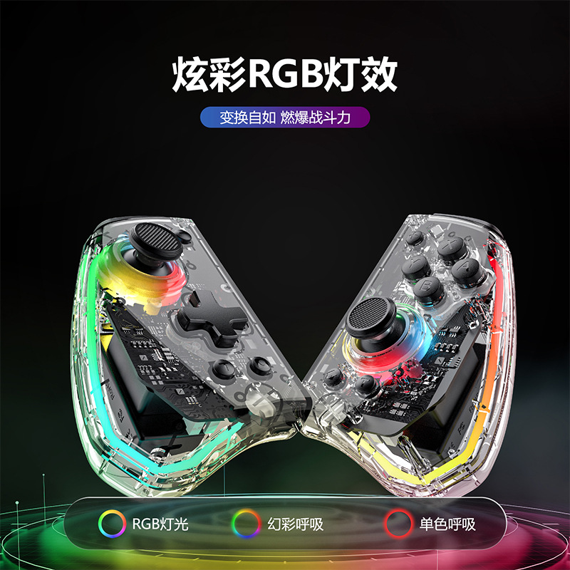3.手柄带可调节炫彩RGB灯效,8种颜色LED灯,4种不同的照明模式,4个亮度可调;