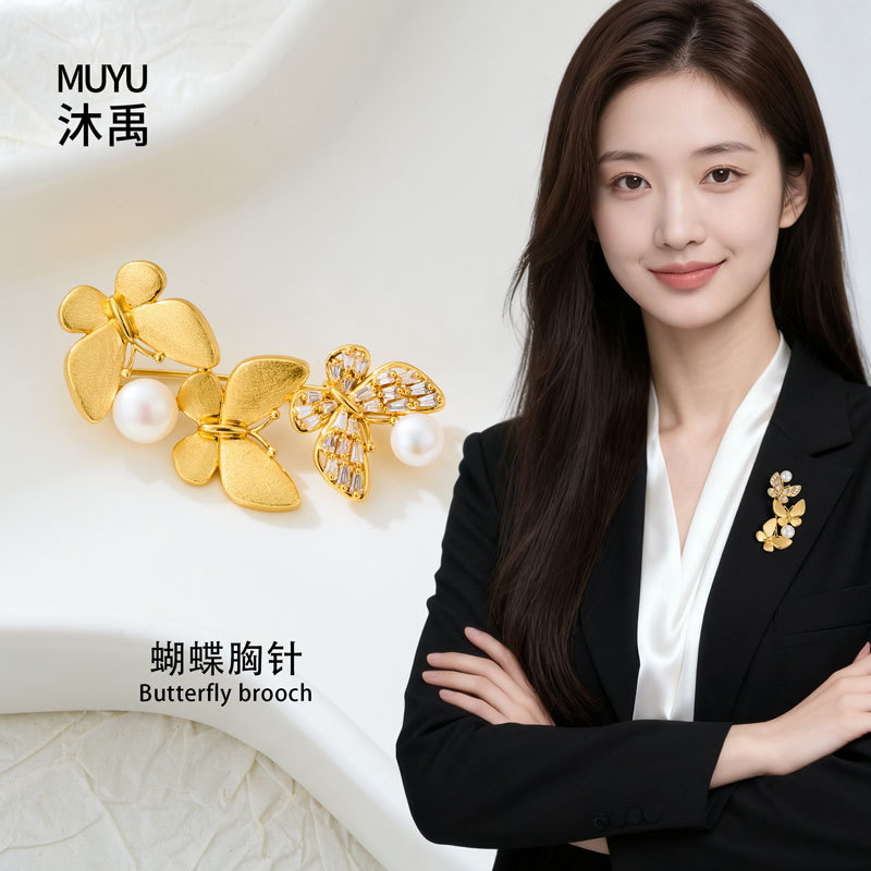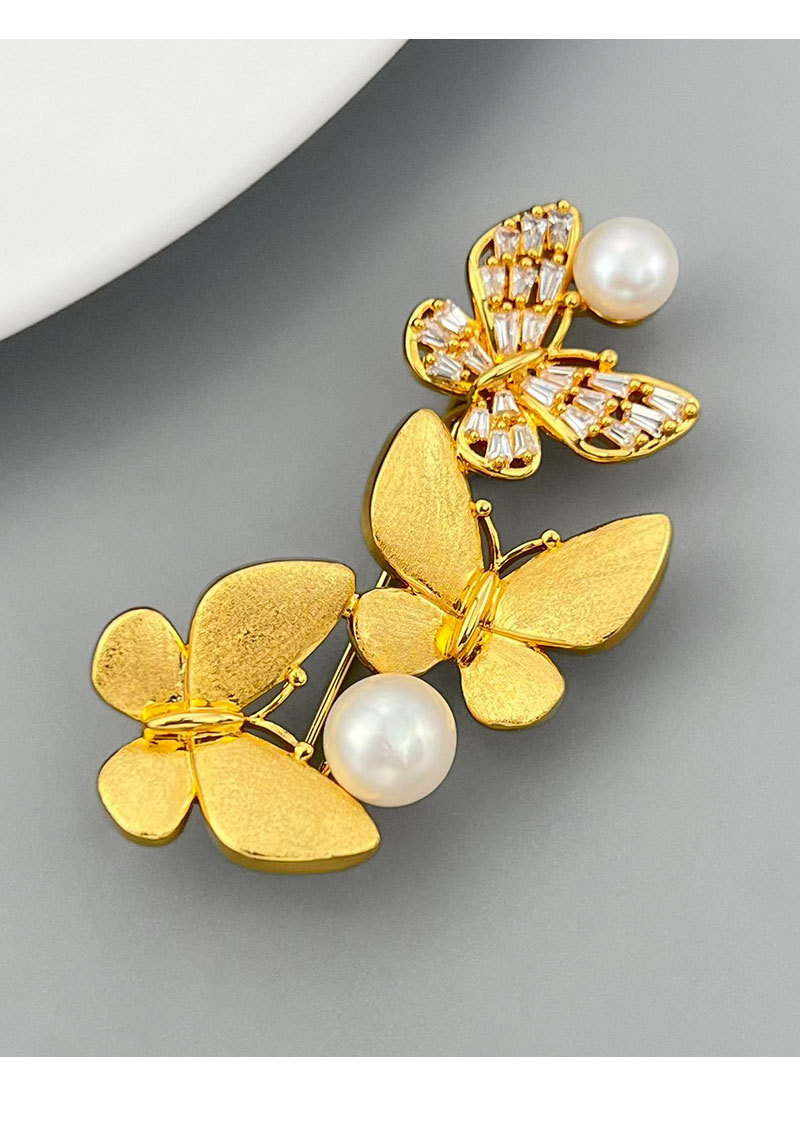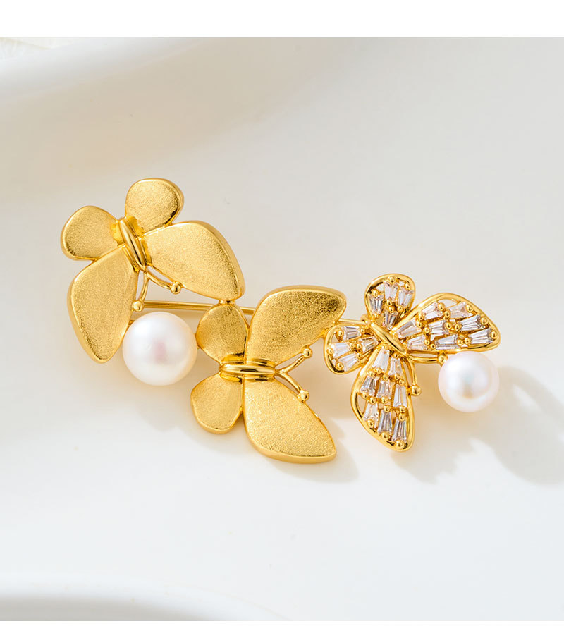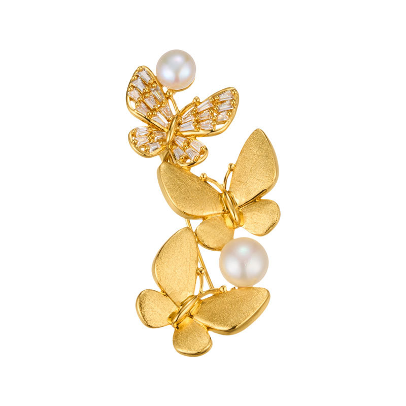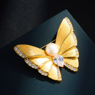 轻奢优雅金色拉丝蝴蝶胸针铜电镀真金镶锆石淡水珍珠精致别针胸花