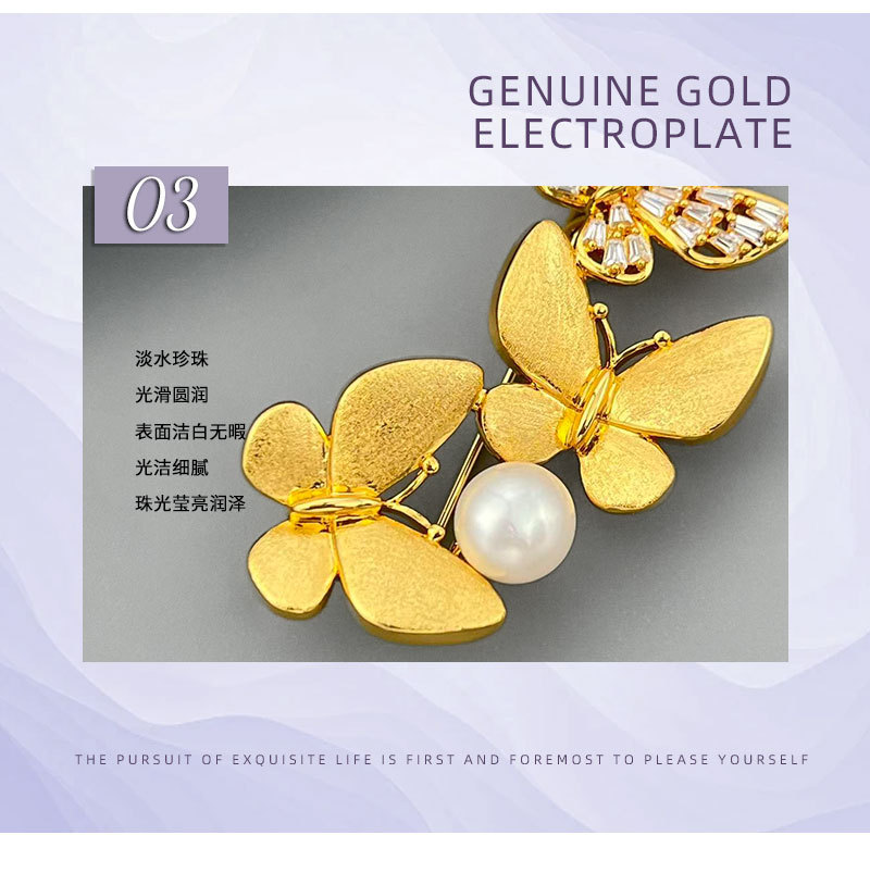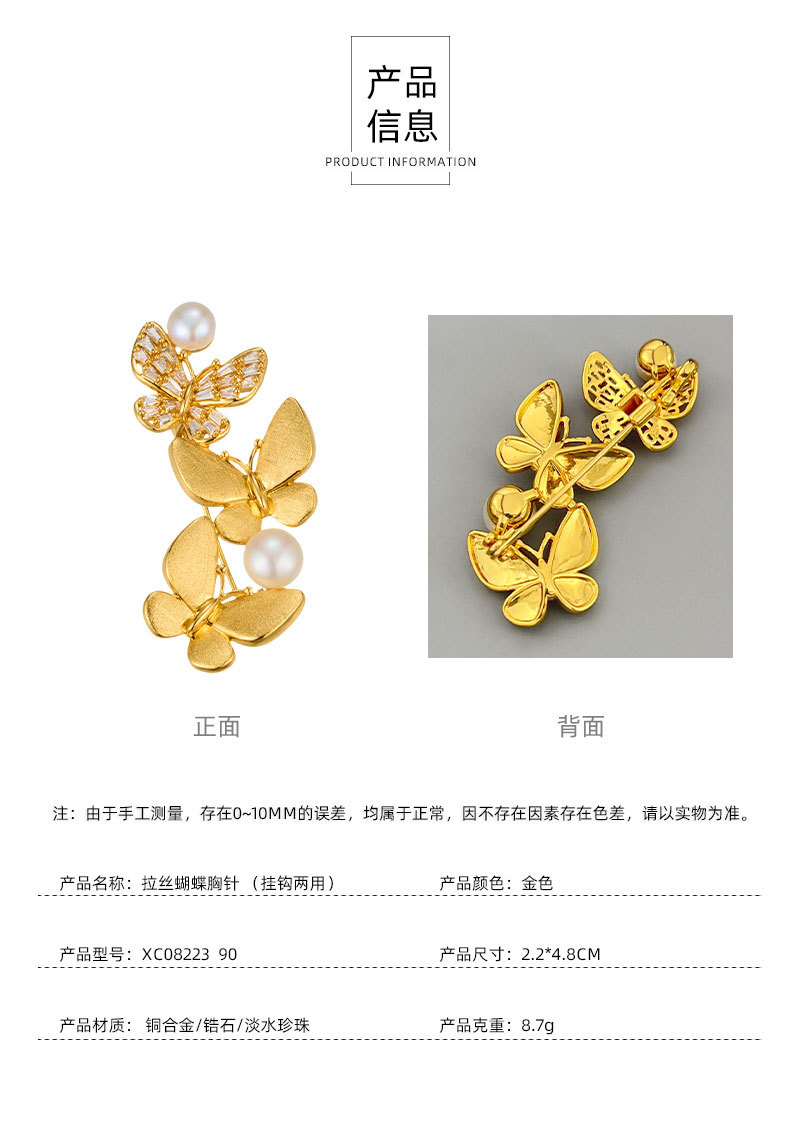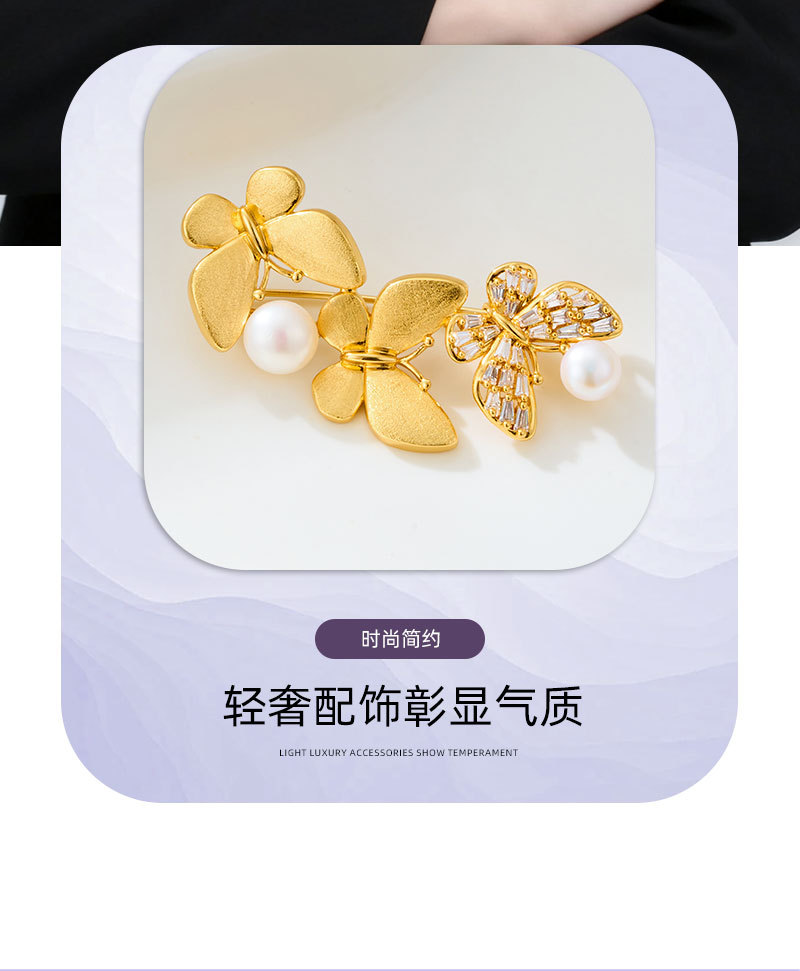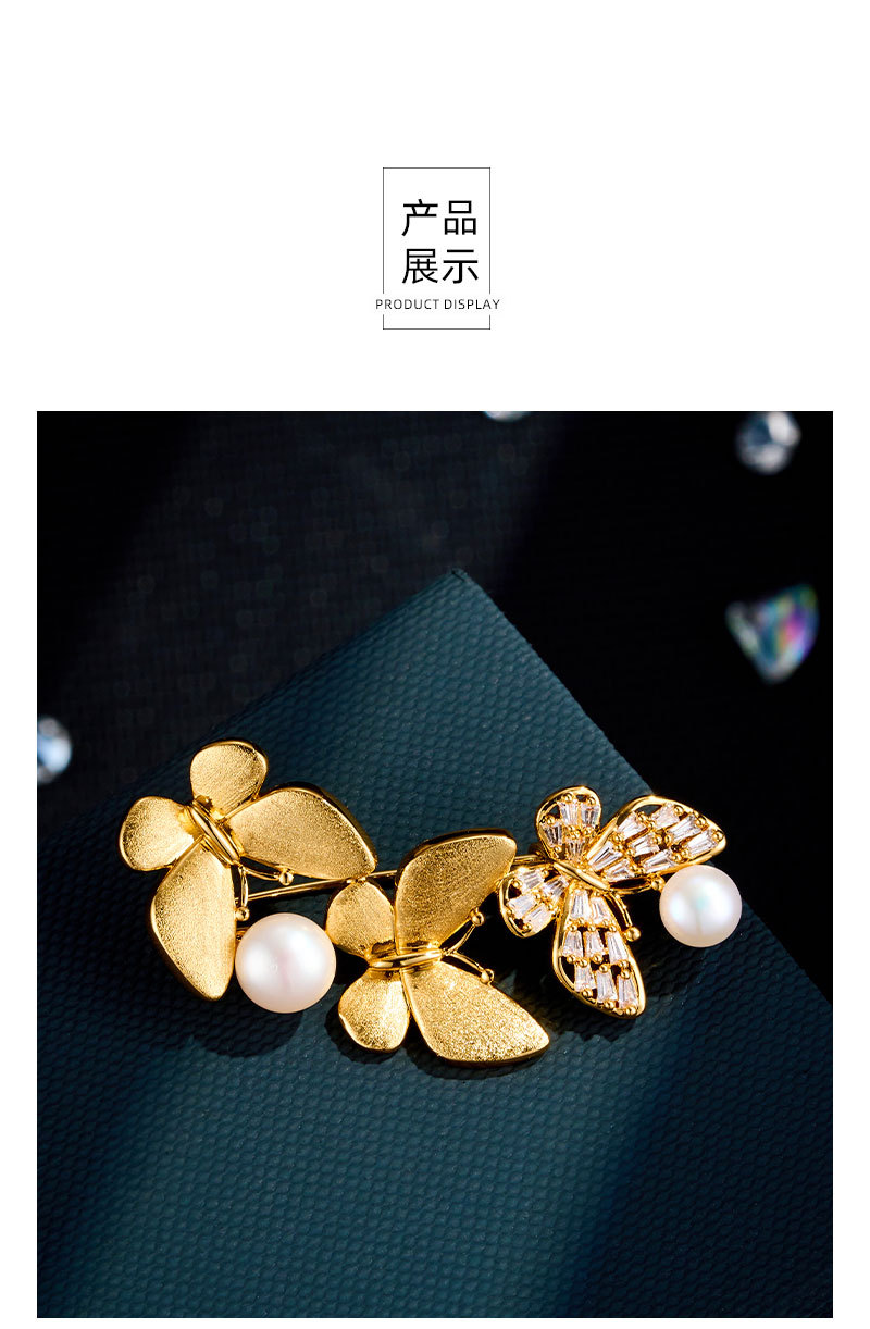 爆款拉丝蝴蝶胸针铜镶锆石真金电镀淡水珍珠高级感衣饰别针女胸花 投诉