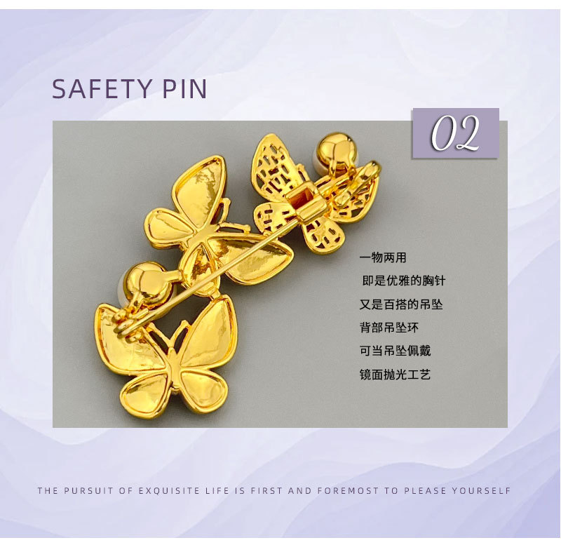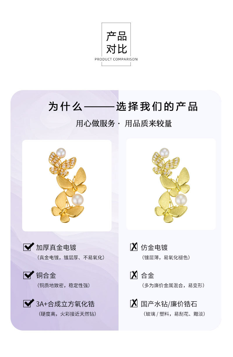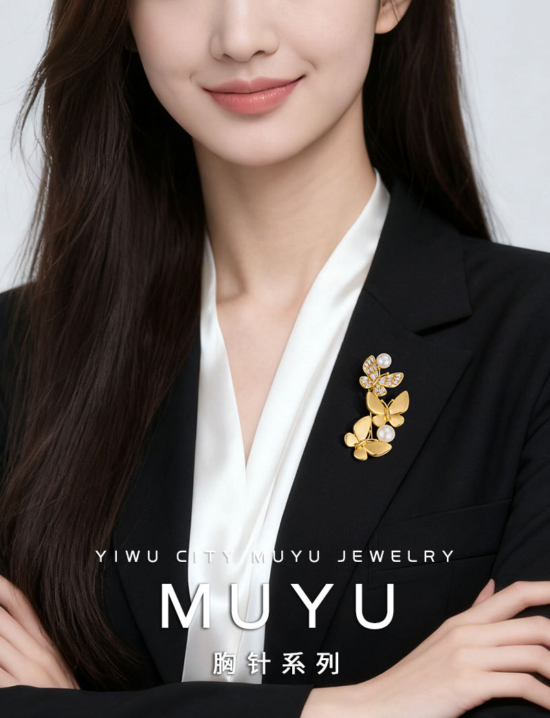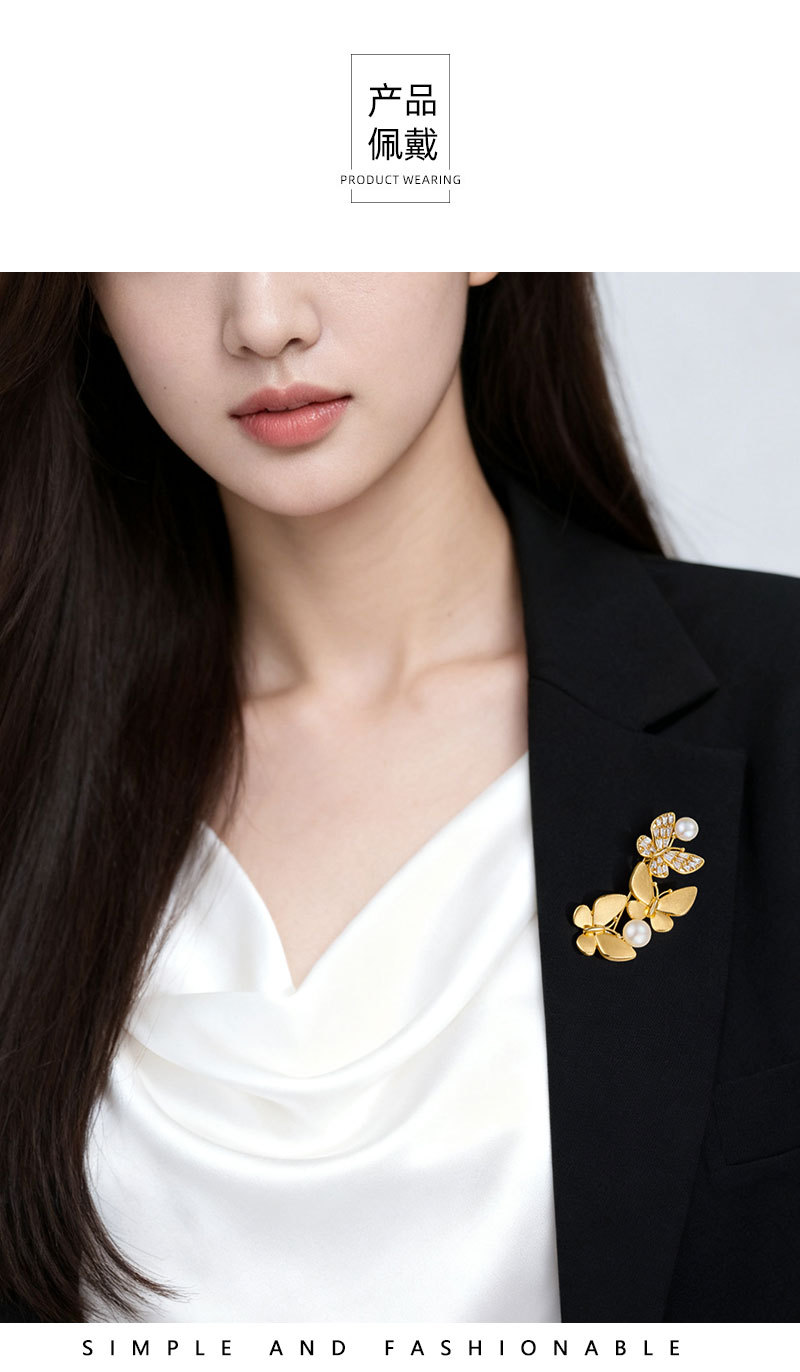 爆款拉丝蝴蝶胸针铜镶锆石真金电镀淡水珍珠高级感衣饰别针女胸花 投诉
