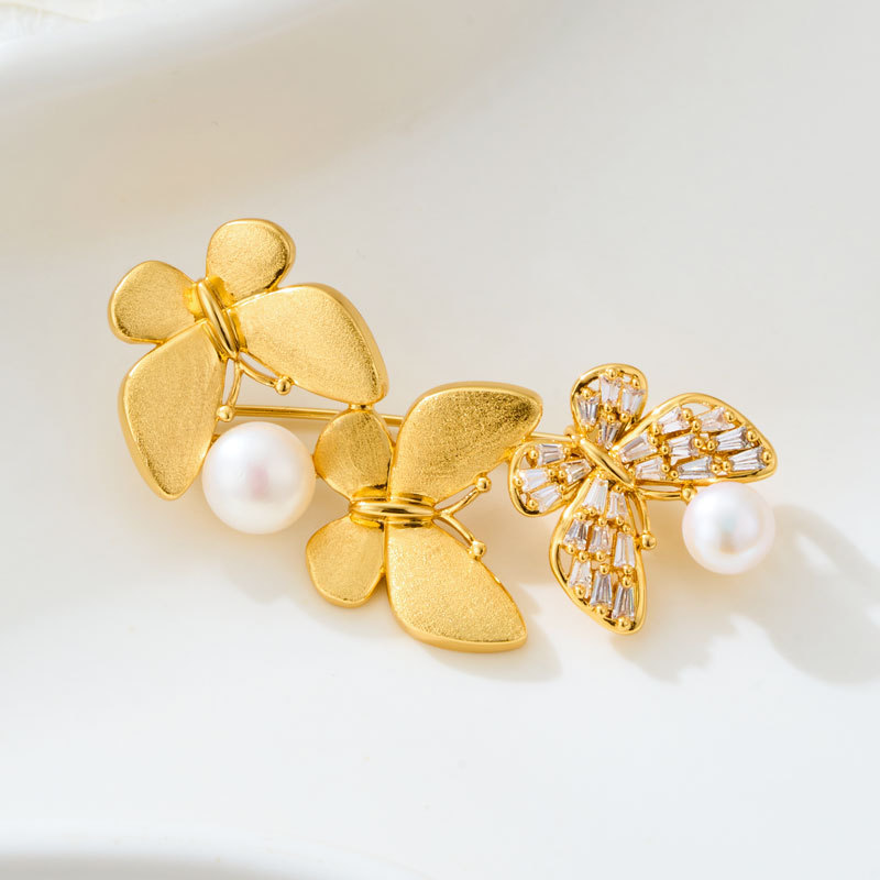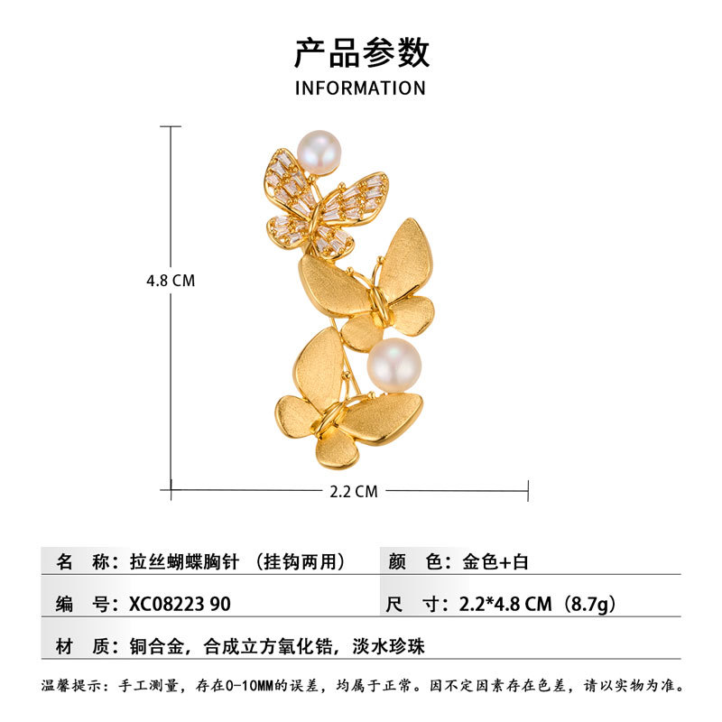 爆款拉丝蝴蝶胸针铜镶锆石真金电镀淡水珍珠高级感衣饰别针女胸花