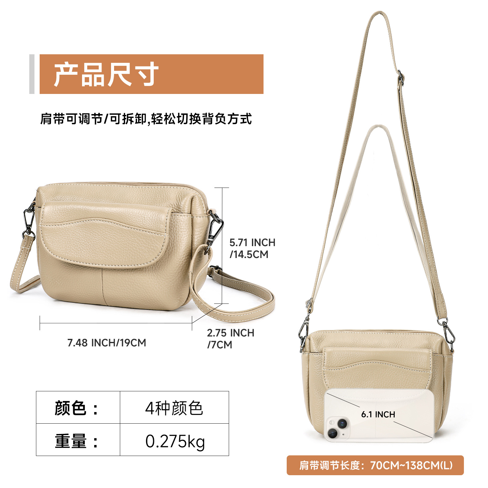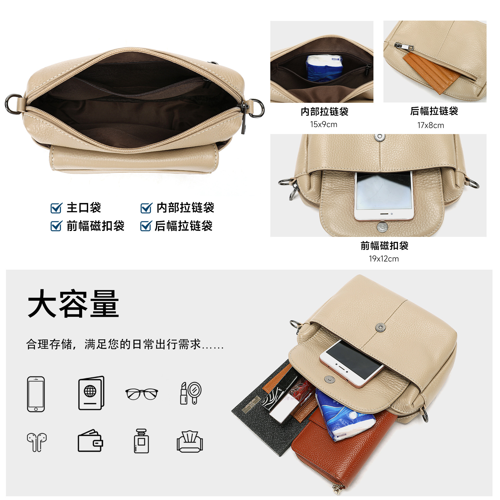 材质: 真皮 箱包潮流款式: 小方包 箱包大小: 小 里料质地: 涤棉 皮质特征: 头层牛皮 品牌: MVA 风格: 都市简约 流行元素: 其它 颜色: 米色,棕色,绿色,黑色 货号: 7796 上市年份季节: 2025年秋季 箱包形状: 贝壳型 开盖方式: 拉链 包内部结构: 手机袋,证件袋 硬度: 中偏软 外袋种类: 挖袋 有可授权的自有品牌: 是 有无夹层: 无 肩带根数: 单根 尺寸: 19*7*14.5cm 重量: 0.3 kg/个