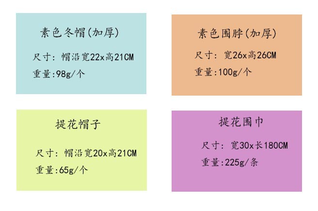 产品类别: 针织帽 功能: 保暖 面料名称: 金貂绒 主面料成分: 涤纶(聚酯纤维) 风格: 时尚OL 货号: MC008 加工方式: 平针,提花,格子,横条,绞花,绣花,印花 流行元素: 图腾 图案: 平针,提花,格子,横条,绞花,绣花,印花 适合季节: 冬季 产地: 无锡 帽顶款式: 圆顶 帽檐款式: 无檐 颜色: 素色冬帽,素色围脖,提花帽子,提花围巾 是否跨境出口专供货源: 否 上市年份/季节: 2022年秋季 主面料成分含量: 100% 风格分类: 时尚通勤 材质: null 流行元素分类: 民族/国风 重量: 0.065 kg/顶