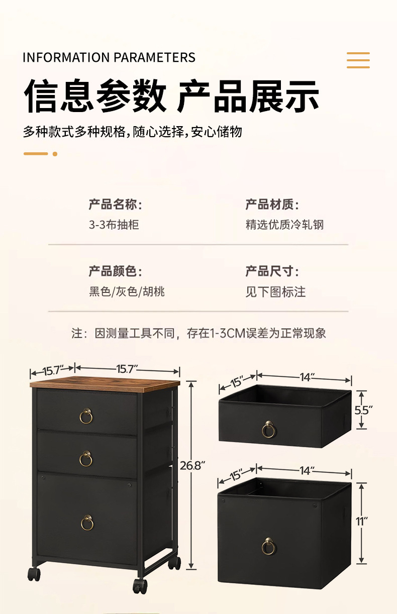 外贸DZ源头厂家直供3-3布抽柜3层收纳柜可当床头柜适用于卧室客厅 投诉