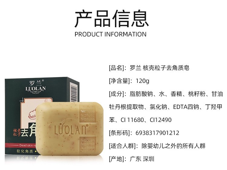 品牌: LUOLAN/罗兰 规格: 正常规格 净含量: 120g 化妆品功效: 去角质 适用人群: 通用 产品名称: 核壳粒子去角质皂 是否进口: 否 品牌类型: 国货品牌 产地: 中国大陆 货号: 6938317901212 保质期: 3年 产品规格: 罗兰去角质皂120g,罗兰竹炭皂120g 重量: 0.5 kg/块