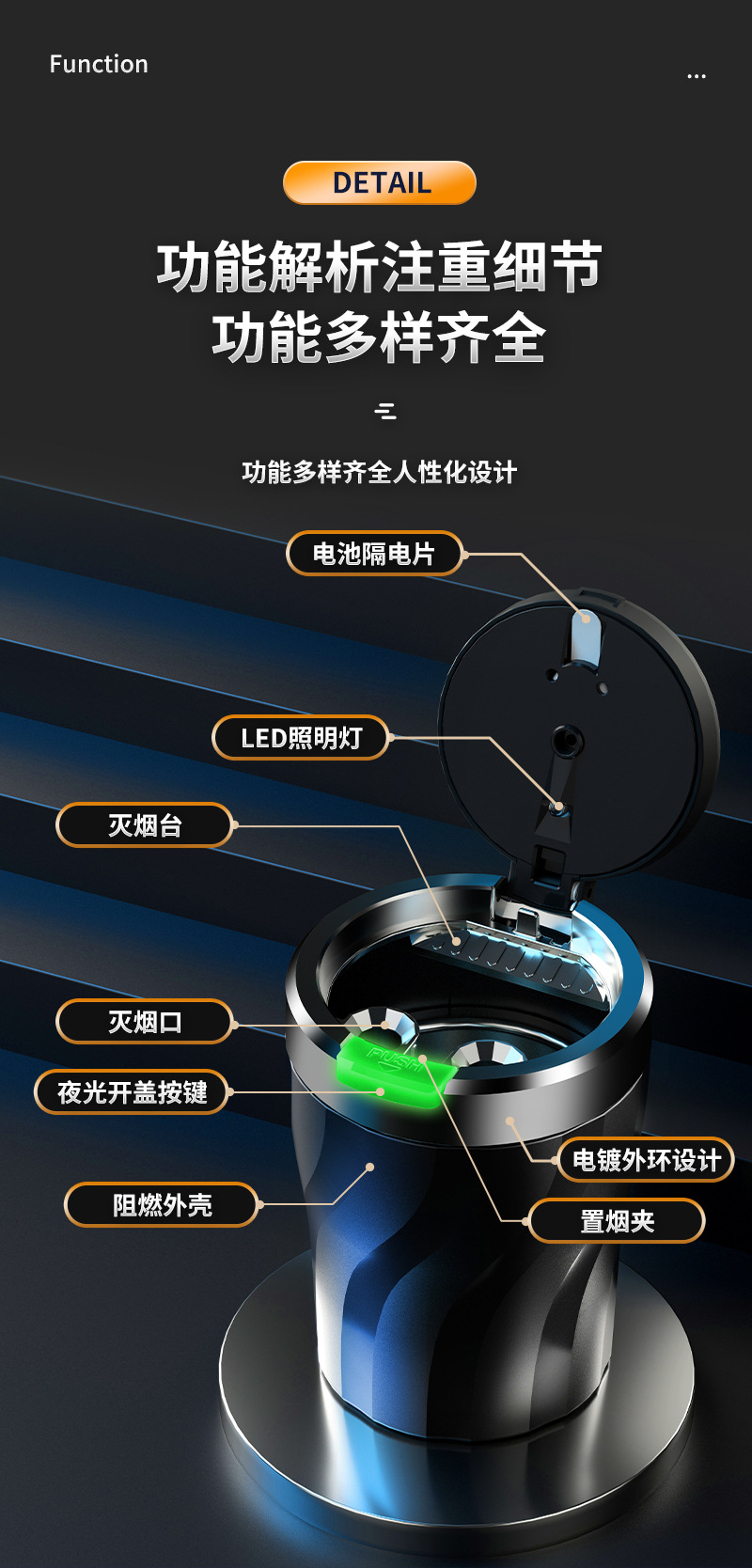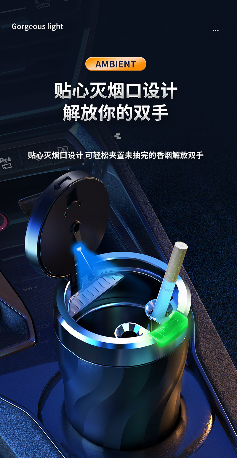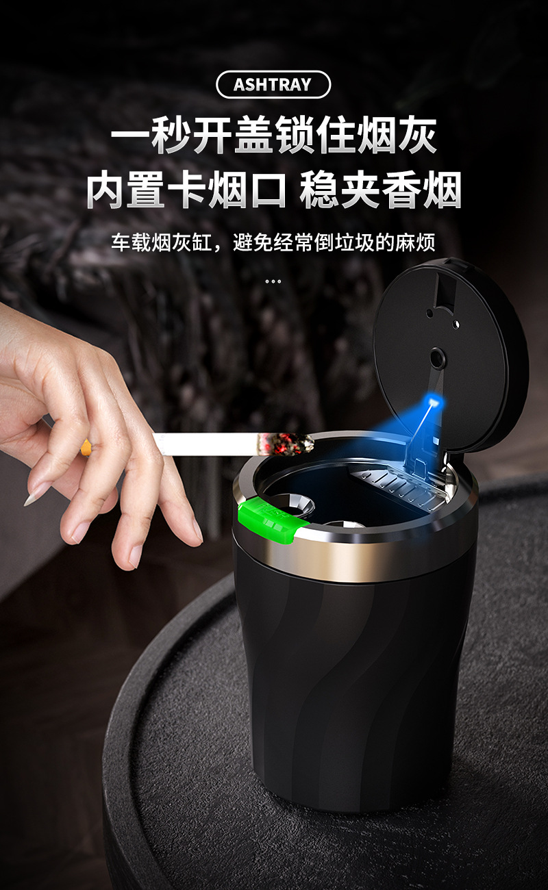 车载烟灰一键开盖夜光多功能汽车室内通用金属内胆烟灰缸设计带盖