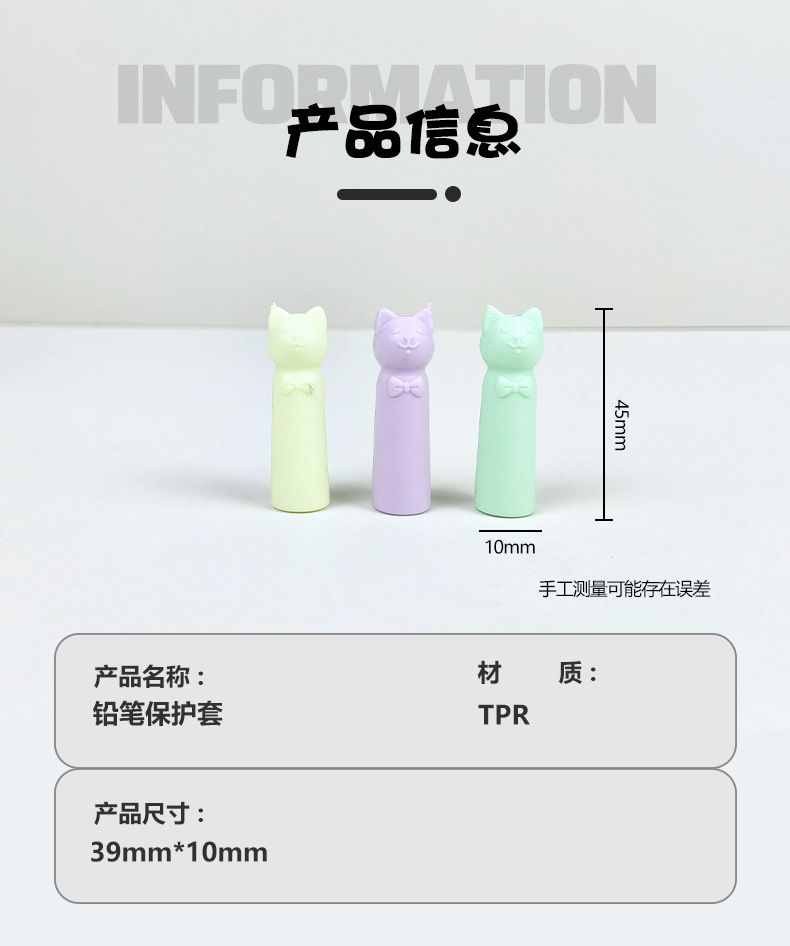 材质: 软胶 品牌: 其他 类型: 笔套 规格: 散装 袋装 用途: 保护铅笔笔头 货号: 猫头铅笔保护套 包装方式: 散装 是否进口: 否 型号: 散装颜色随机,OPP袋装一包10个 是否跨境出口专供货源: 否 是否属于礼品: 否 是否专利货源: 否 重量: 0.01 kg/个