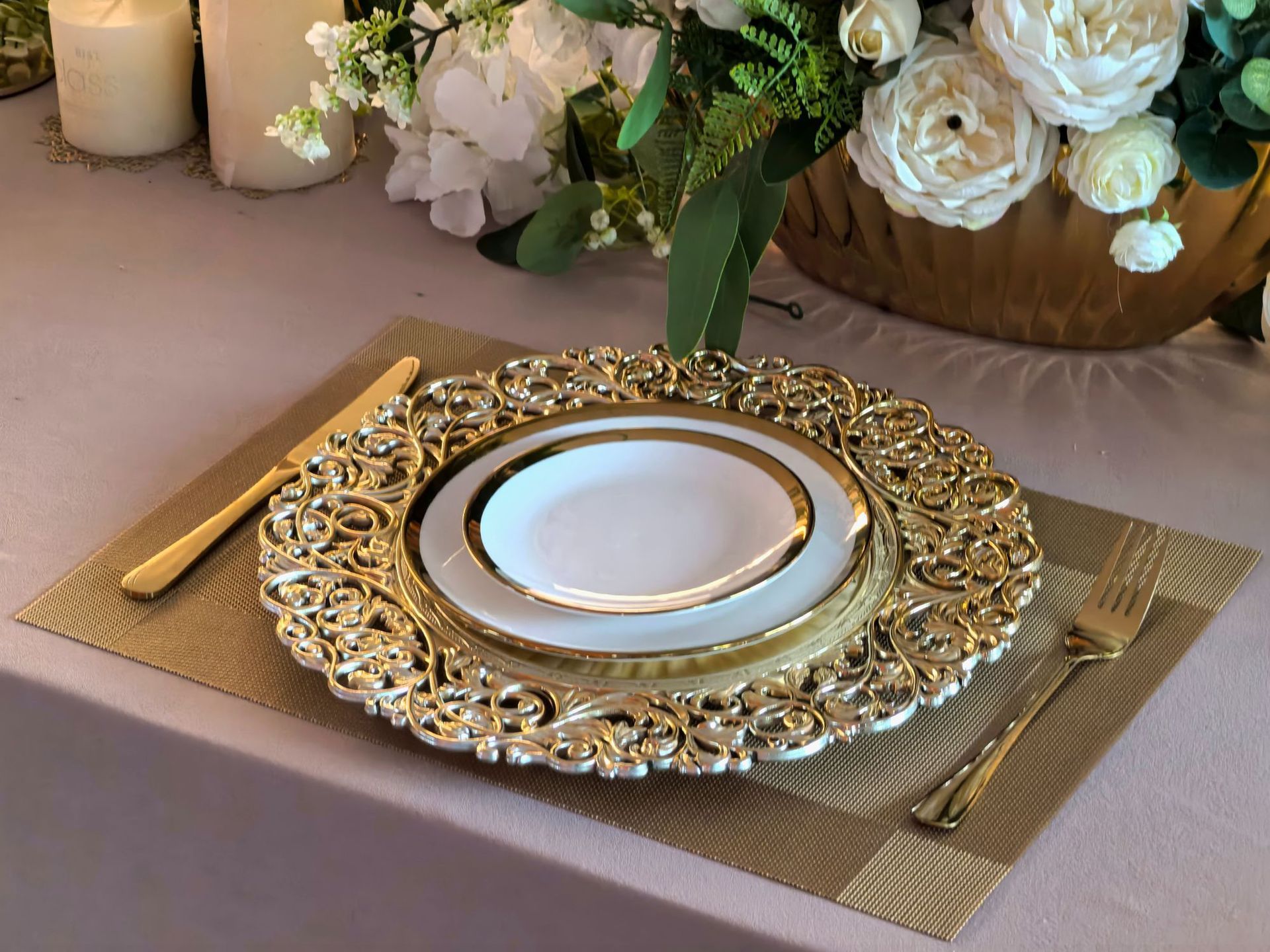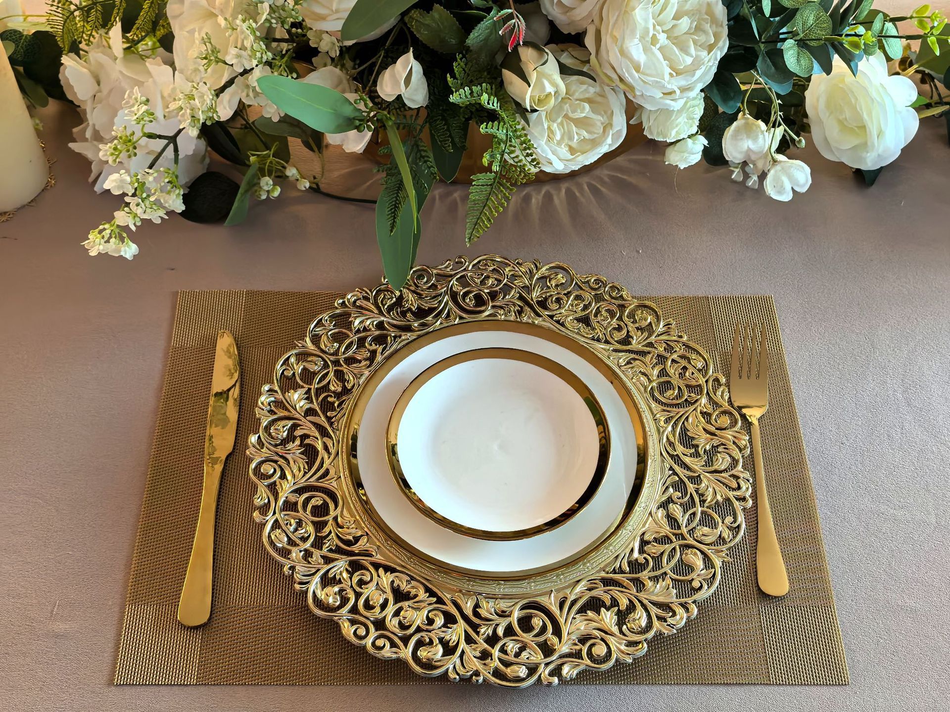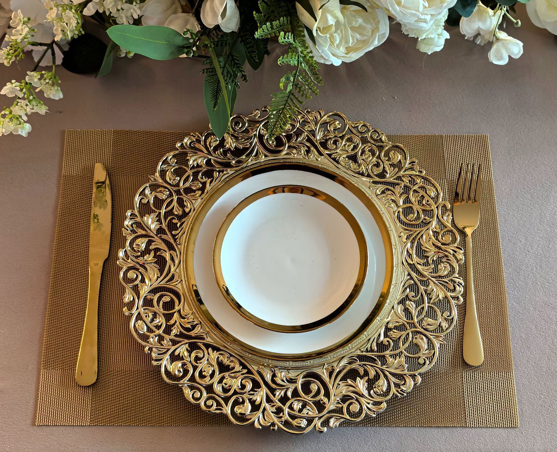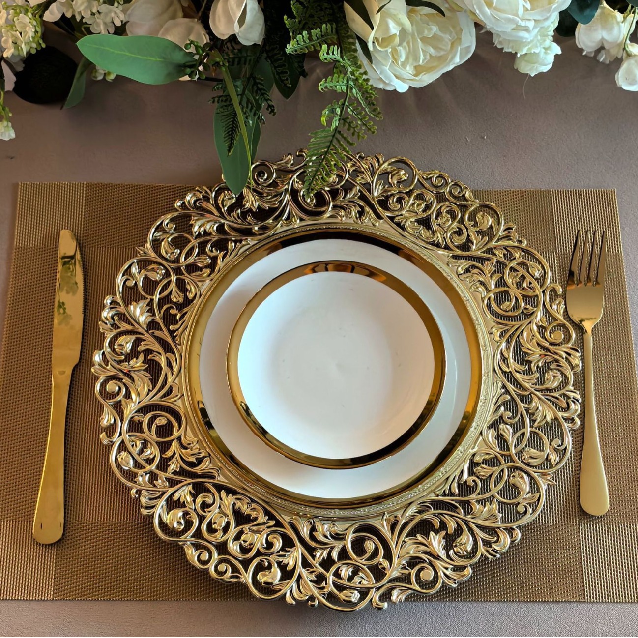 跨境外贸charger plates欧式婚礼工艺雕花金色塑料装饰盘西餐垫盘 English | 投诉