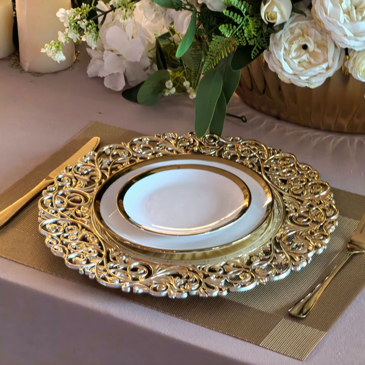 跨境外贸charger plates欧式婚礼工艺雕花金色塑料装饰盘西餐垫盘