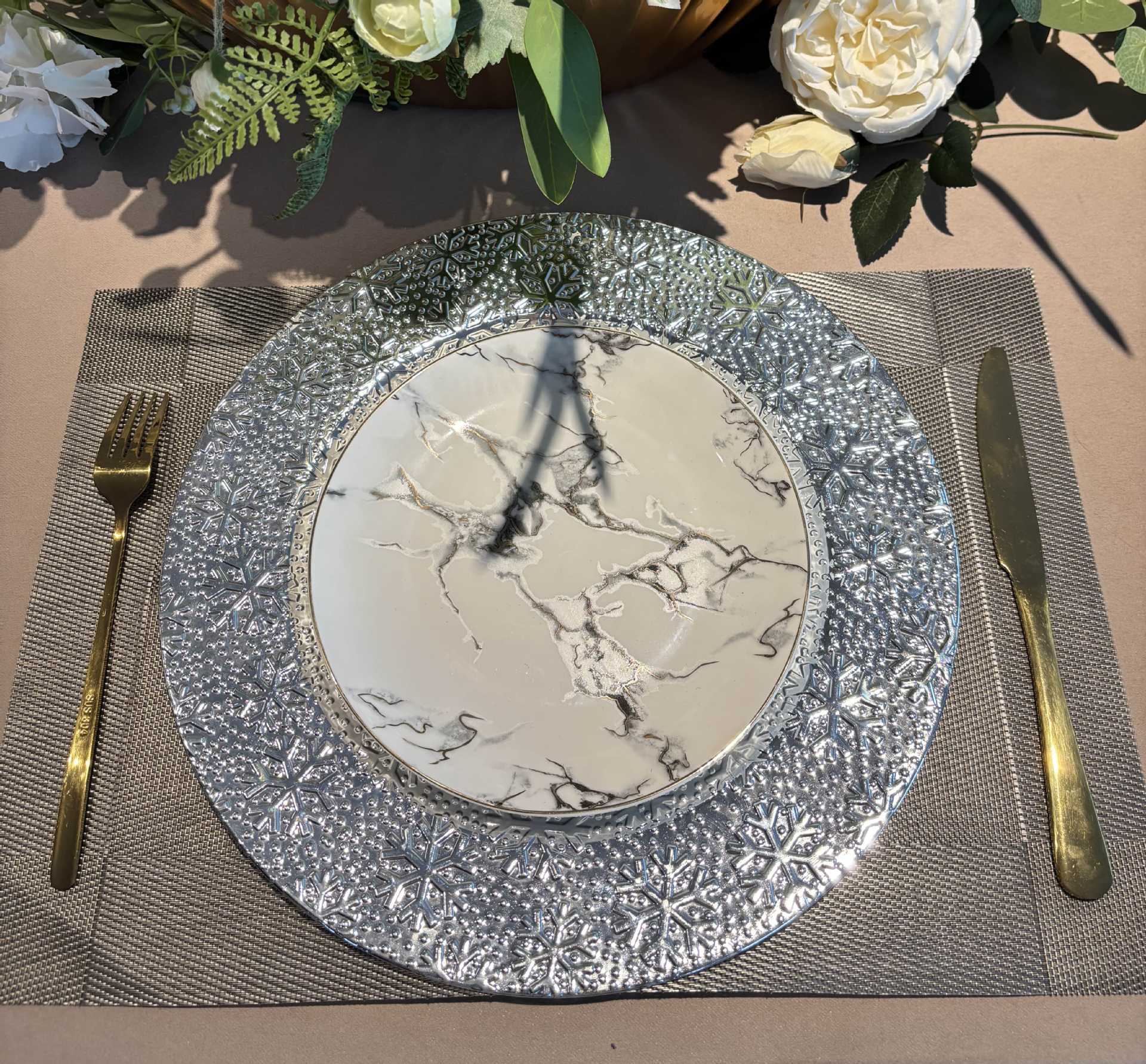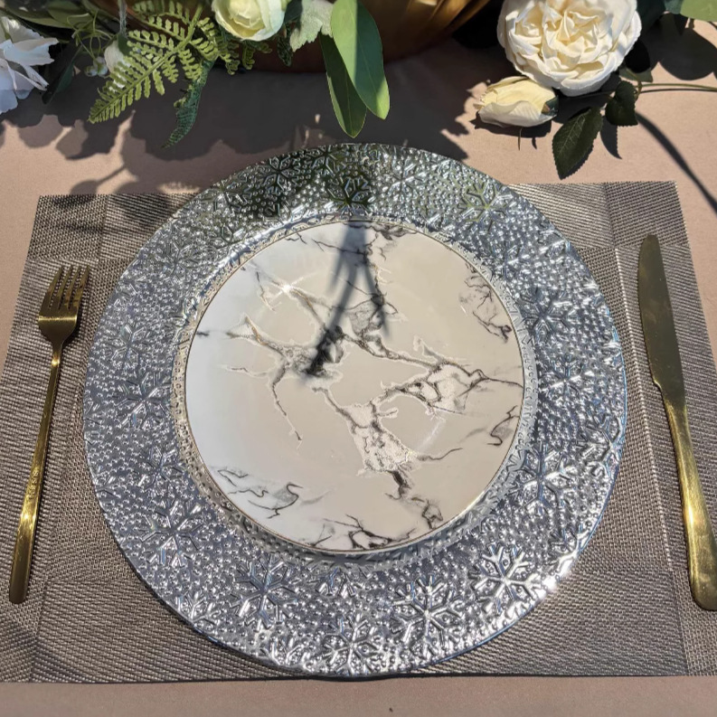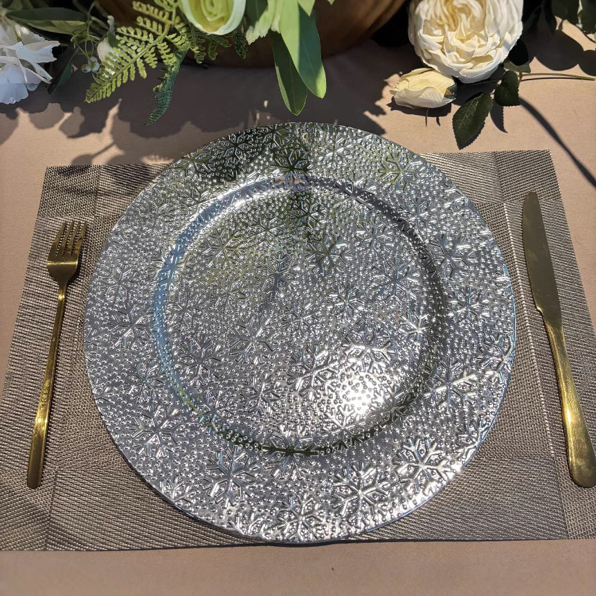 跨境charger plates欧式婚礼派对酒店晚宴雪花盘盘垫盘PP塑料