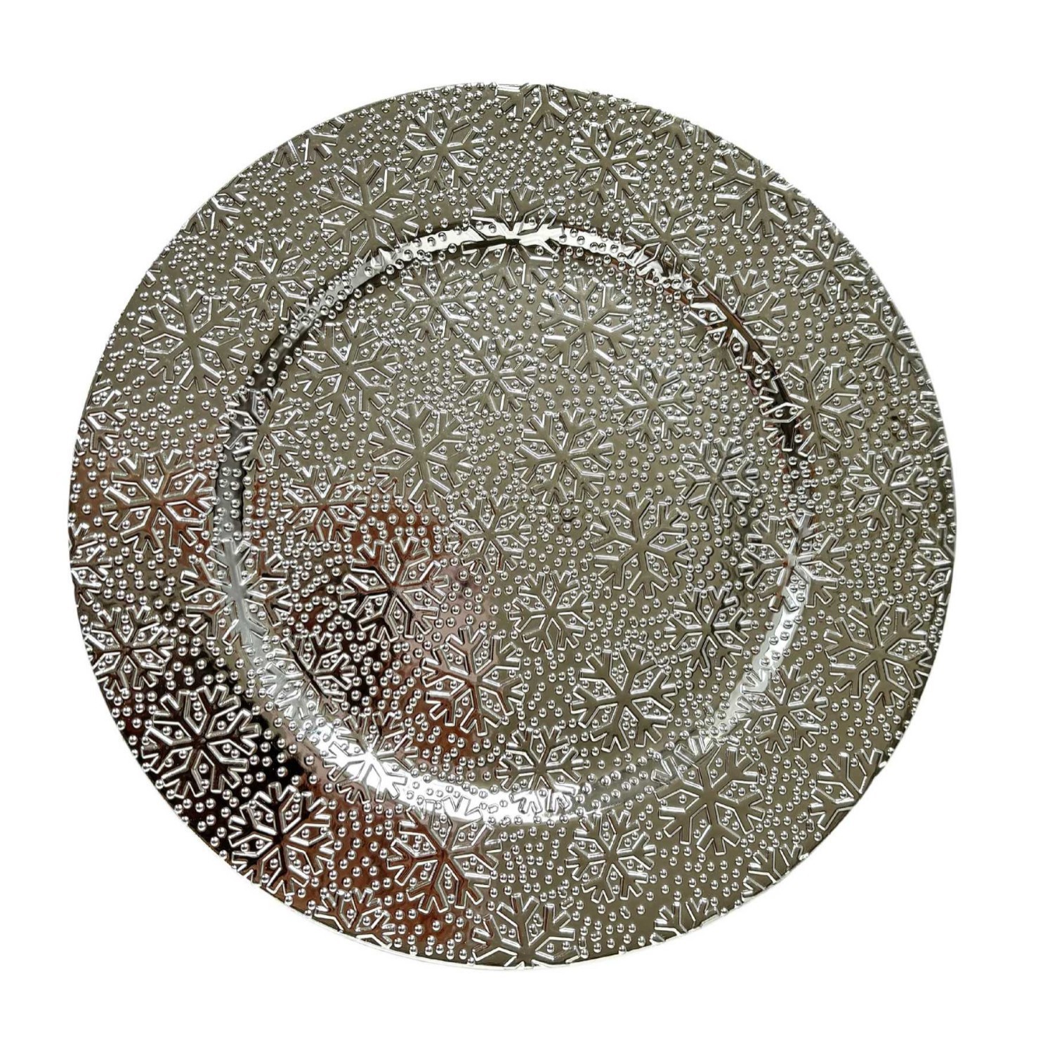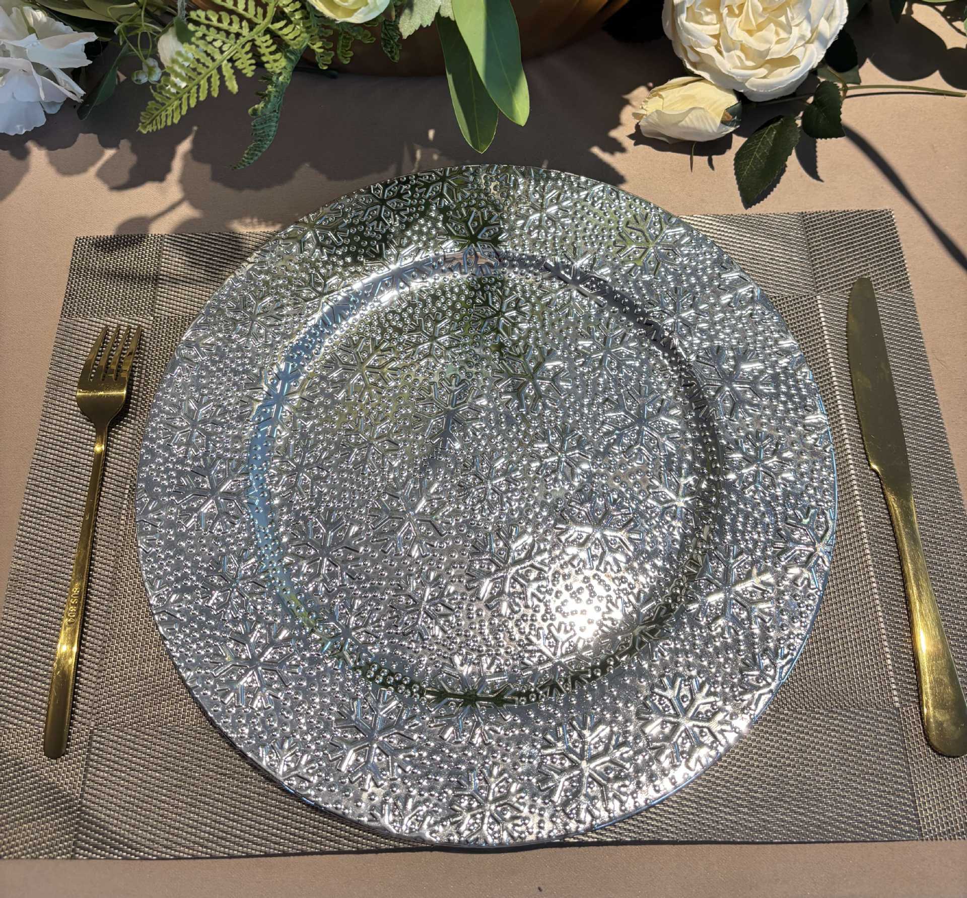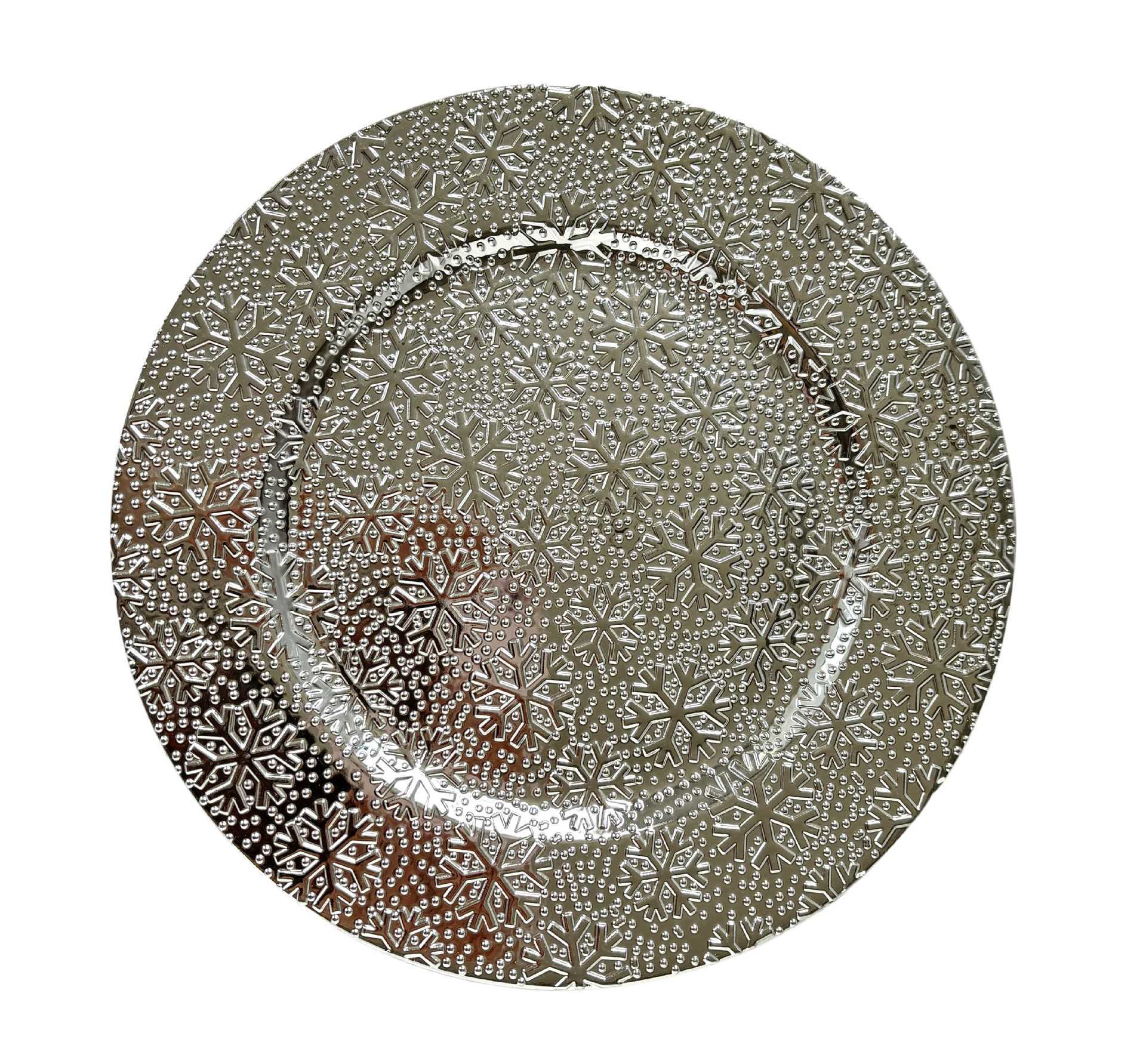 跨境charger plates欧式婚礼派对酒店晚宴雪花盘盘垫盘PP塑料 English | 投诉