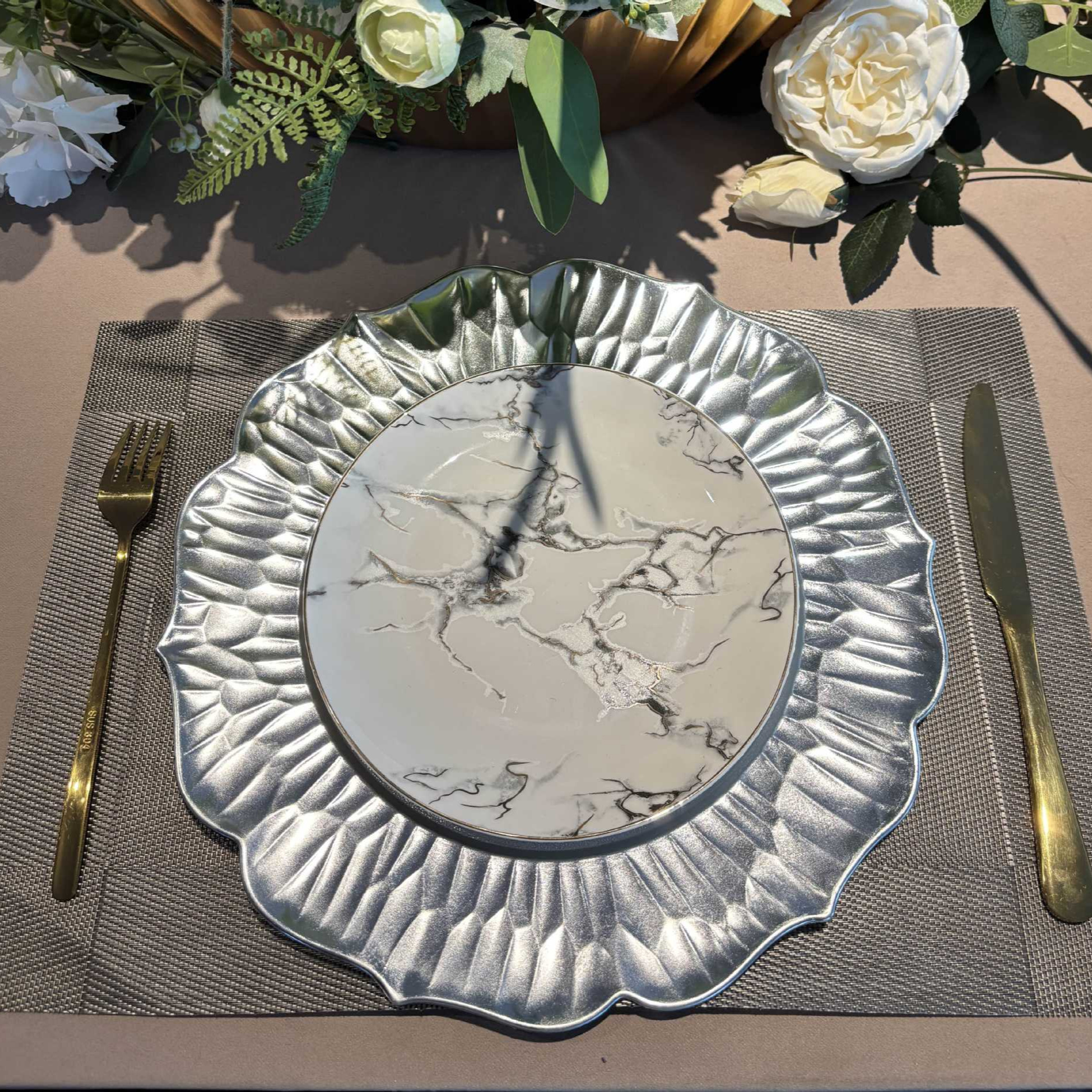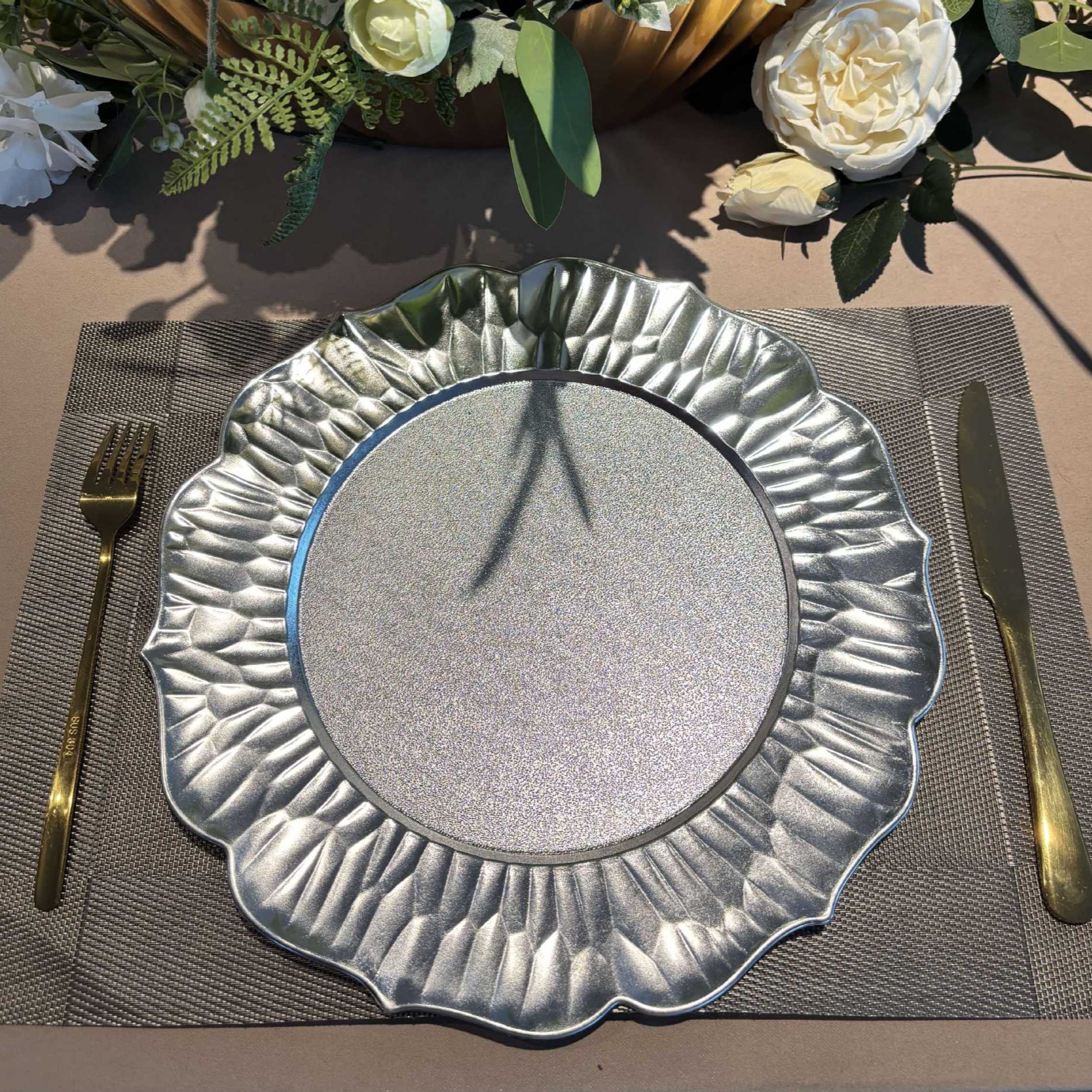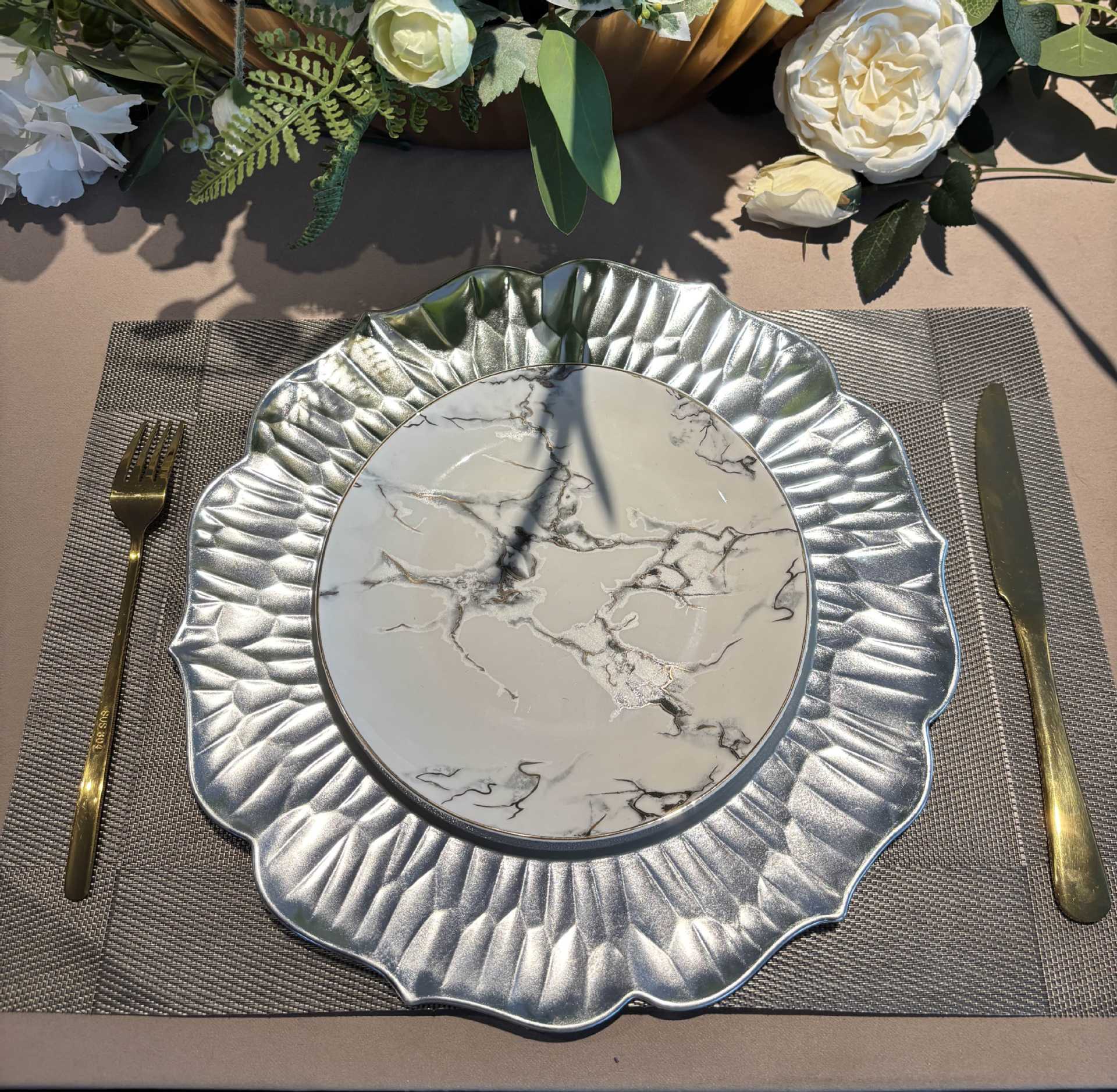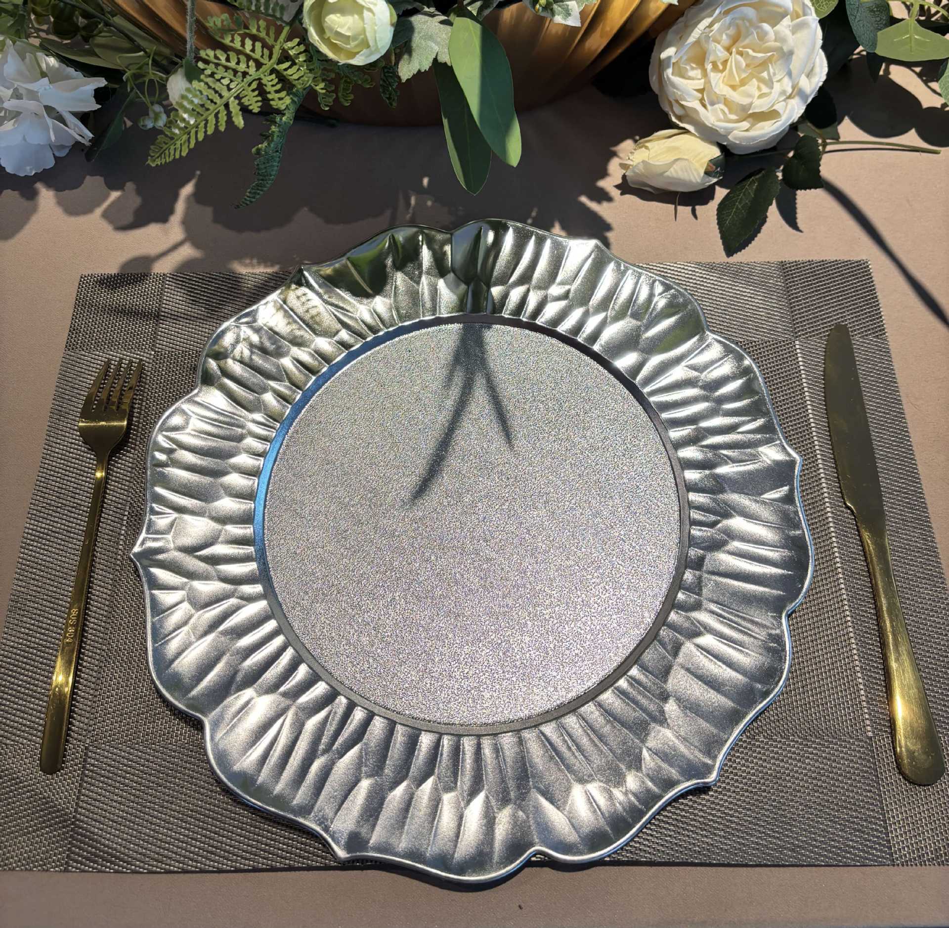 chargerplates欧式婚礼派对酒店晚宴花边莲花盘盘垫盘PP塑料餐具 English | 投诉