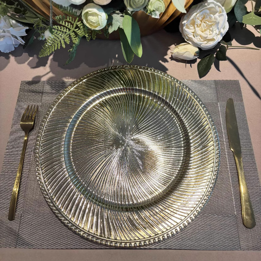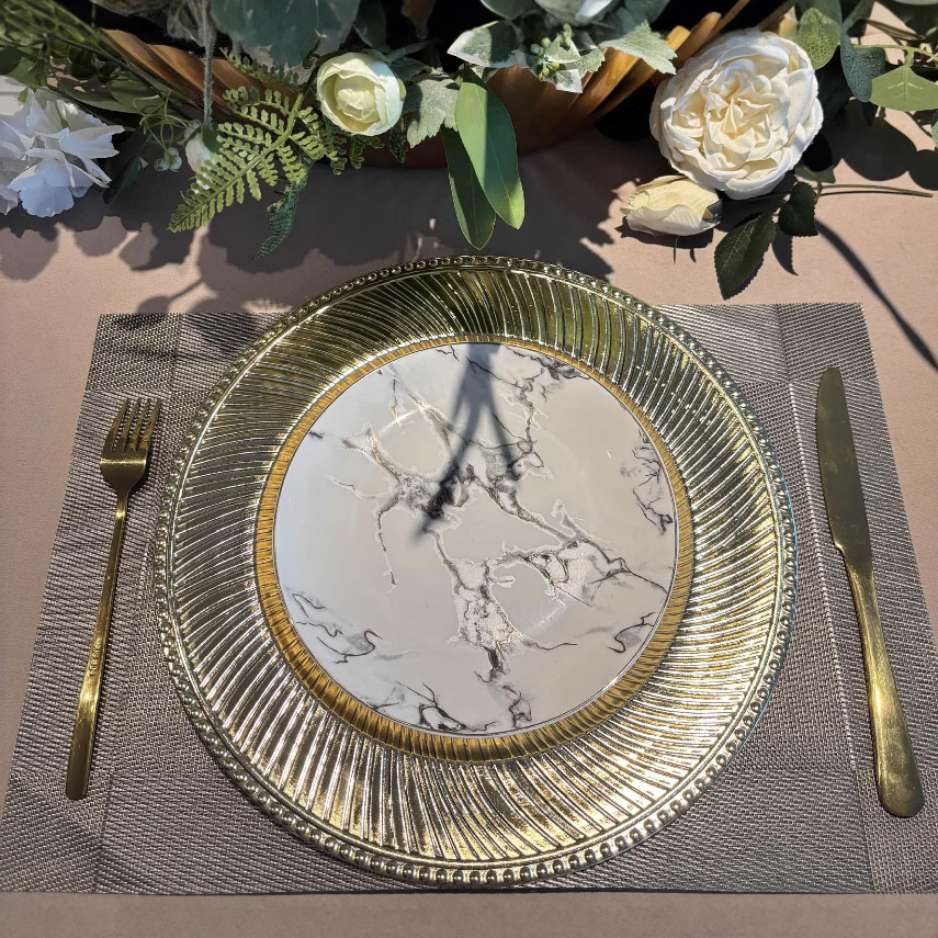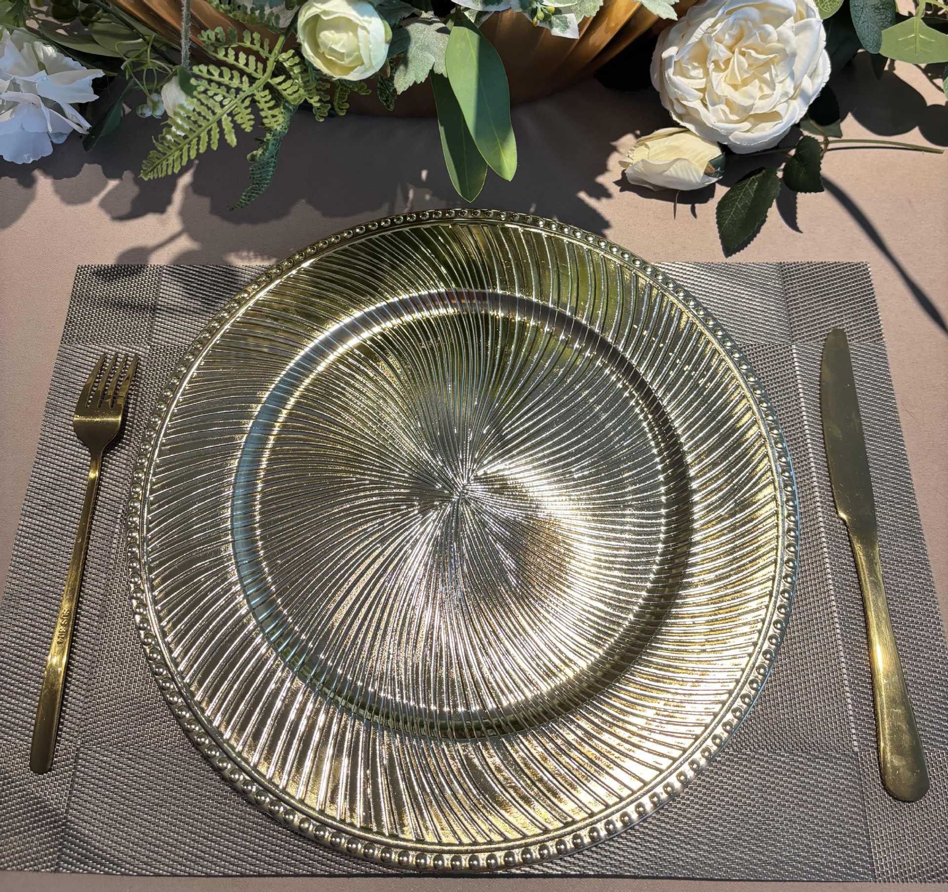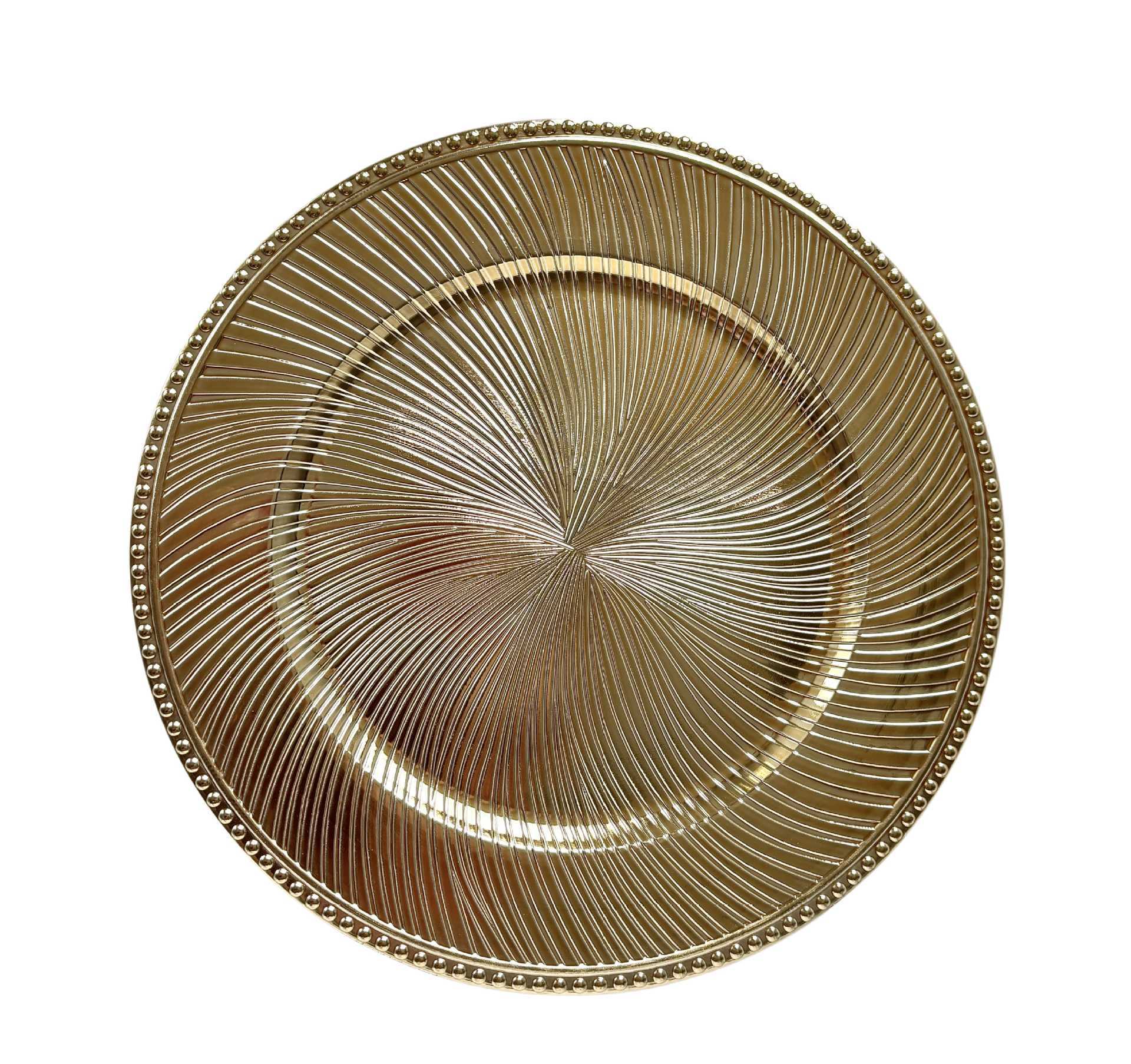 跨境charger plates欧式婚礼派对酒店晚宴珠边旋转盘盘垫盘PP塑料 English | 投诉