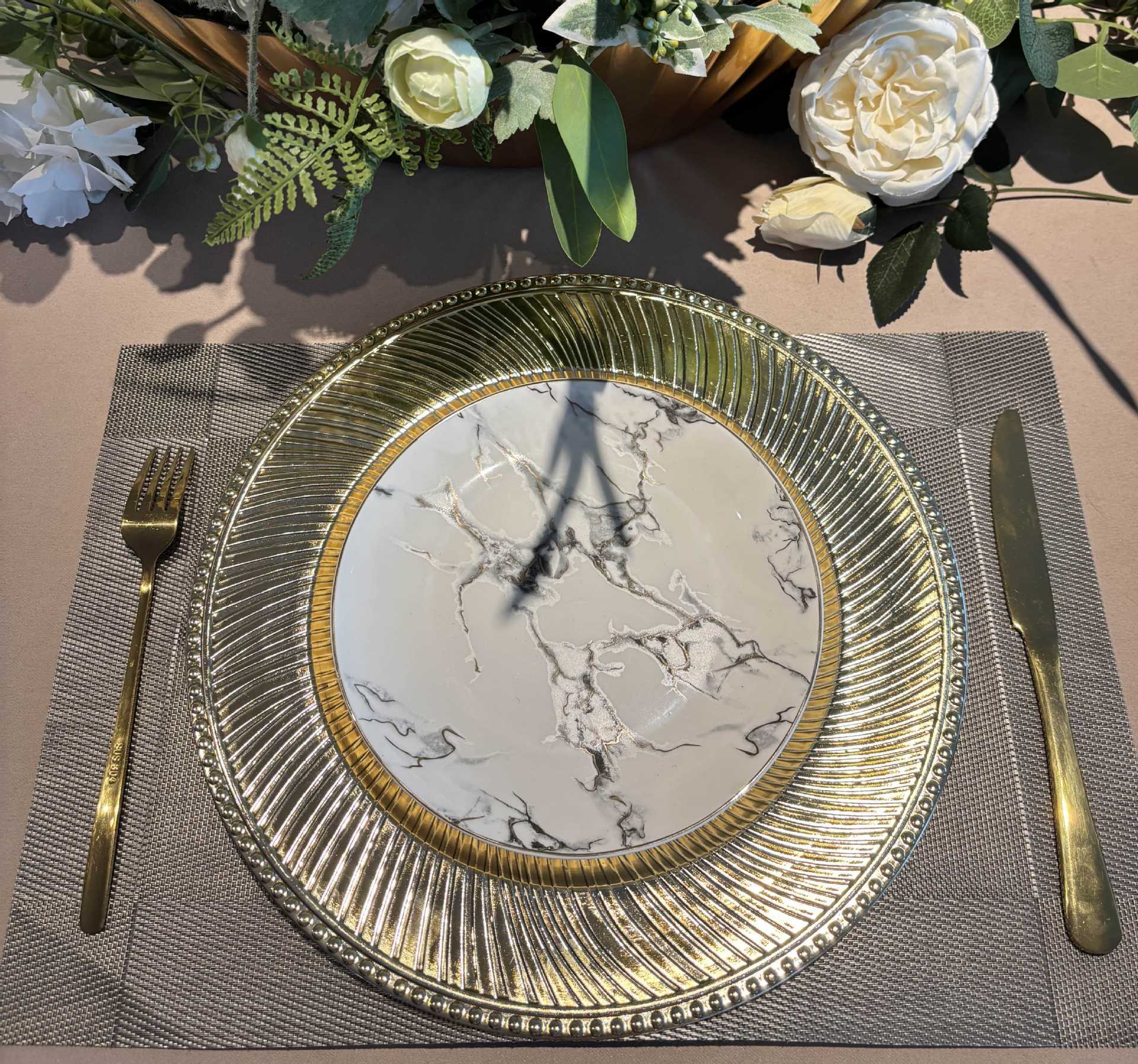 跨境charger plates欧式婚礼派对酒店晚宴珠边旋转盘盘垫盘PP塑料