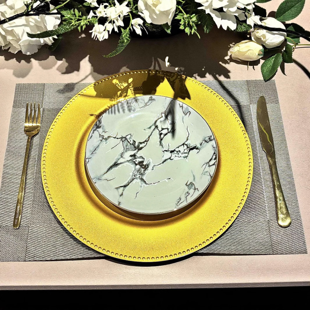 跨境charger plates欧式婚礼派对酒店晚宴小珠边盘垫盘PP塑料工厂