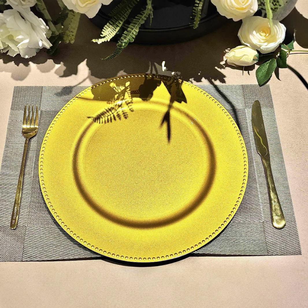 跨境charger plates欧式婚礼派对酒店晚宴小珠边盘垫盘PP塑料工厂 English | 投诉