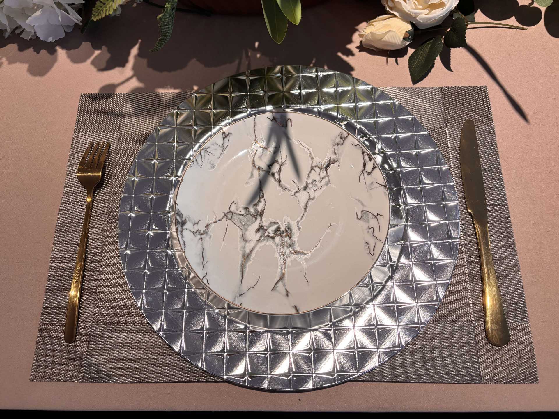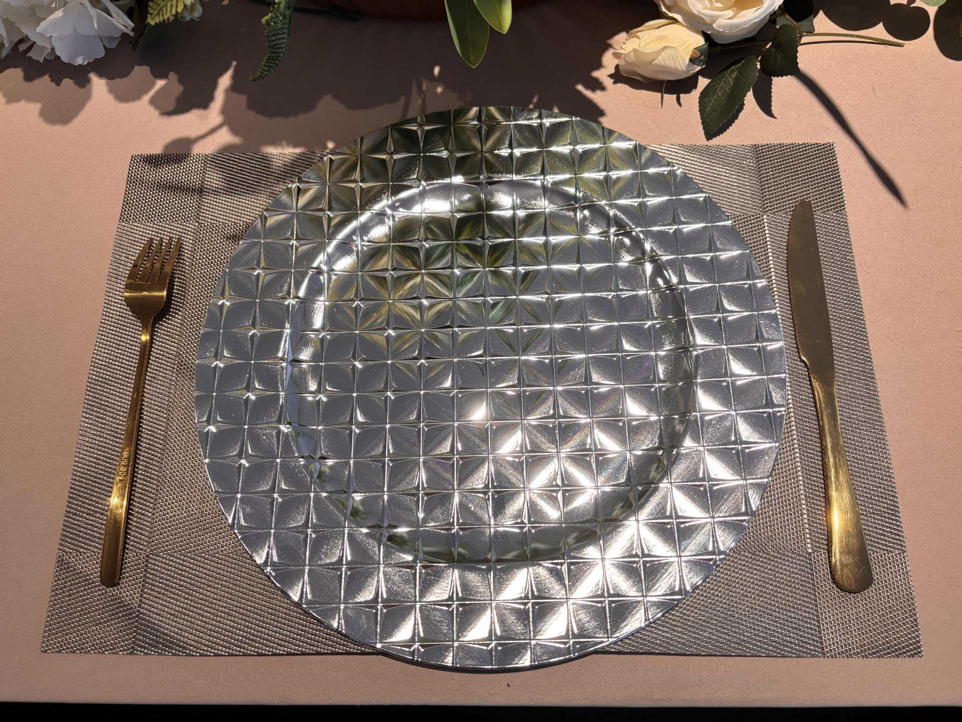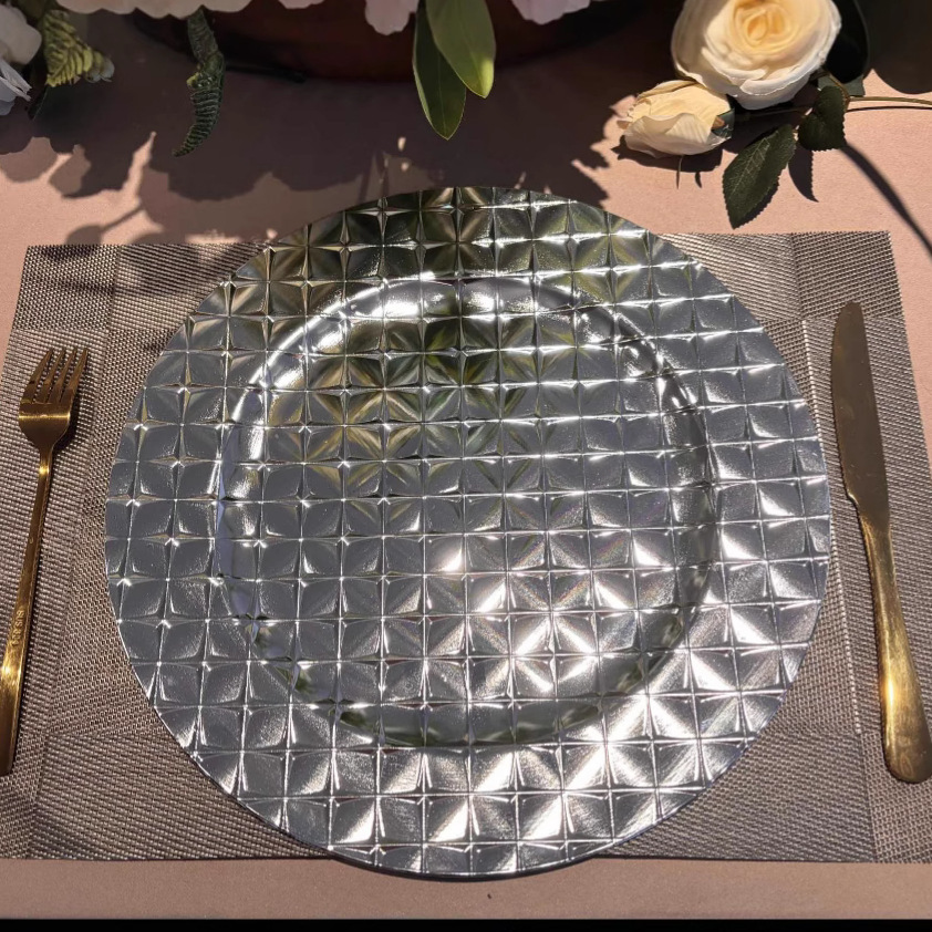 跨境charger plates欧式婚礼派对酒店晚宴方格满面盘盘垫盘PP塑料 English | 投诉