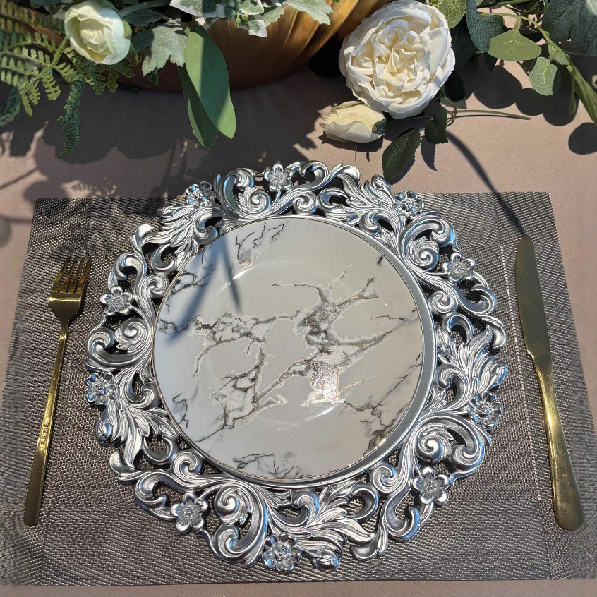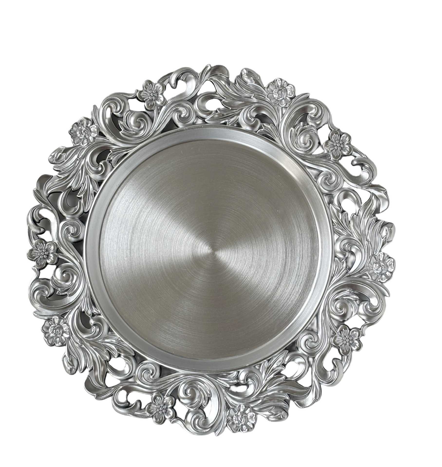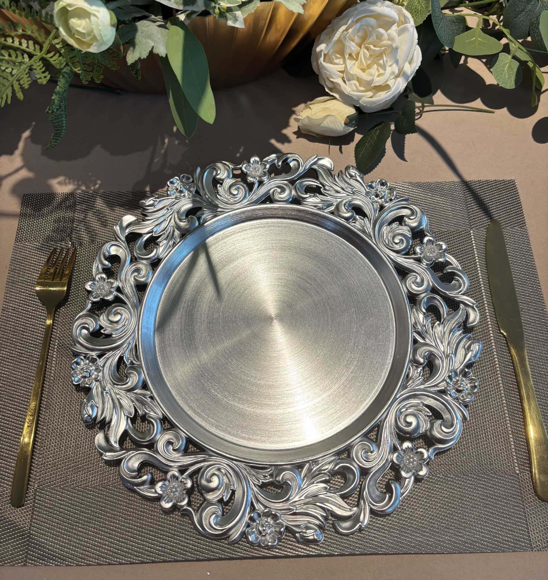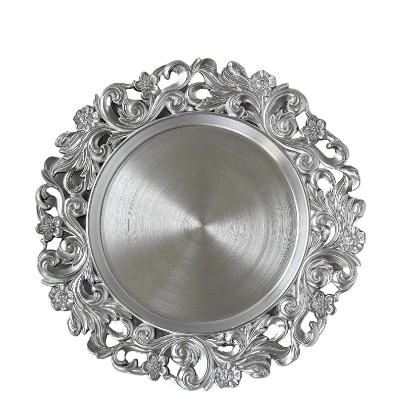 跨境工厂13英寸复古外贸婚礼酒店派对装饰塑料盘charger plate English | 投诉