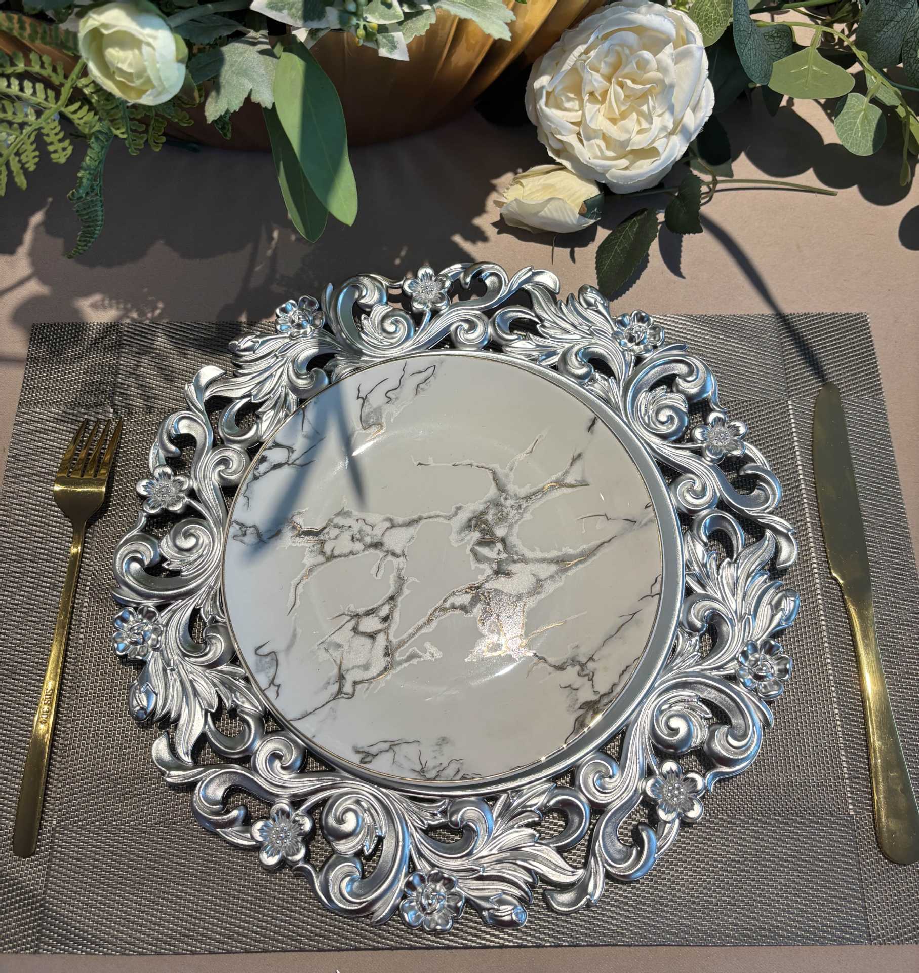 跨境工厂13英寸复古外贸婚礼酒店派对装饰塑料盘charger plate