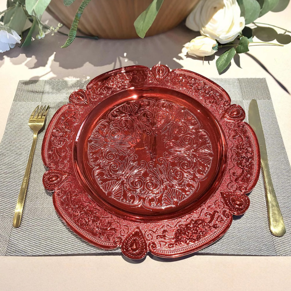 材质: 塑料 表面工艺: 电镀 产品质量等级: 合格品 品牌: 鑫泓泰工艺品 形状: 圆形 微波炉: 不可用 货号: 1 产品类别: 装饰盘 是否进口: 否 适用人群: 通用 图案: 花卉 风格: 现代简约 适用场景: 酒店,饭菜,喝咖啡,喝茶,其他 加印LOGO: 可以 加工定制: 可以 产品上市时间: 2025.5.22 价格段: 5元以内 适用对象: 通用 是否有专利: 否 颜色: 酒红色 重量: 1.0 kg/片