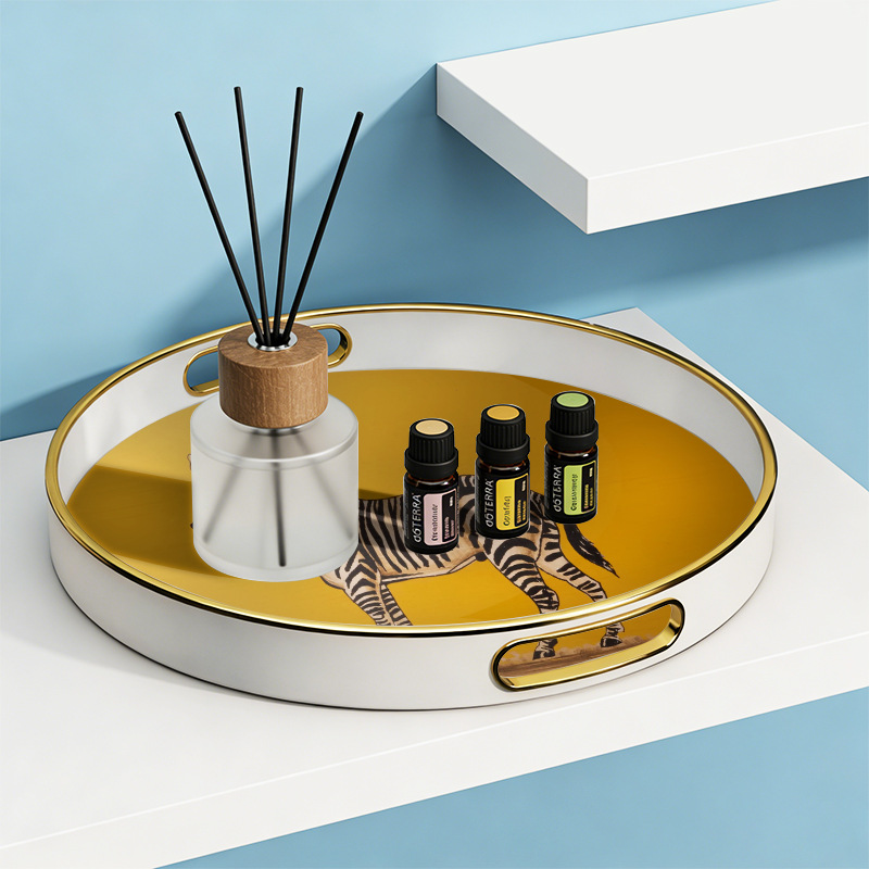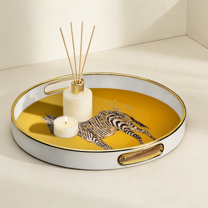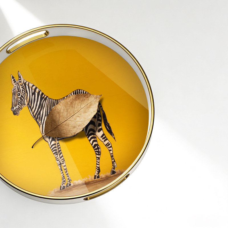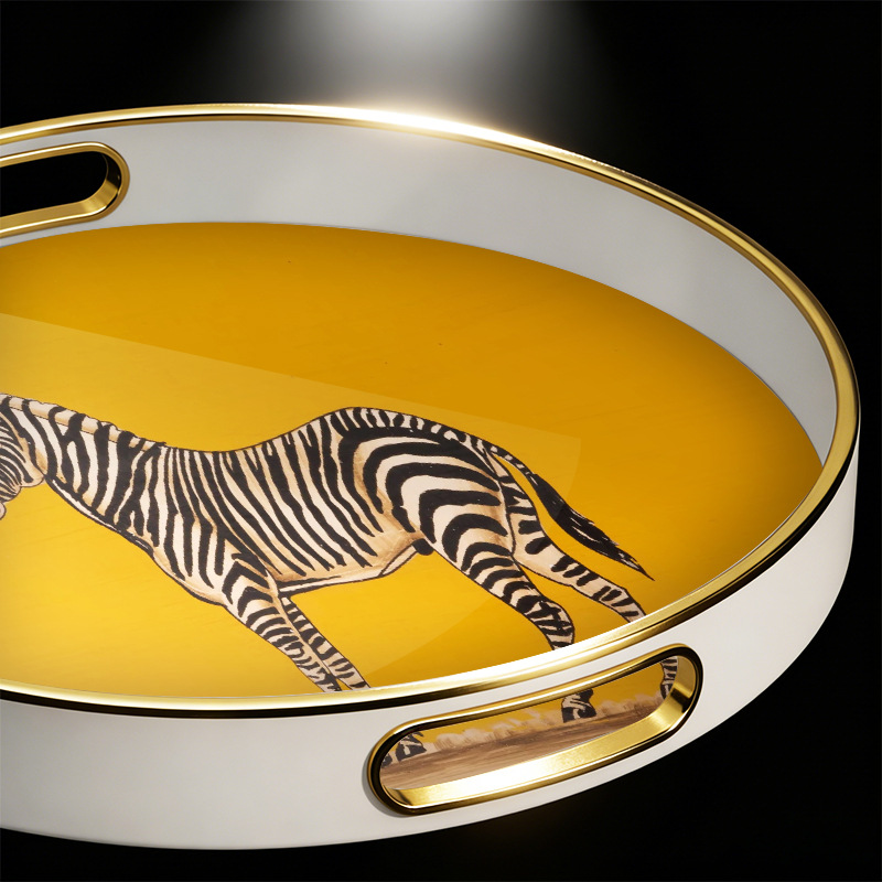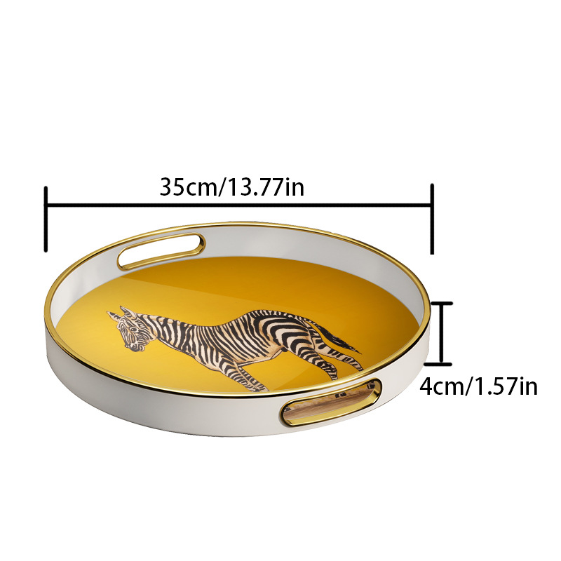 批发轻奢斑马纹圆形托盘 带把手家用置物盘 商用餐厅点心盘首饰 English | 投诉