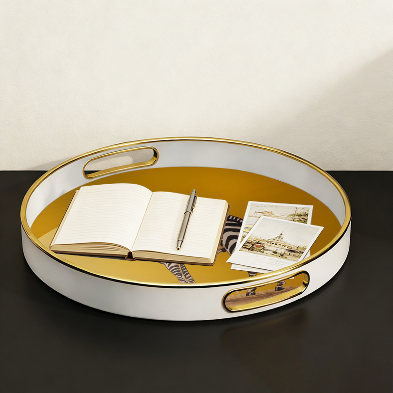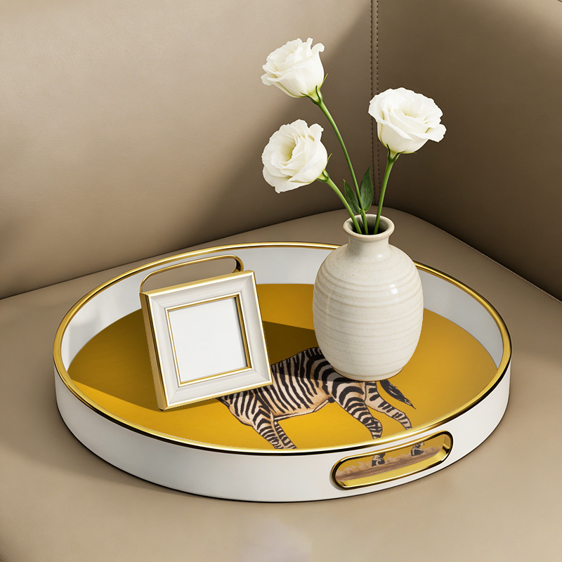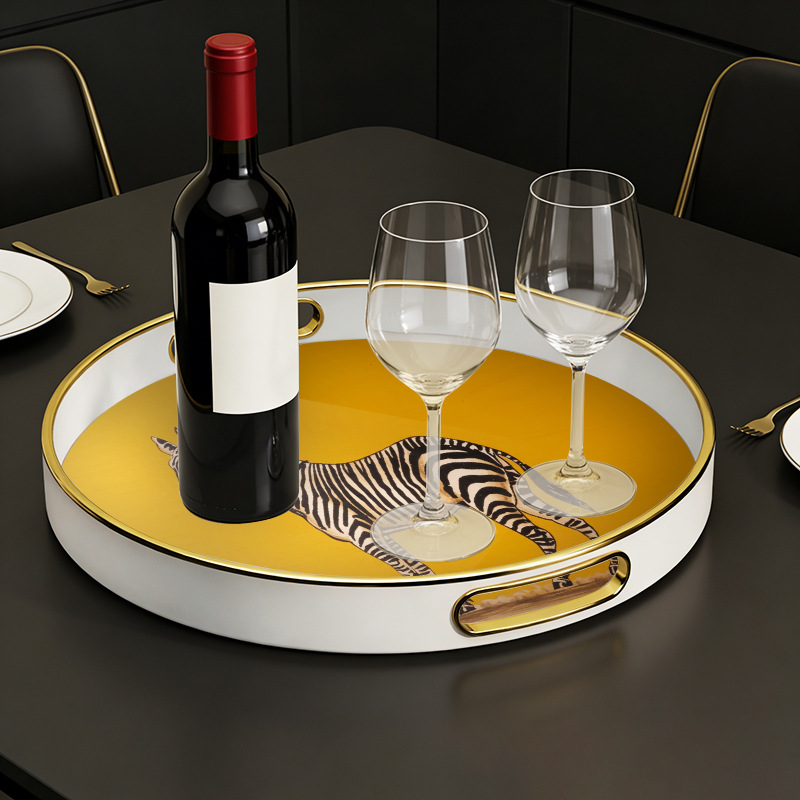 批发轻奢斑马纹圆形托盘 带把手家用置物盘 商用餐厅点心盘首饰