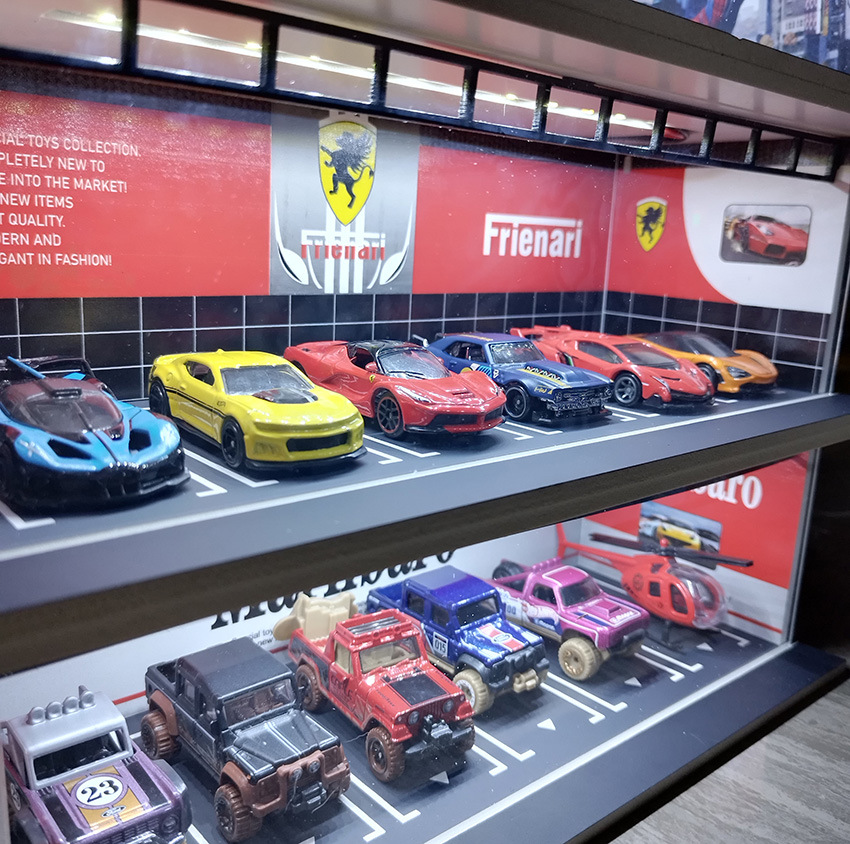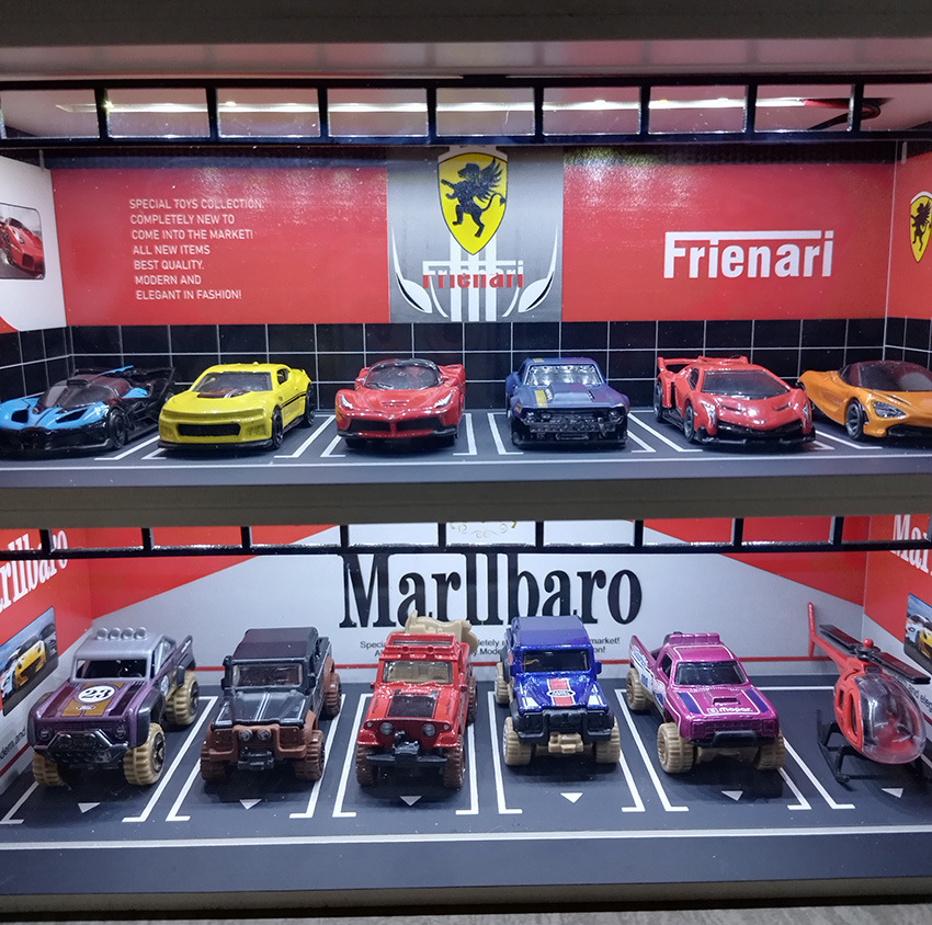 【产品名称】:1:64仿真停车场模型场景停车库带灯6车位车模展示架(多款可选可混)