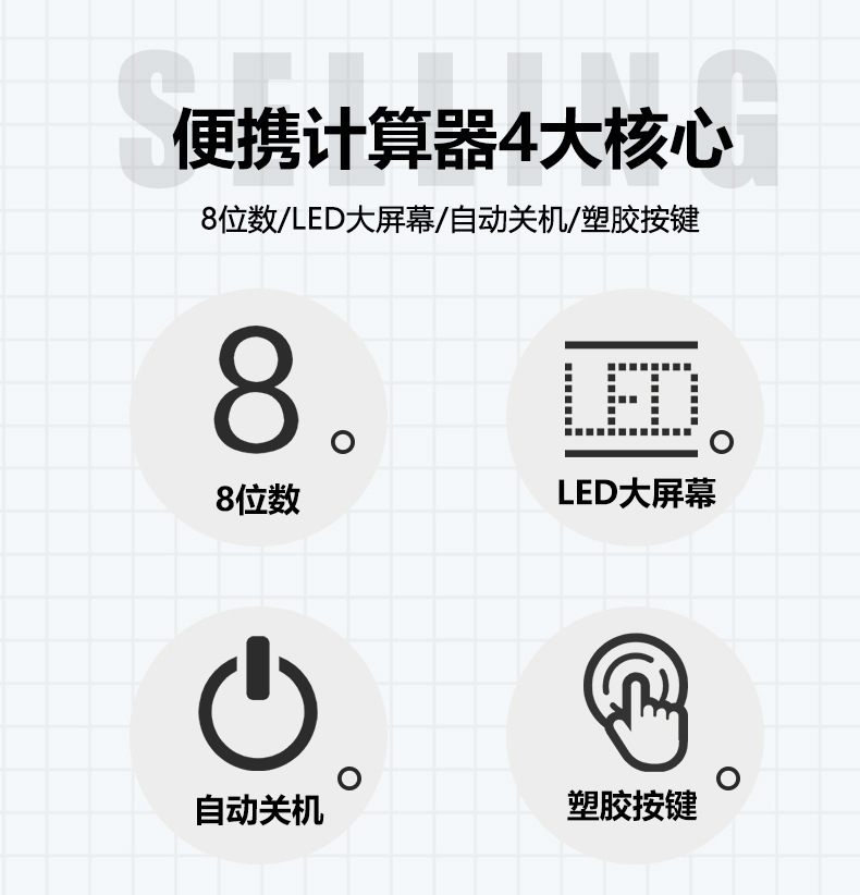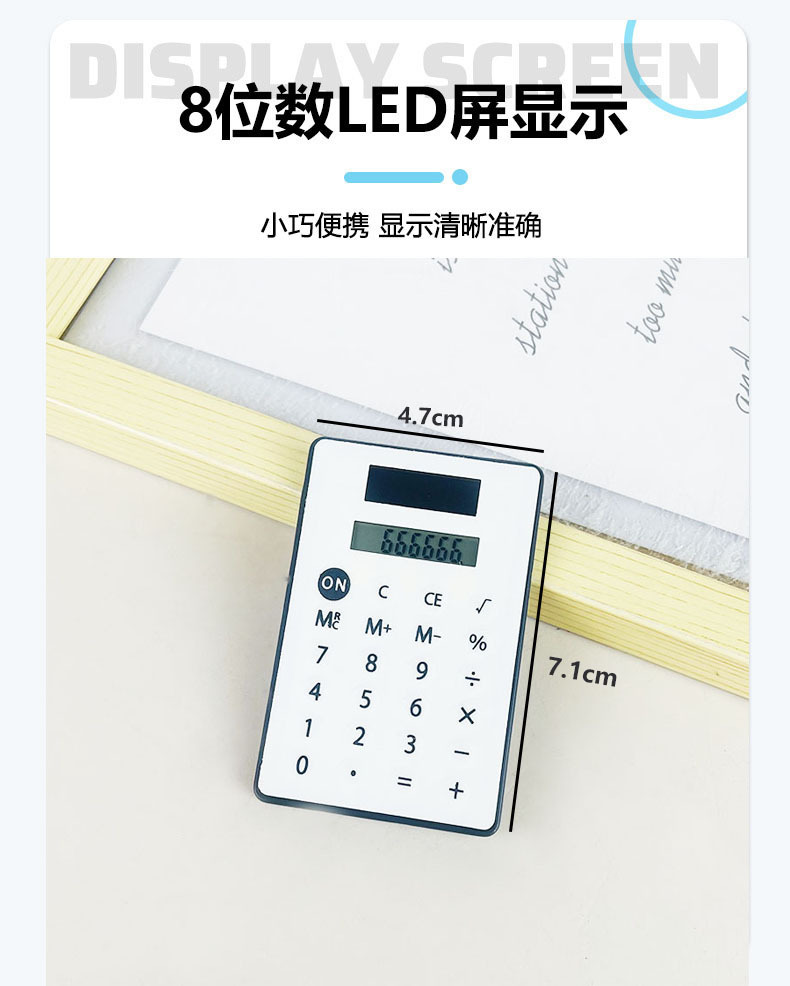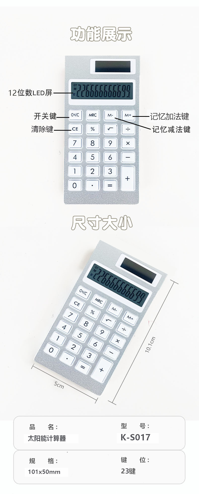 品牌: 其它 产品类型: 算数计算器 是否带电池: 否 材质: 塑料 是否带语音功能: 否 适配电池: 太阳能 货号: 太阳能计算器 一件是一个 型号: KS-017 规格: 12位数-白色,8位数 白色 加印LOGO: 可以 加工定制: 是 显示位数: 12 净重: 25 是否进口: 否 主要下游平台: ebay,亚马逊,wish,速卖通,LA 主要销售地区: 非洲,欧洲,南美,东南亚,北美,东北亚, 有可授权的自有品牌: 否 是否跨境出口专供货源: 是 是否属于礼品: 否 重量: 0.025 kg/个