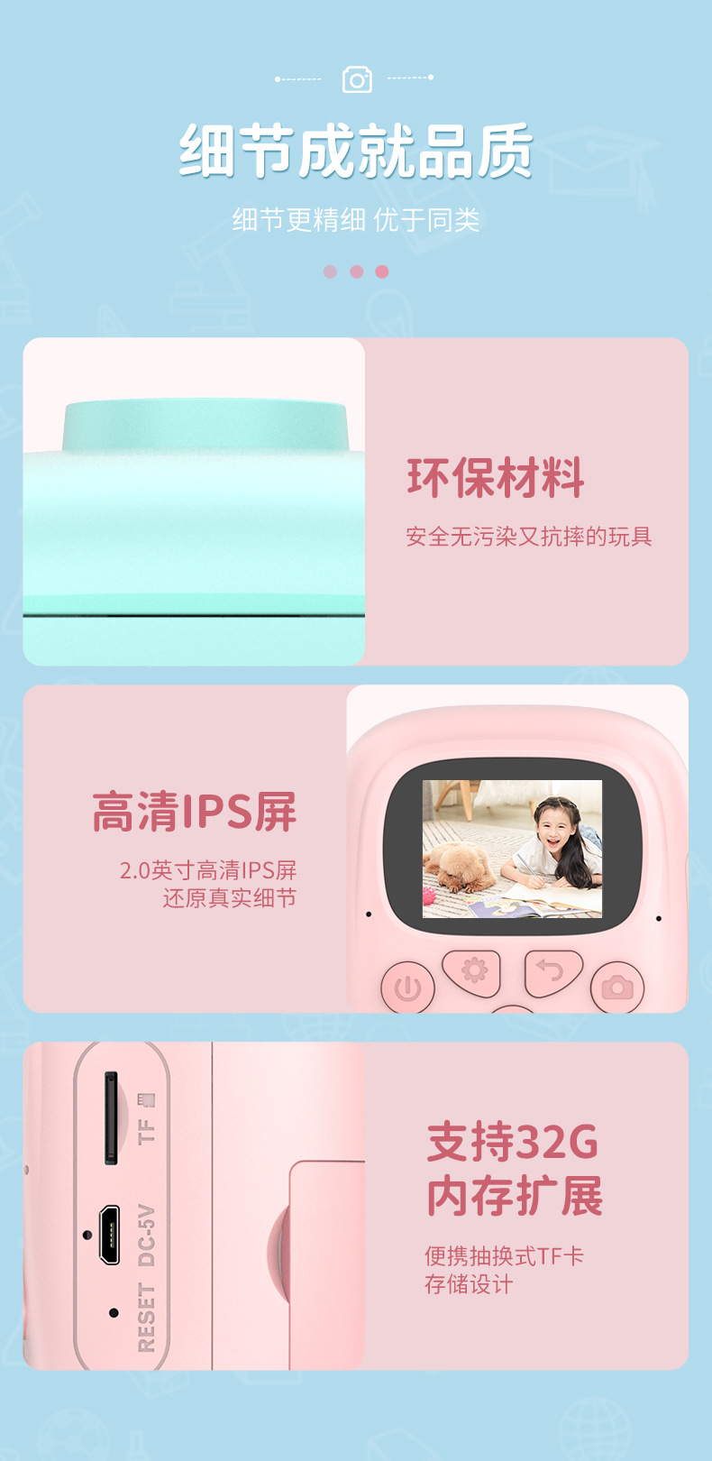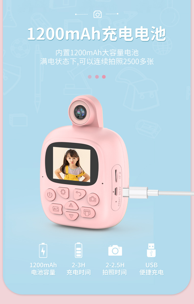 功能: 游戏,定时,大头贴,录像,拍照,打印照片 像素范围: 2400W 品牌: 中性 存储介质: 自身 电池续航能力: 2小时 机身材质: 环保材料 货号: T0 型号: T10 液晶屏尺寸: 2寸 货源类别: 现货 是否支持一件代发: 支持 是否支持混批: 支持 上市时间: 2023 包装清单: 1 颜色: 粉色,蓝色,粉红色(A20),天蓝色(A 主要下游平台: ebay,亚马逊,wish,速卖通,独立 主要销售地区: 非洲,欧洲,南美,东南亚,北美,东北亚, 是否跨境出口专供货源: 是 人群: 儿童 装箱数: 120 重量: 0.15 kg/台